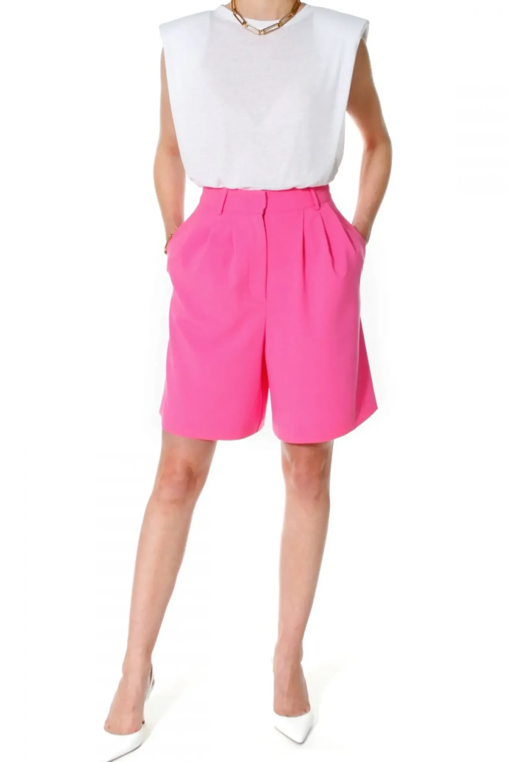 Szerokie Szorty/Bermudy Z Zakladkami Dodajacymi Przestrzeni I Kobiecego Charakteru Projektowi. Wysoki Stan Podkreslajacy Talie. W Szwach Bocznych Ukryte Wygodne Kieszenie.