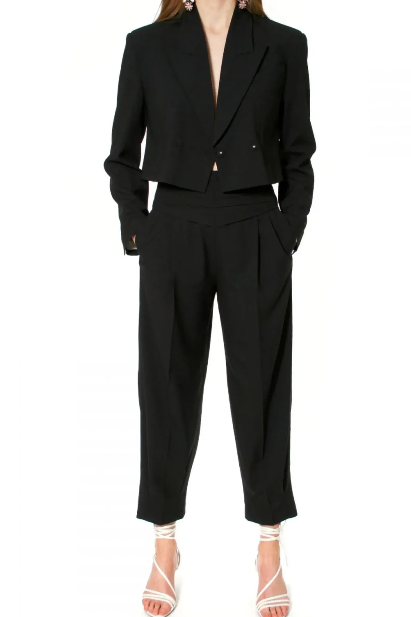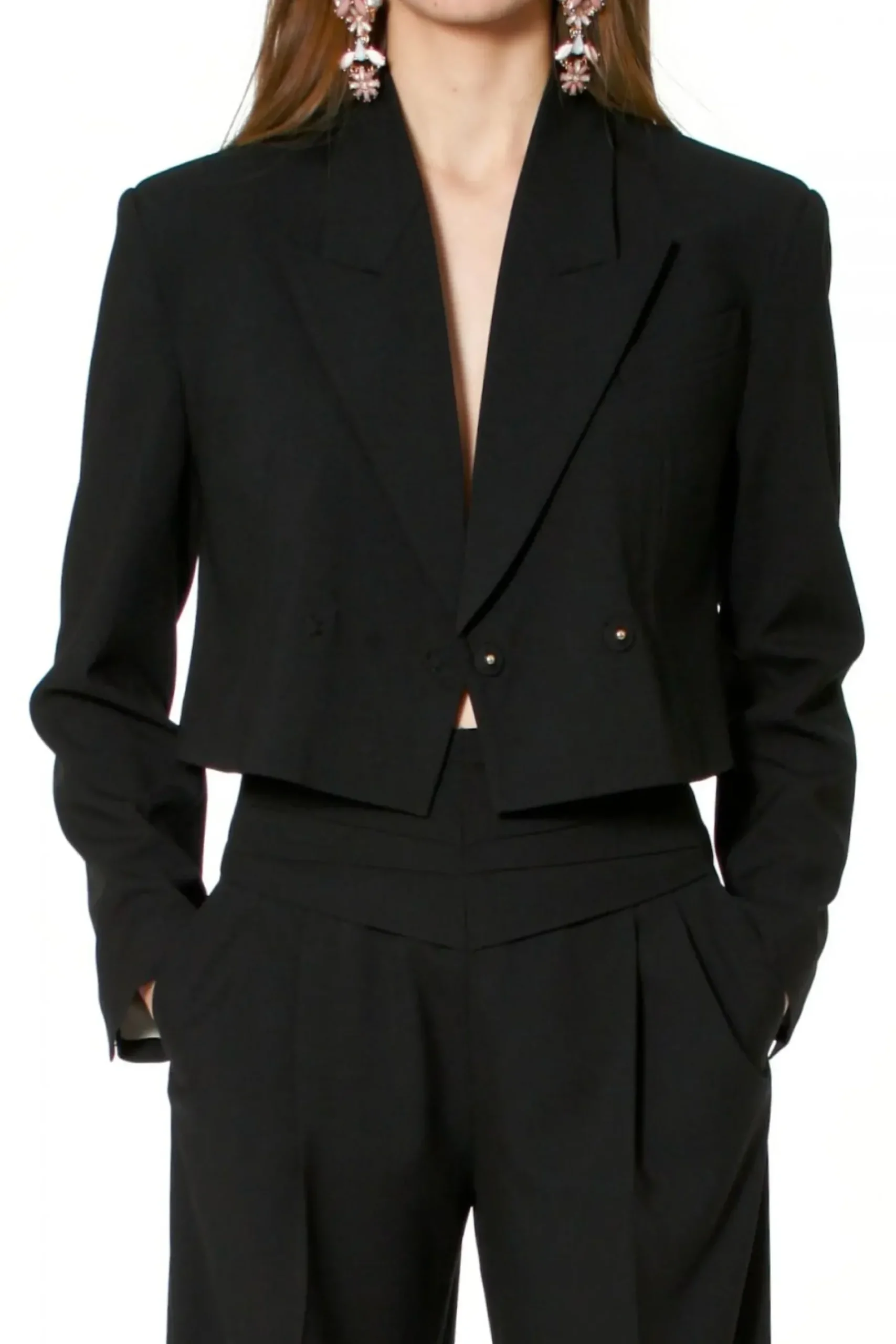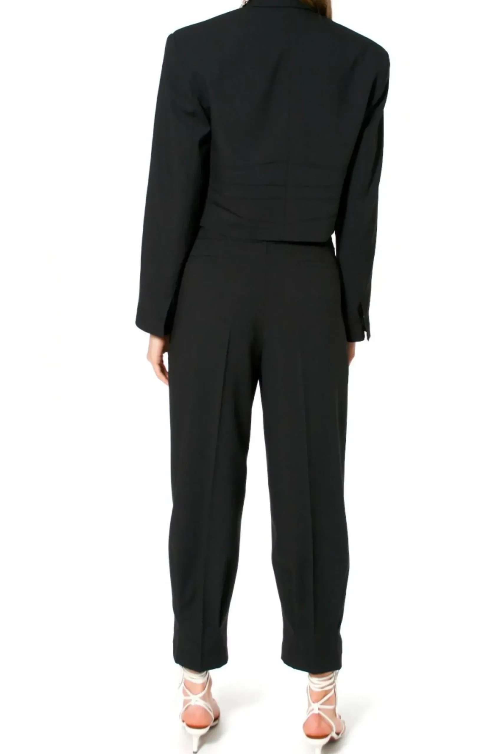Krotka, Dwurzedowa Marynarka Z Szerokimi Klapami. Z Tylu Ozdobne, Misterne Plisowanie Nadajace Projektowi Unikatowego Charakteru.