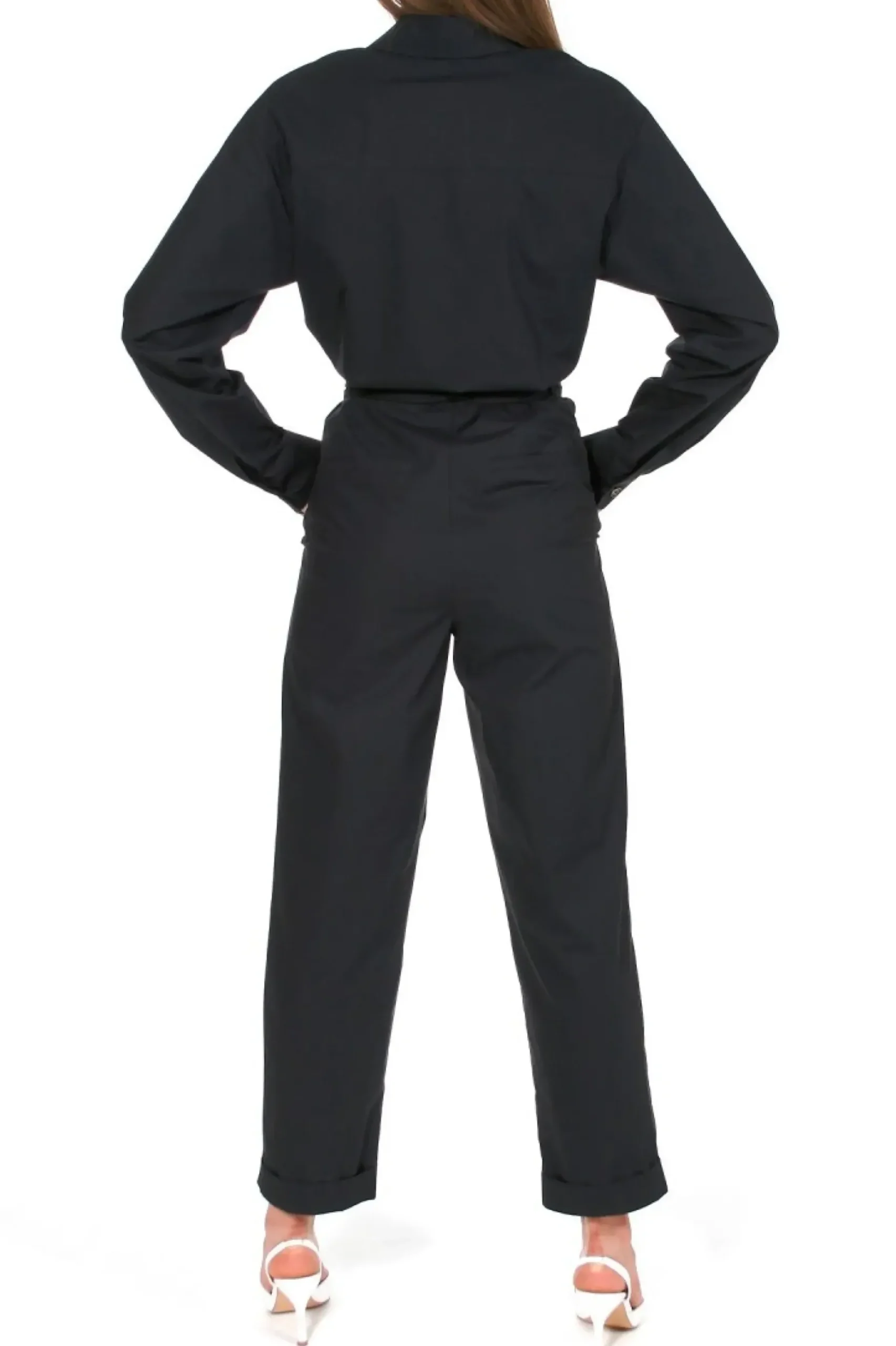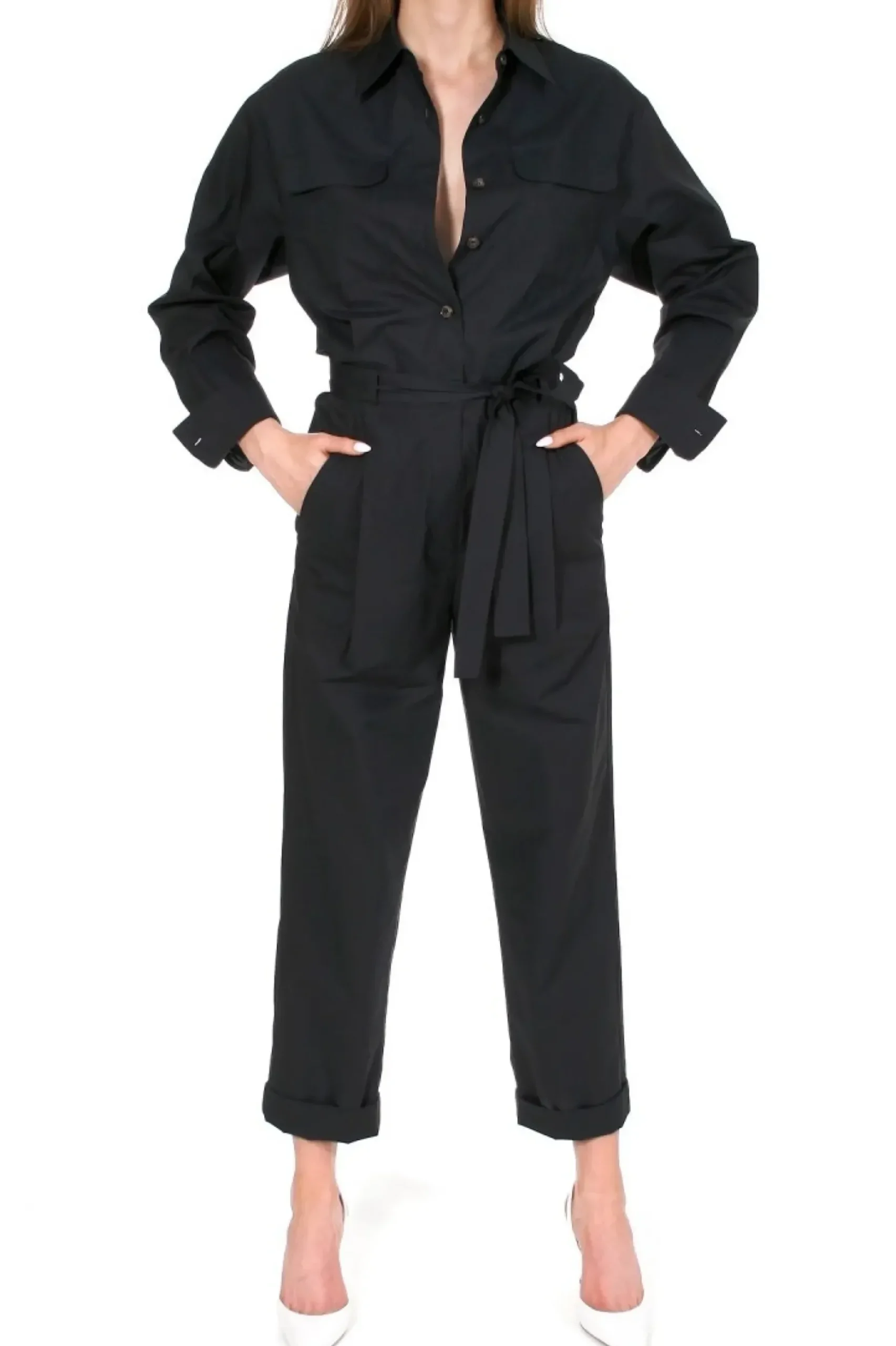 Kombinezon Utility Uszyty Z Lekko Sztywnej Bawelny O Papierowym Chwycie. Oversizowa Linia Modelu Nadaje Projektowi Nonszalancji I Sklania Do Roznych Wariacji Stylizacyjnych. Koszulowa Gora Z Duzymi Nakladanymi Kieszeniami Zapinana Na Szylkretowe Guziki. Czesc Spodniowa Z Glebokimi Kieszeniami. Luzne Nogawki Wykonczone Mankietem Daja Mozliwosc Podwiniecia I Skrocenia. W Talii Szlufki I Wiazany Pasek. Swietnie Komponuje Sie Z Botkami Kowbojskimi, Pantoflami Na Kaczuszce I Z Klasycznymi Sandalami Na Wysokiej Szpilce.