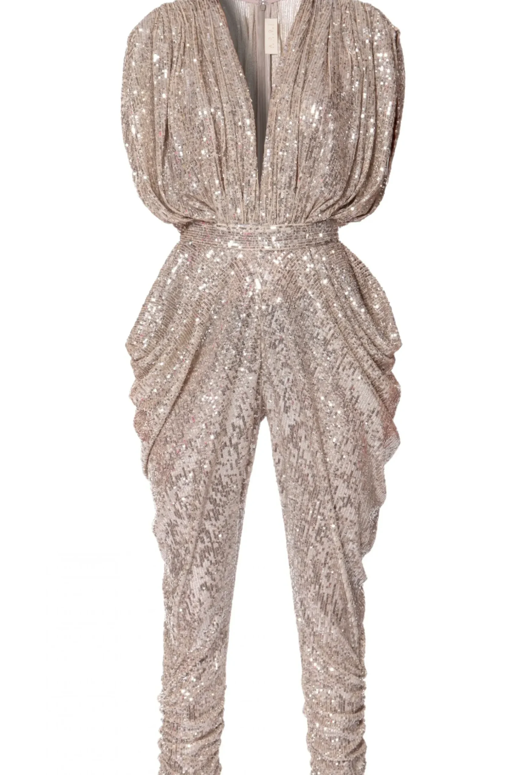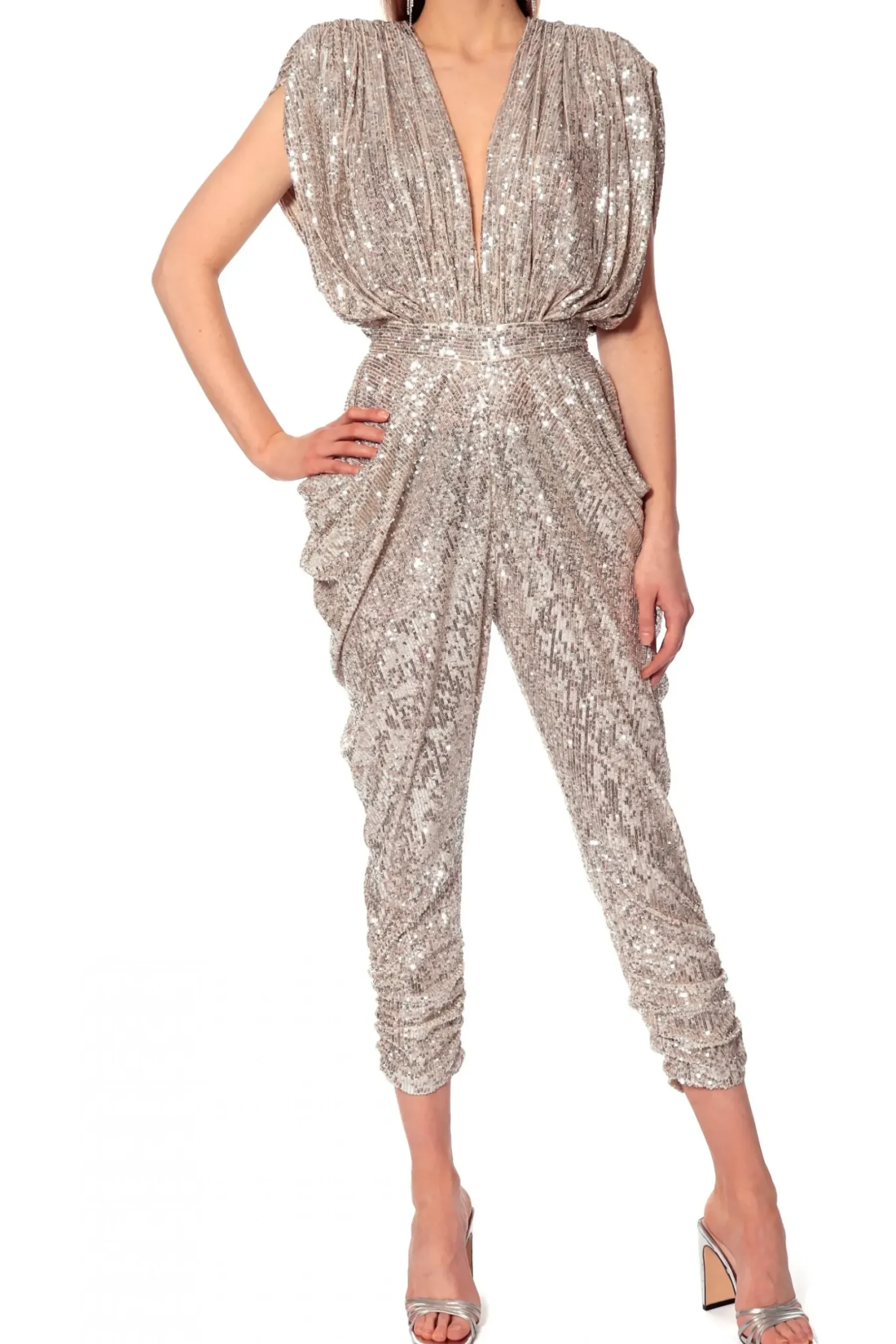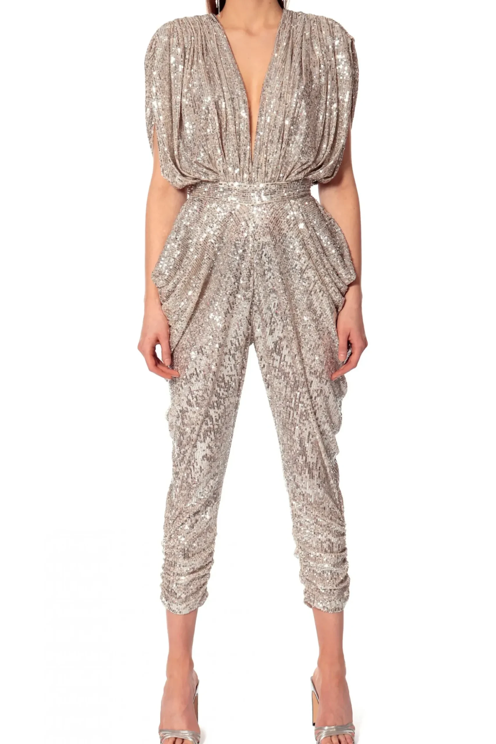 Kombinezon Wieczorowy Wyszywany Drobnymi Cekinami. Projekt Inspirowany Klimatem Disco Lat 80-Tych. Oversizowa Gora Mocno Marszczona Na Ramionach Z Odwaznym, Zmyslowym Dekoltem. Ramiona Dodatkowo Podkreslone Wszytymi Poduszkami. W Talii Wszyty Dopasowany Pasek Kontrastujacy Z Przestrzenia Drapowanej Gory Oraz Czesci Spodniowej. Nogawki Bogato Drapowane Na Biodrach, Zwezajace Sie Ku Dolowi. Dol Nogawek Podrzucony Przez Dodatkowe Podluzne Marszczenia. Z Tylu Zapinanie Na Zamek Blyskawiczny. Projekt Zestaw Ze Sandalami Lub Botkami Na Wysokiej Szpilce.
