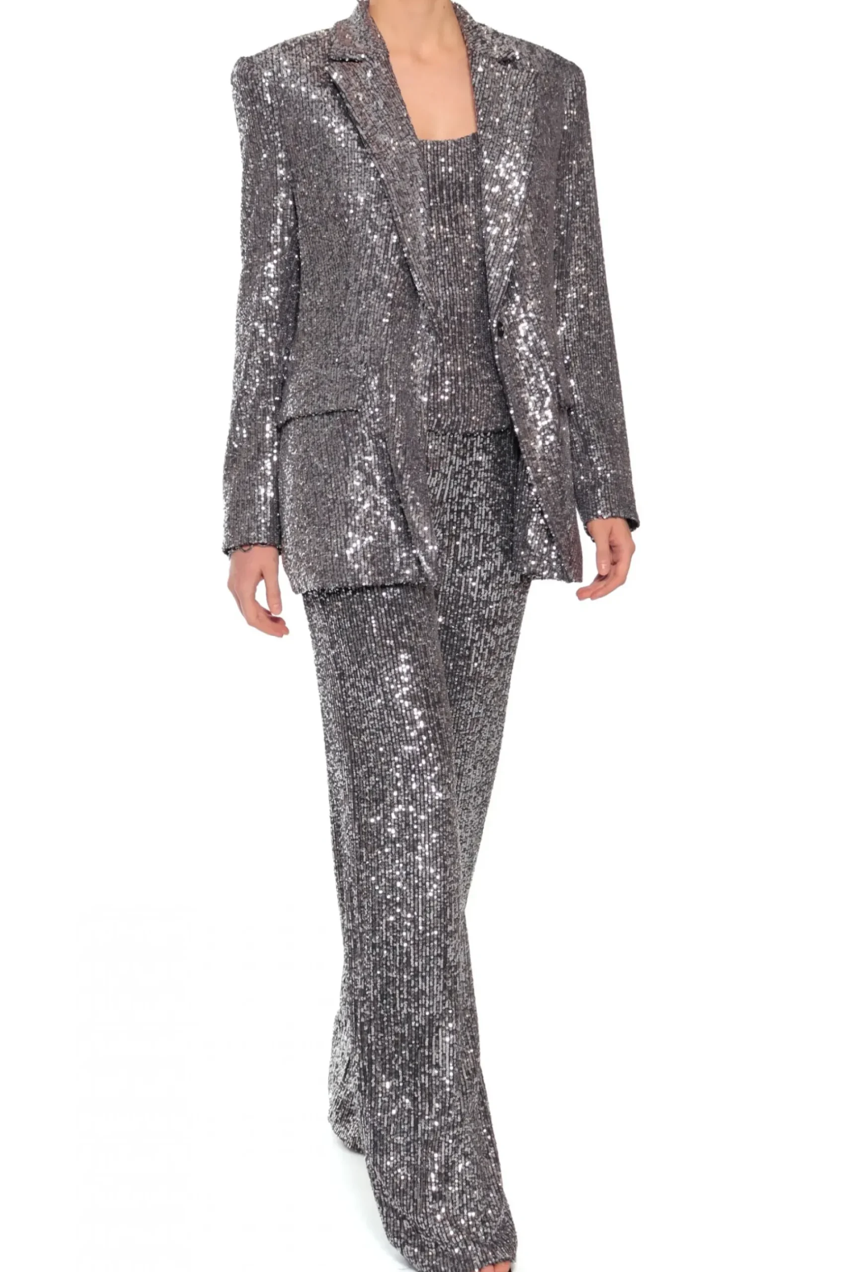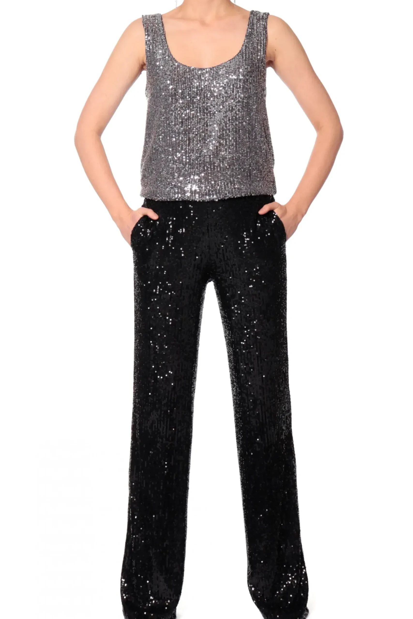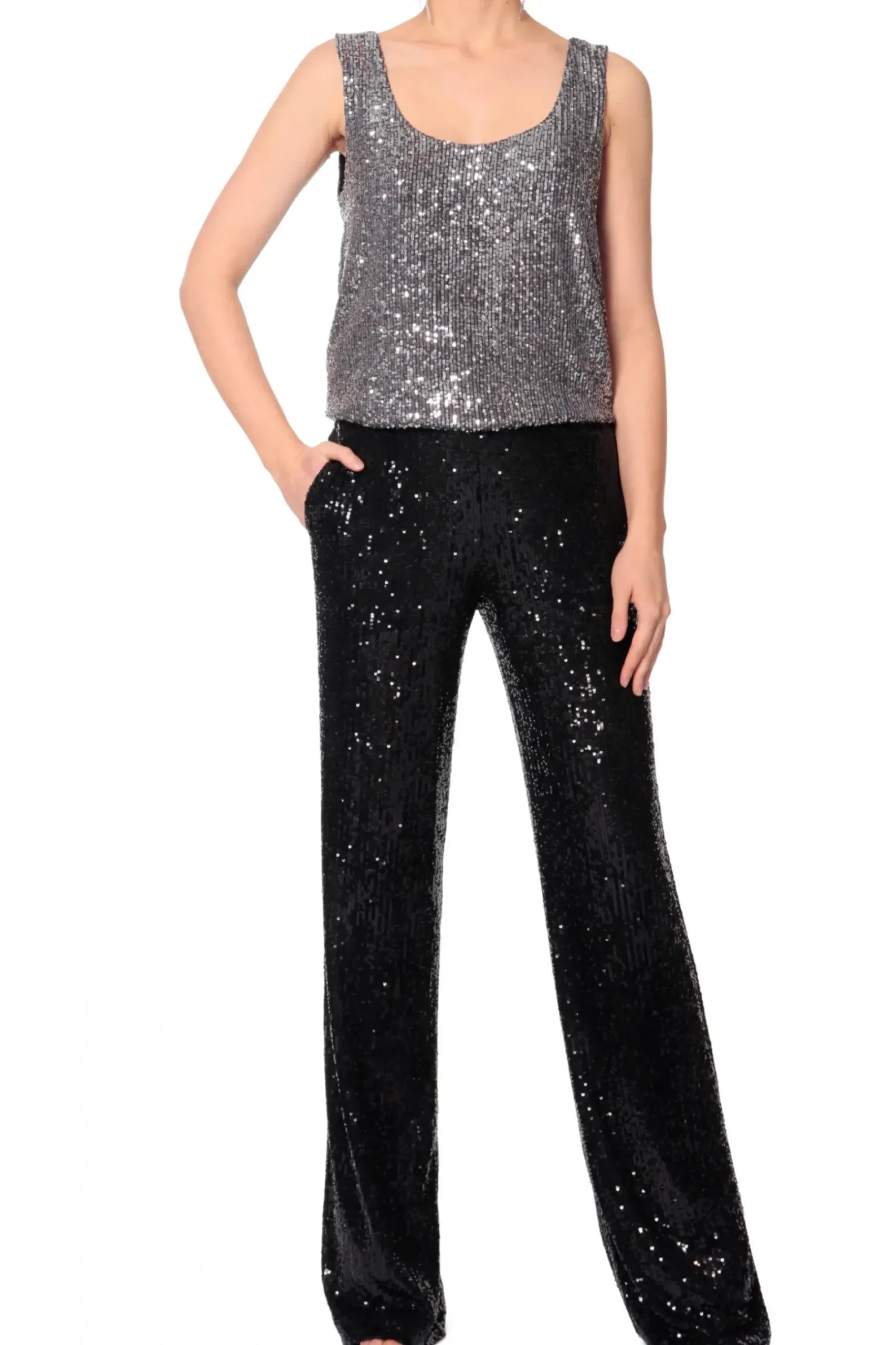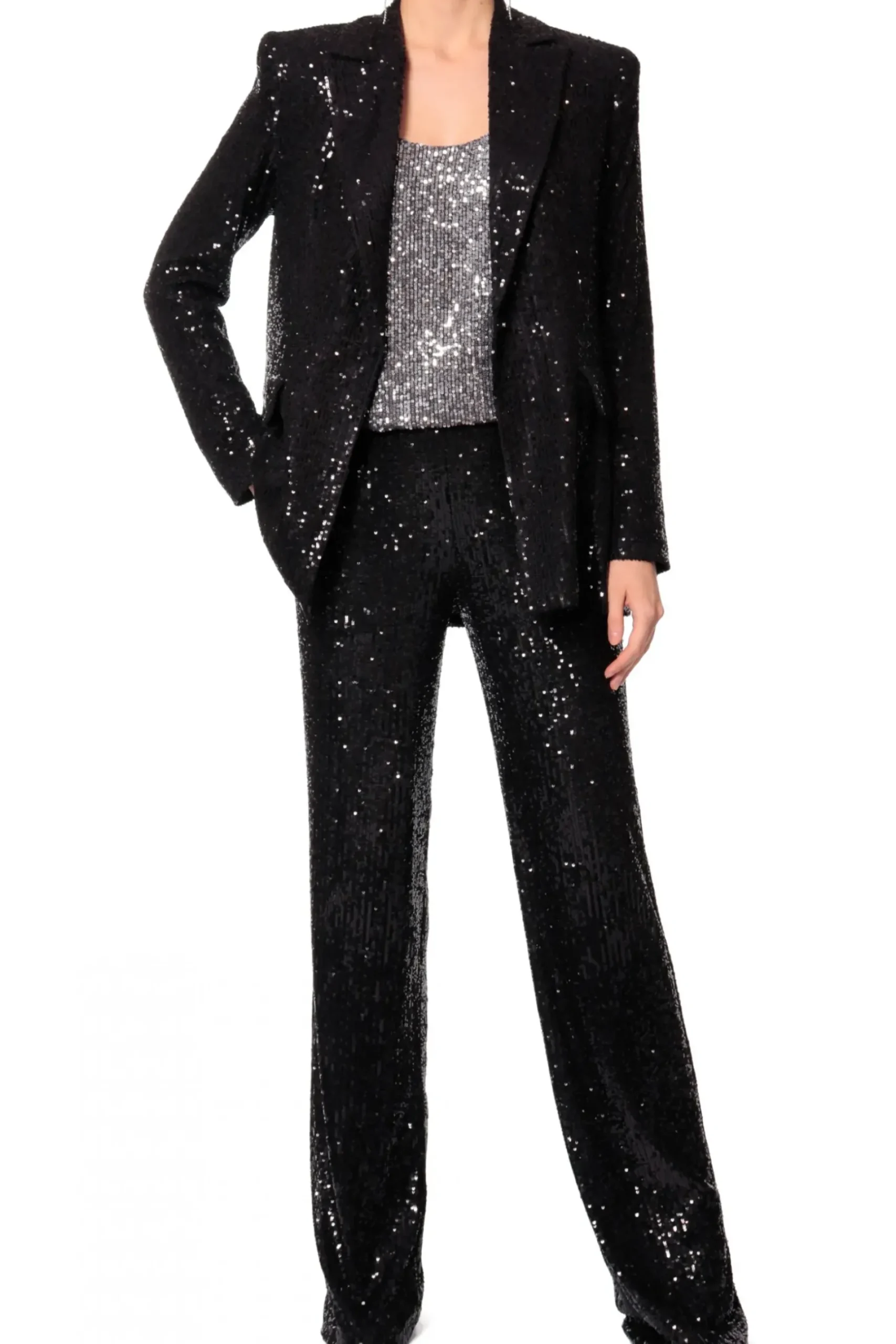 Dopasowany Crop Top Na Ramiaczkach Wykonany Z Materialu Wyszywanego Drobnymi Cekinami. Profilowany Fiszbinami Front Delikatnie Podkresla Biust. Zapinany Z Tylu Na Zamek. Z Cekinowymi Spodniami Luca Lub Olympe Obsidian Black Stworzy Idealny Look Na Sylwestra Lub Zabawe Karnawalowa. Do Dopelnienia Kreacji Nos Z Marynarka Luna Obsidian Black Oraz Wysokimi Szpilkami