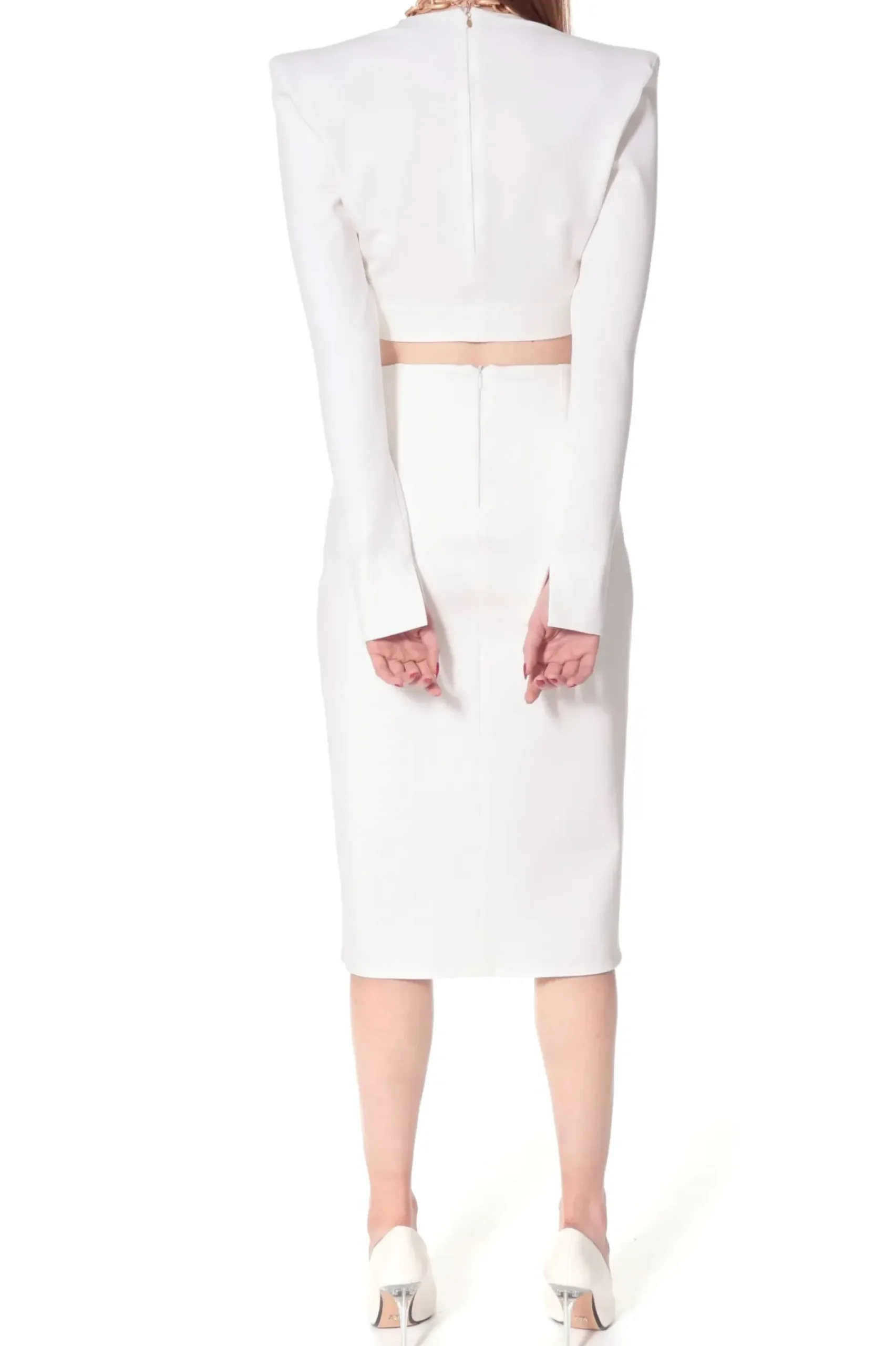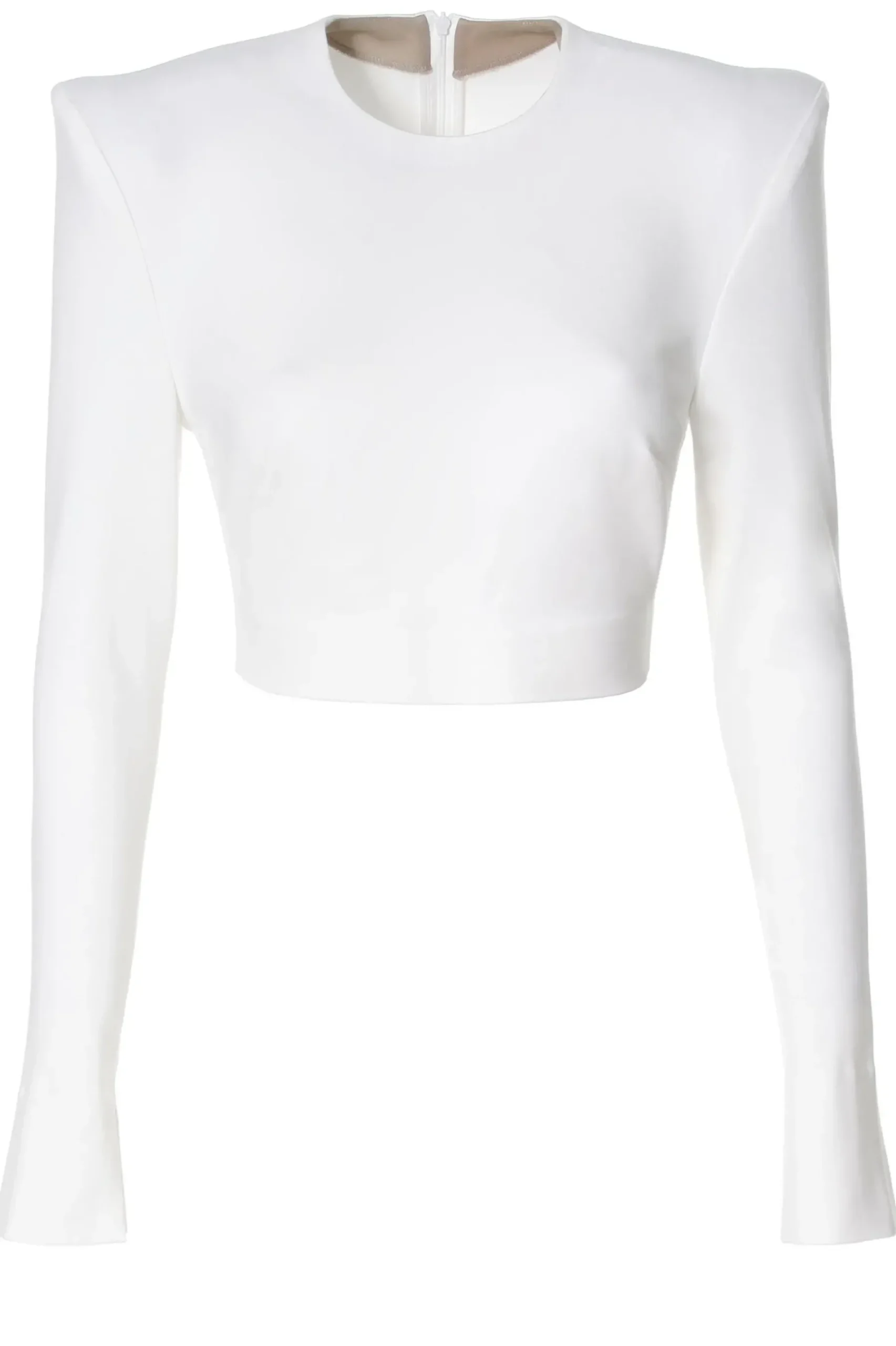 Crop Top Z Dlugimi Dopasowanymi Rekawami Z Peknieciami Na Nadgarstkach. Mocno Zaakcentowane Ramiona, Zapinany Na Karku Na Kryty Zamek Blyskawiczny.