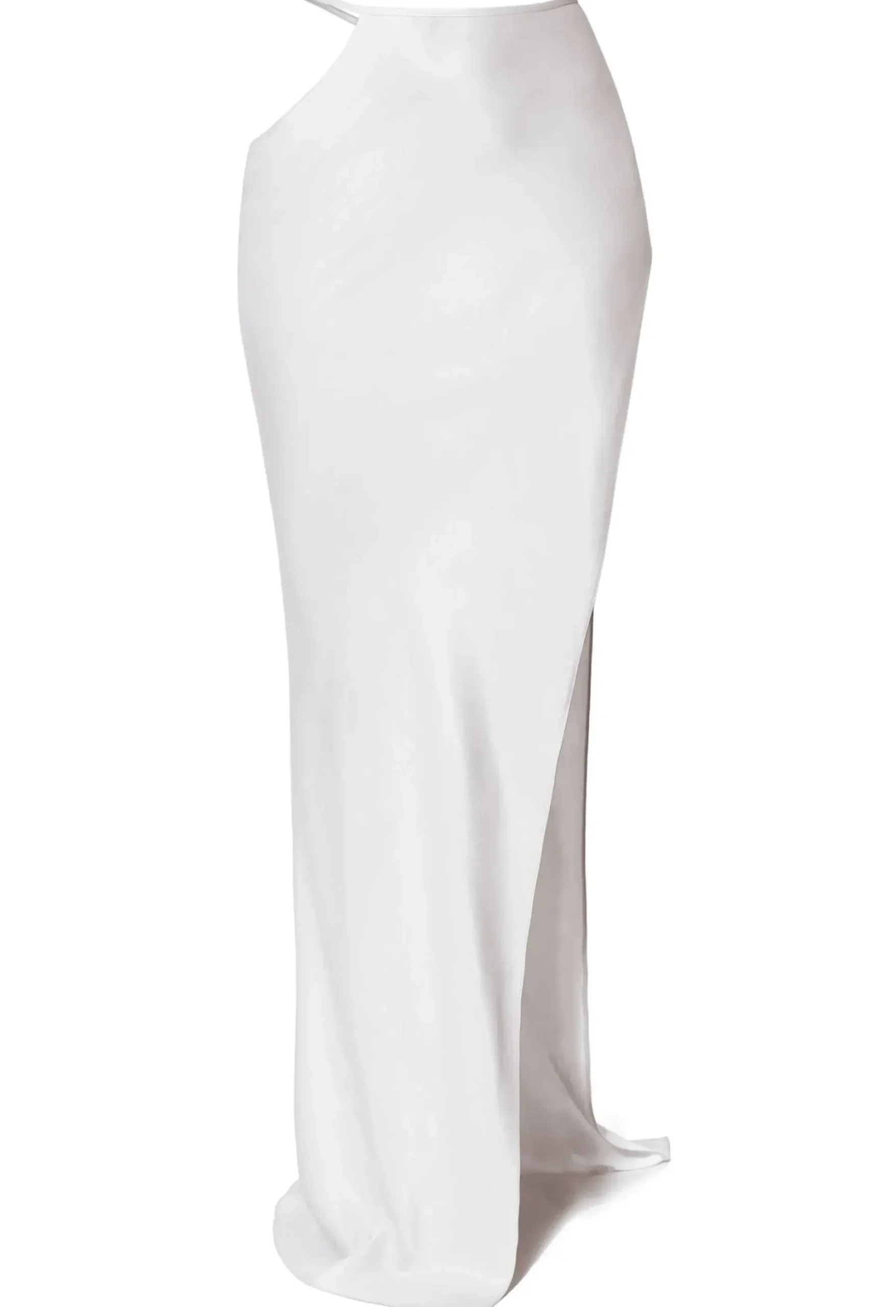 Spodnica Maxi Ze Zmyslowym Wycieciem Na Biodrze Wykonana Z Miesistego, Szlachetnego Atlasu. Wysokie Rozciecie Odslaniajace Lewe Udo.