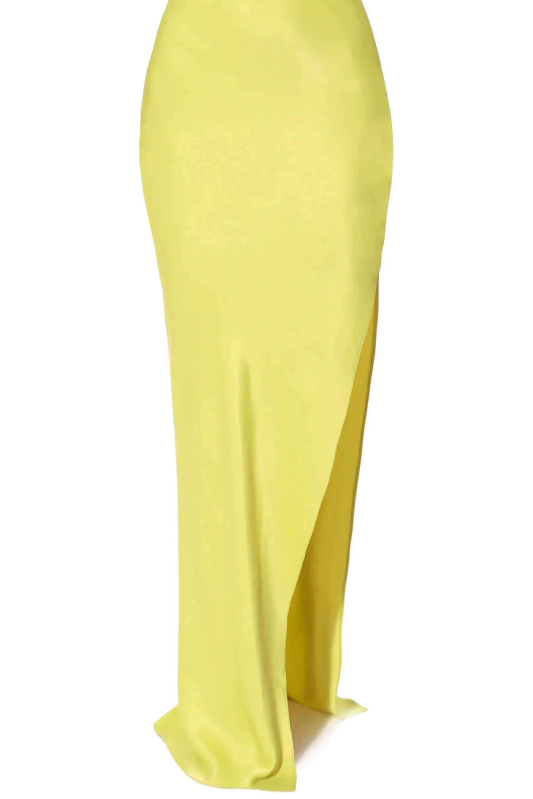 Spodnica Maxi Ze Zmyslowym Wycieciem Na Biodrze Wykonana Z Miesistego, Szlachetnego Atlasu W Odcieniu Neonowej Zieleni. Wysokie Rozciecie Odslaniajace Lewe Udo.