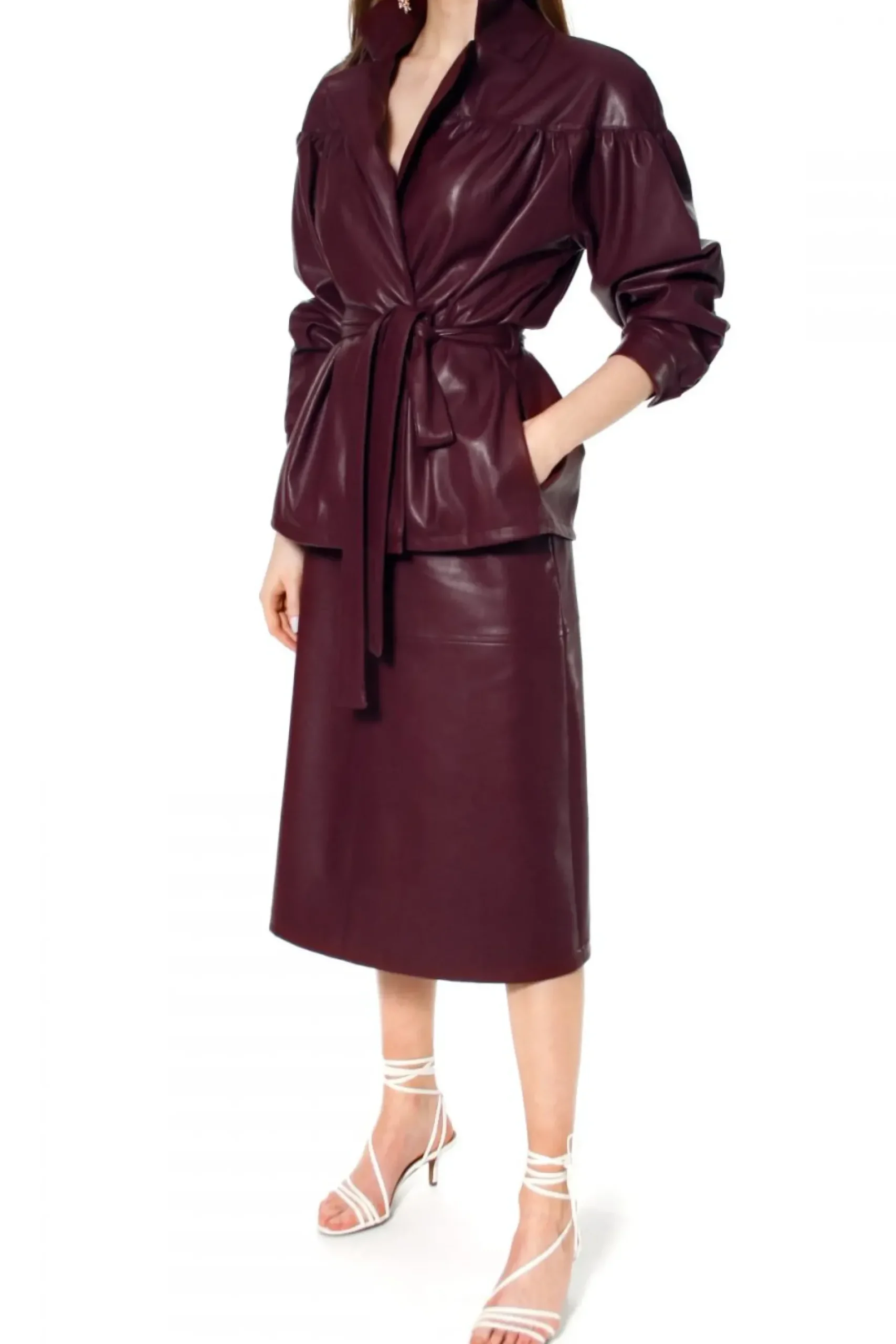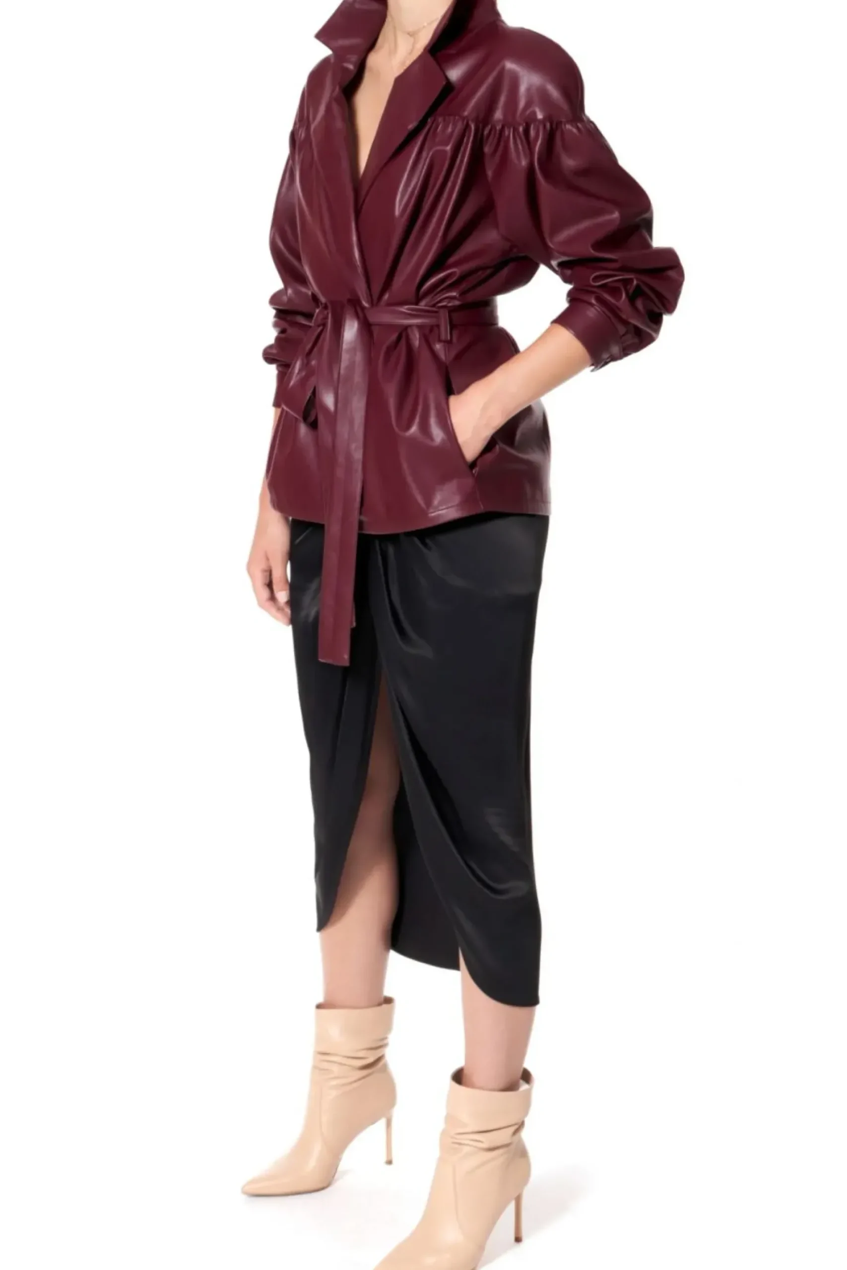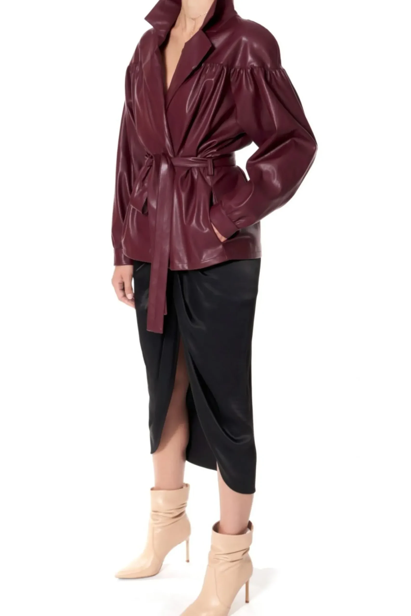 Rekawy Zakonczone Mankietami Zapinanymi Na Obleczone Skora Zatrzaski. Dwurzedowe Zapiecie Na Recznie Przyszywane Zatrzaski, Pokryte Skora Weganska. Talia Podkreslona Wiazanym Paskiem. W Szwach Bocznych Kieszenie. Calosc Na Delikatnej Zorzetowej Podszewce. Kurtka Skorzana Z Paskiem.