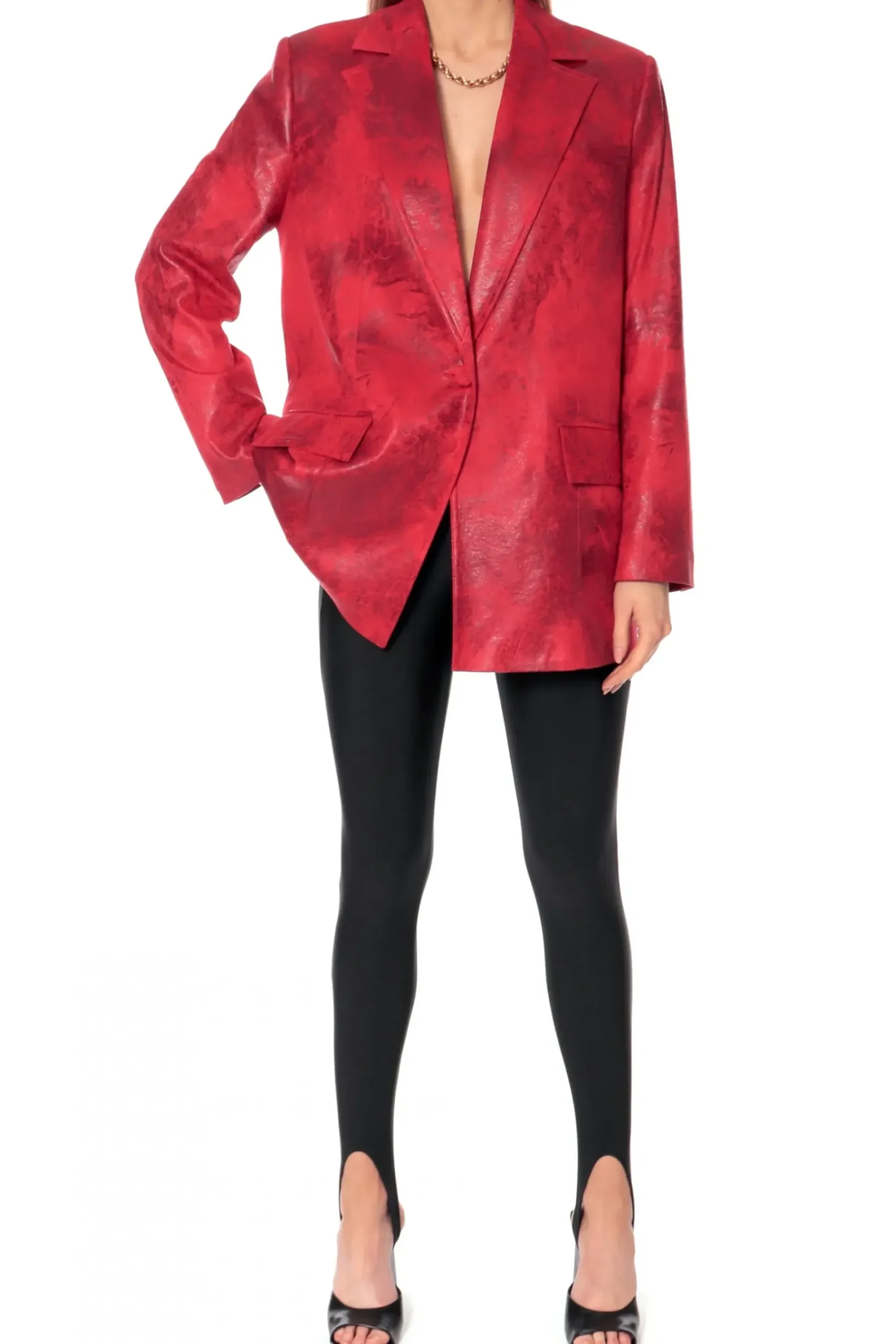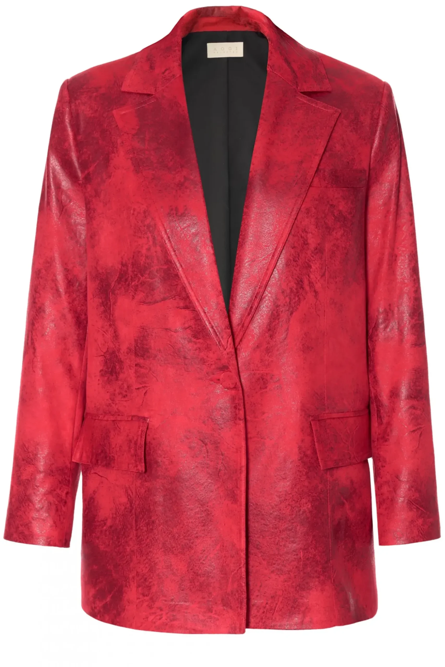 Marynarka Wykonana Z Miekkiego I Delikatnego Materialu O Ciekawej Strukturze Z Efektem Subtelnego Polysku. Fason Oversize Z Szerokimi Klapami, Jednorzedowym Zapieciem Na Guzik Obleczony Tkanina I Mocno Zaznaczonymi Ramionami Wystajacymi Poza Linie Sylwetki.