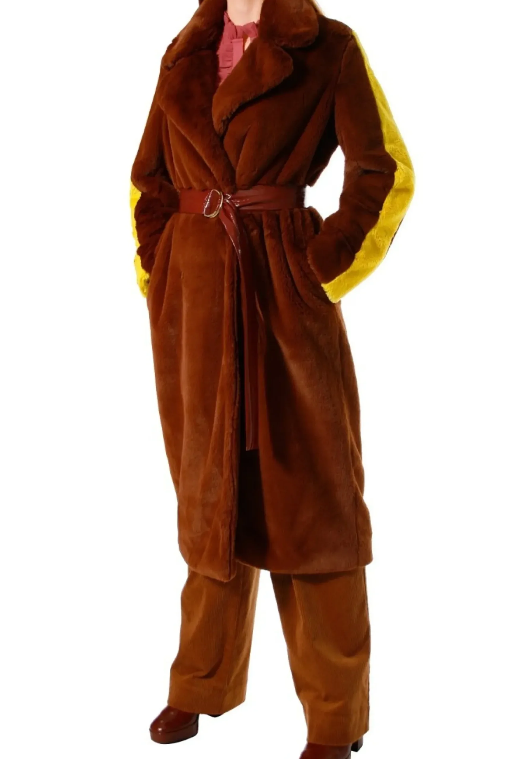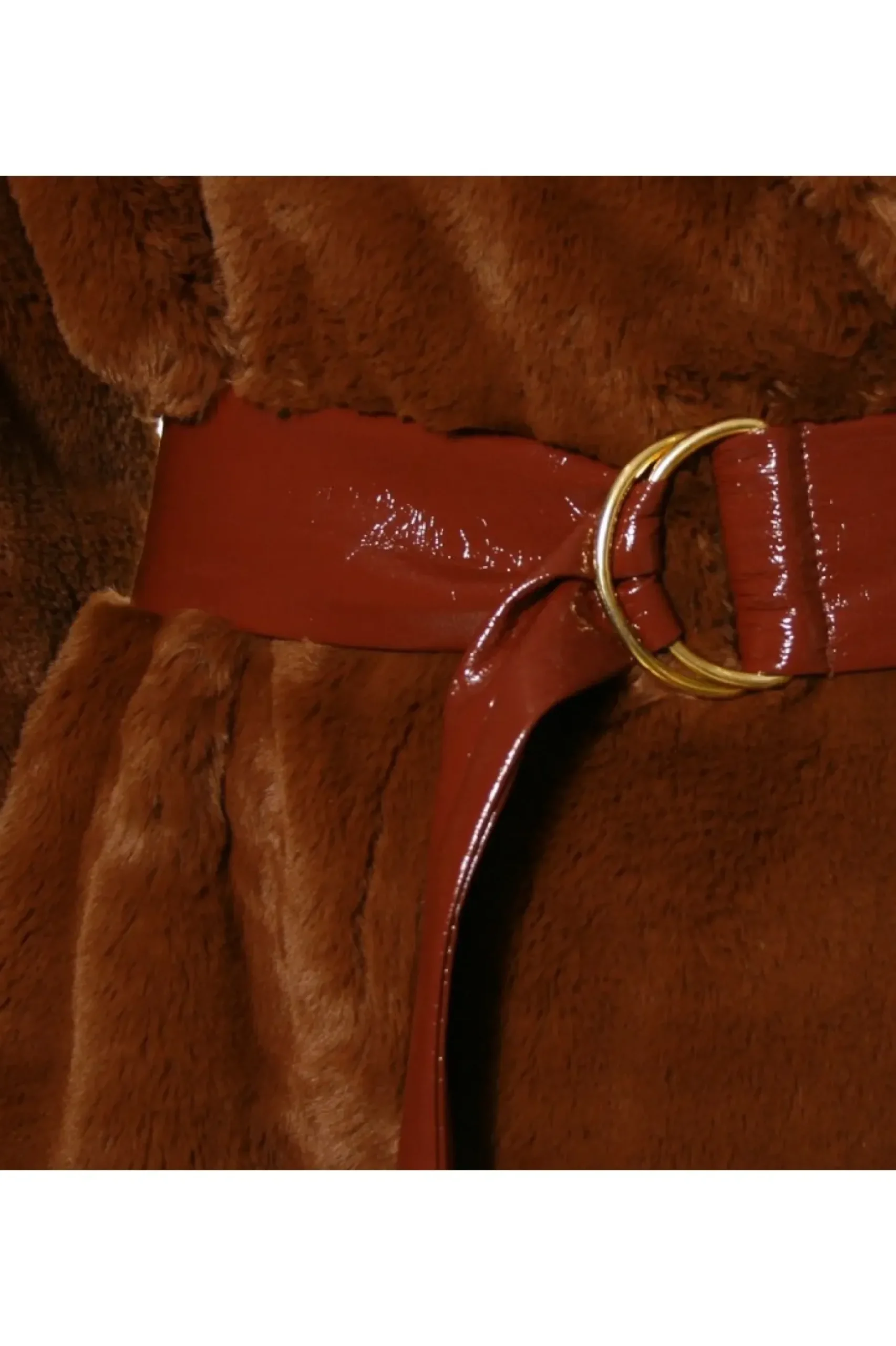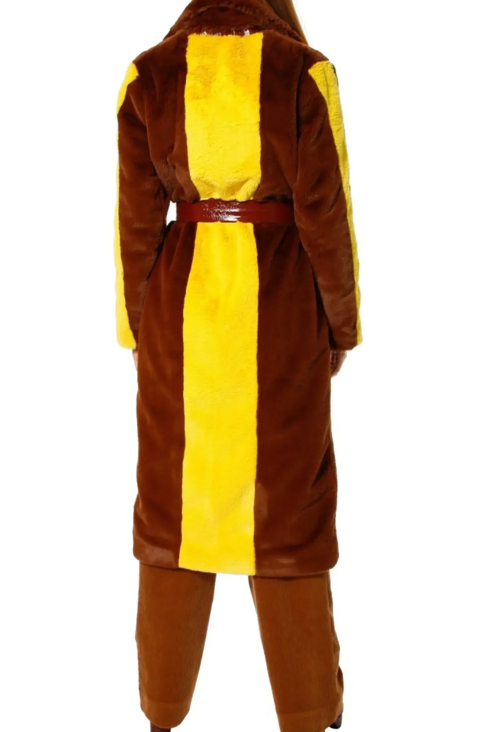 Futro O Dlugosci Midi Uszyte Z Polaczenia Dwoch Kontrastowych Kolorow Futra. Dwurzedowe Zapiecie Na Recznie Przyszywane Zatrzaski, Pokryte Lakierowana Skora Weganska W Brazowym Kolorze. Talia Podkreslona Paskiem Z Lakierowanej Skory Weganskiej Zapinanym Na Zlota Klamerke. Fason Mozna Nosic Takze Swobodnie, Bez Paska. W Szwach Bocznych Kieszenie. Calosc Na Zakardowej Podszewce W Kolorze Camelowym W Desen Malenkich Czerwonych Groszkow.