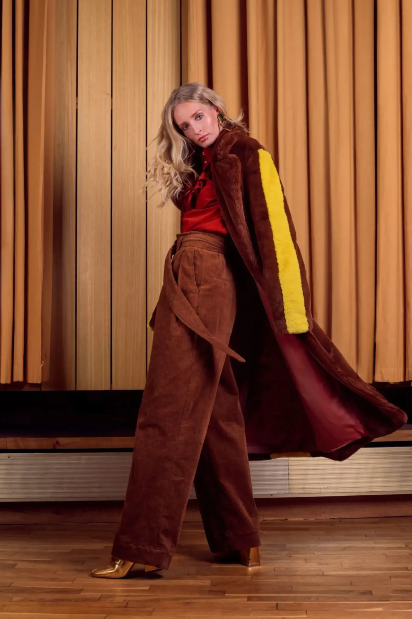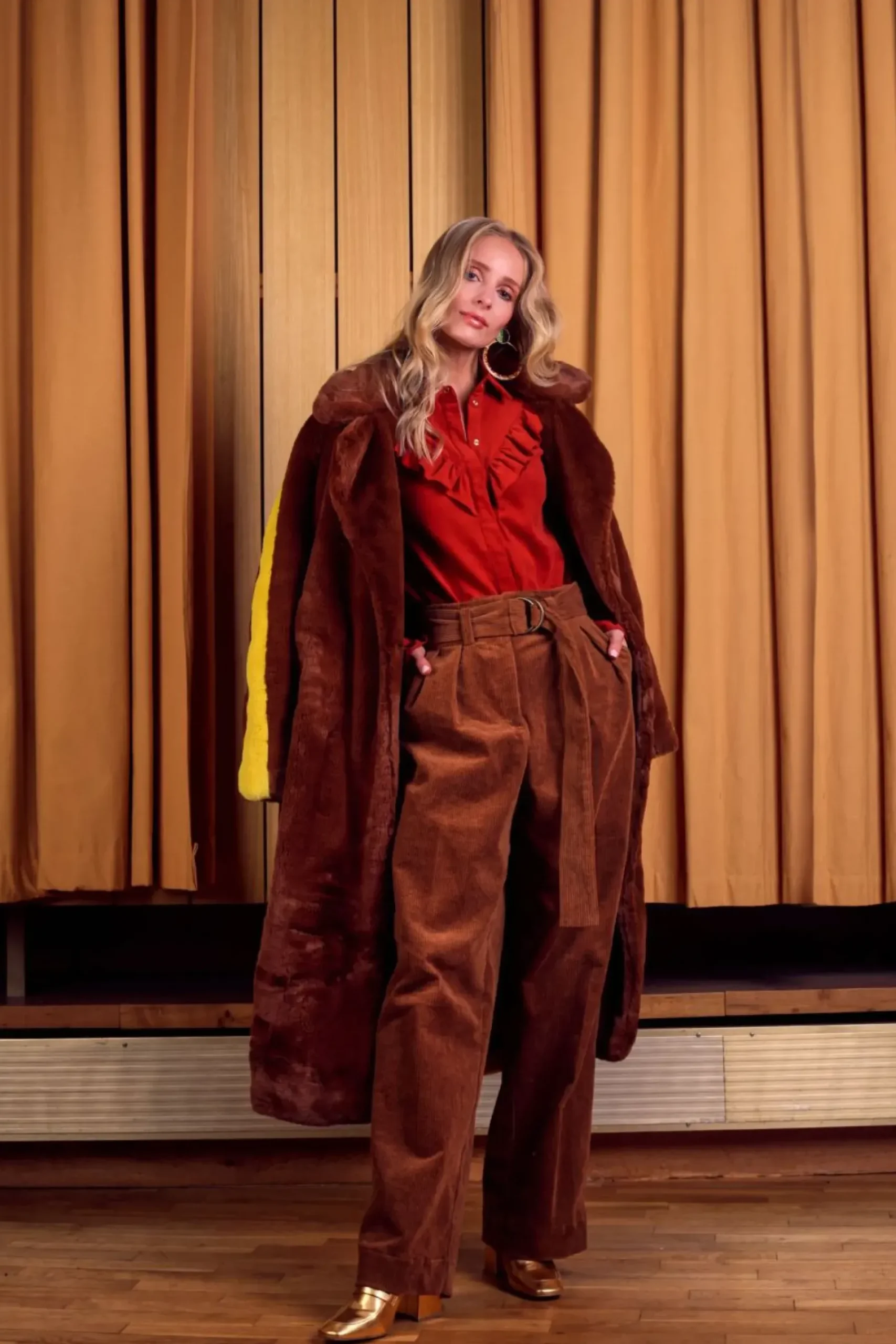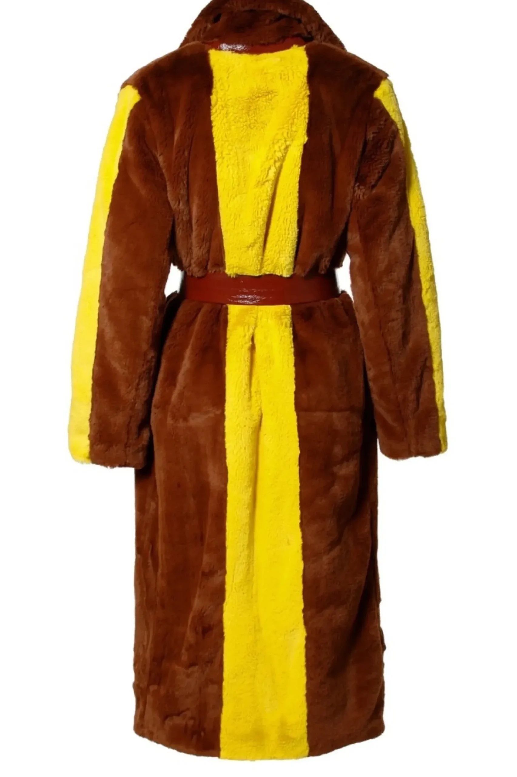 Futro O Dlugosci Midi Uszyte Z Polaczenia Dwoch Kontrastowych Kolorow Futra. Dwurzedowe Zapiecie Na Recznie Przyszywane Zatrzaski, Pokryte Lakierowana Skora Weganska W Brazowym Kolorze. Talia Podkreslona Paskiem Z Lakierowanej Skory Weganskiej Zapinanym Na Zlota Klamerke. Fason Mozna Nosic Takze Swobodnie, Bez Paska. W Szwach Bocznych Kieszenie. Calosc Na Zakardowej Podszewce W Kolorze Camelowym W Desen Malenkich Czerwonych Groszkow.