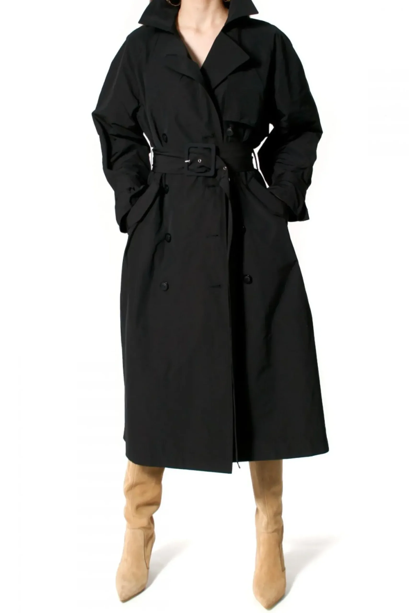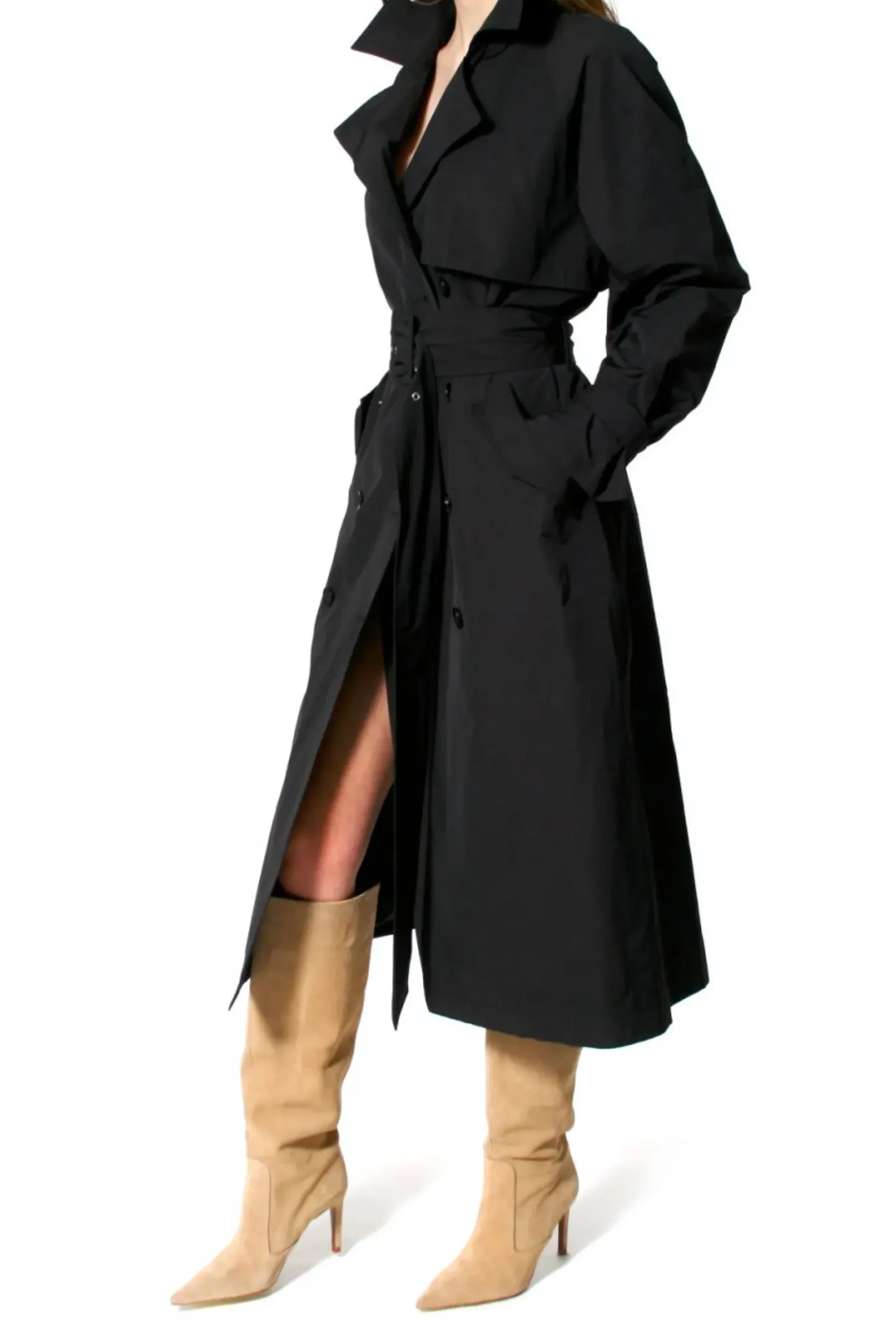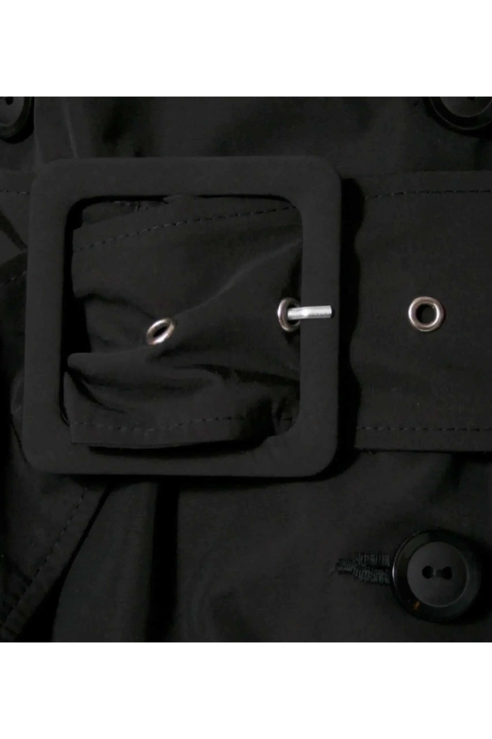 Trencz Uszyty Z Mieszanki Bawelny I Nylonu. Lekko Sztywniejsza , Matowa Tkanina O Sredniej Grubosci Z Tzw. Efektem Memory Pozwala Na Podkreslenie Przestrzennej Formy Plaszcza. Zapinany Na Dwa Rzedy Guzikow, Rekawy Sciagane Ozdobna Patka Zapinana Na Guzik. Szerokie Klapy Mozna Zapiac Pod Szyja Lub Fantazyjnie Postawic I Formowac Na Co Pozwala Charakter Tkaniny. Talia Podkreslona Szerokim Paskiem Zapinanym Na Oblekana Klamre. Calosc Na Czarnej Zakardowej Podszewce W Prazek.