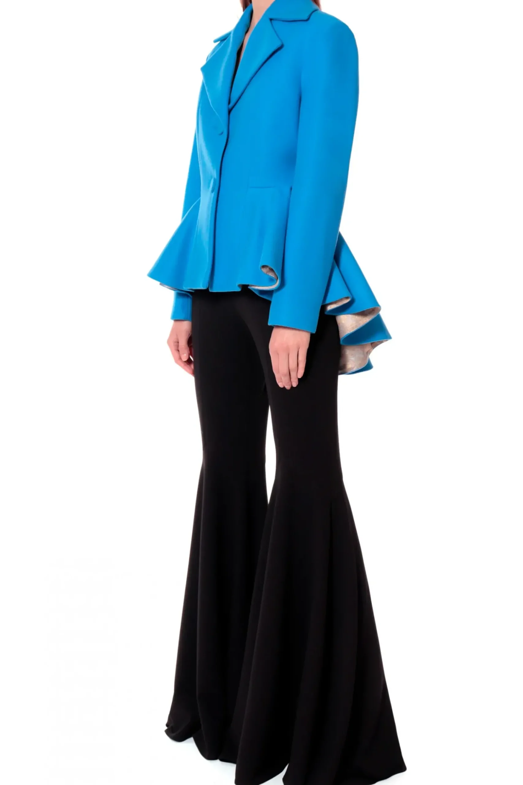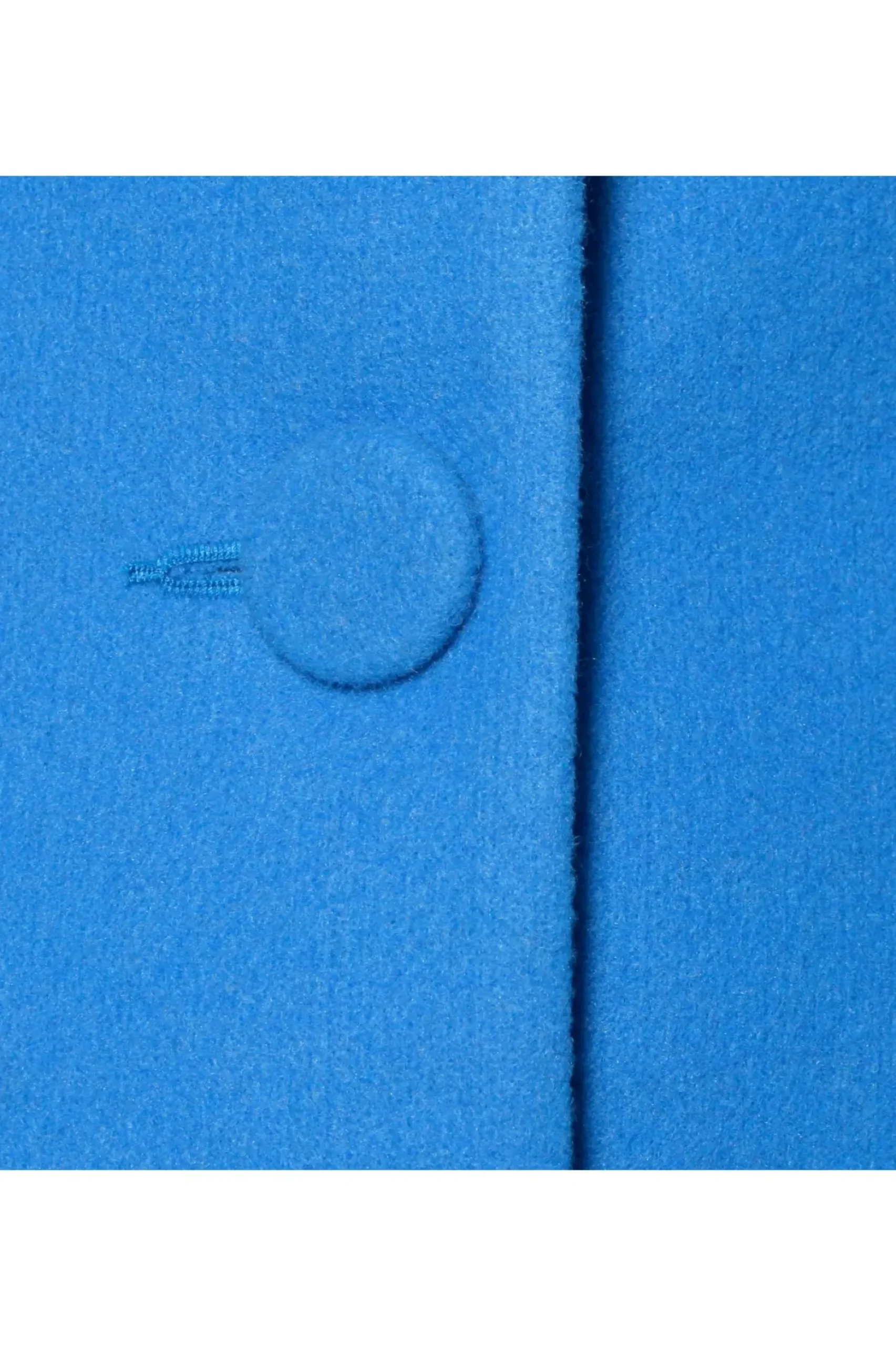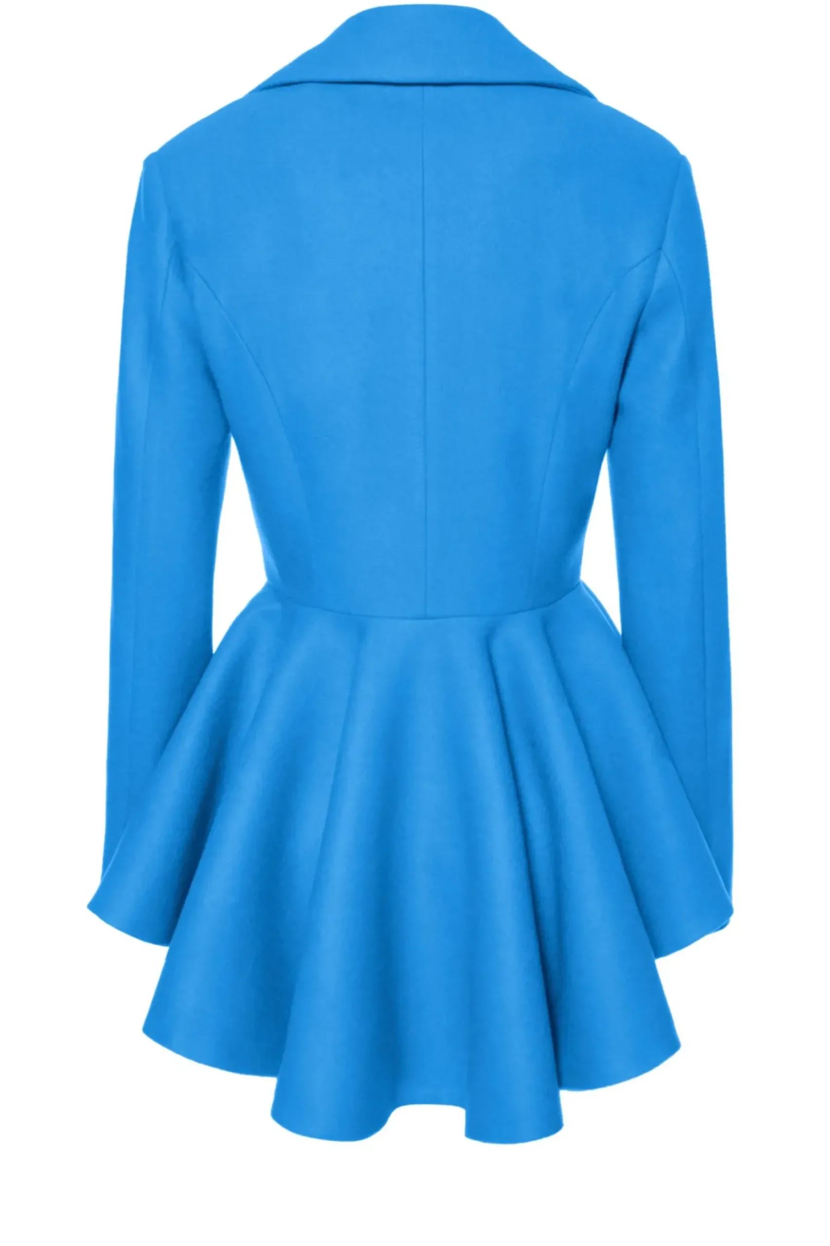 Przyciagajacy Wzrok, Dopasowany, Jednorzedowy, Krotki Plaszcz W Intensywnym Lazurowym Odcieniu. Projekt Wykonany Z Miesistej, Cieplej Mieszanki Welny I Akrylu. Duzy Kolnierz I Klapy O Ostrym Kroju Wraz Z Mocno Zaznaczona Linia Talii Podkreslaja Kobiece Ksztalty. Rozkloszowanie Precyzyjnie Odciete Od Talii W Dol, Z Przodu Elegancko Rozchodzi Sie Na Boki Optycznie Poszerzajac Biodra, Z Tylu Przechodzac W Wyraznie Dluzsza Falbane. Zapiecie Na Oblekane Materialem Guziki. Calosc Podszyta Zakardowa Podszewka W Ornamentowy Wzor.