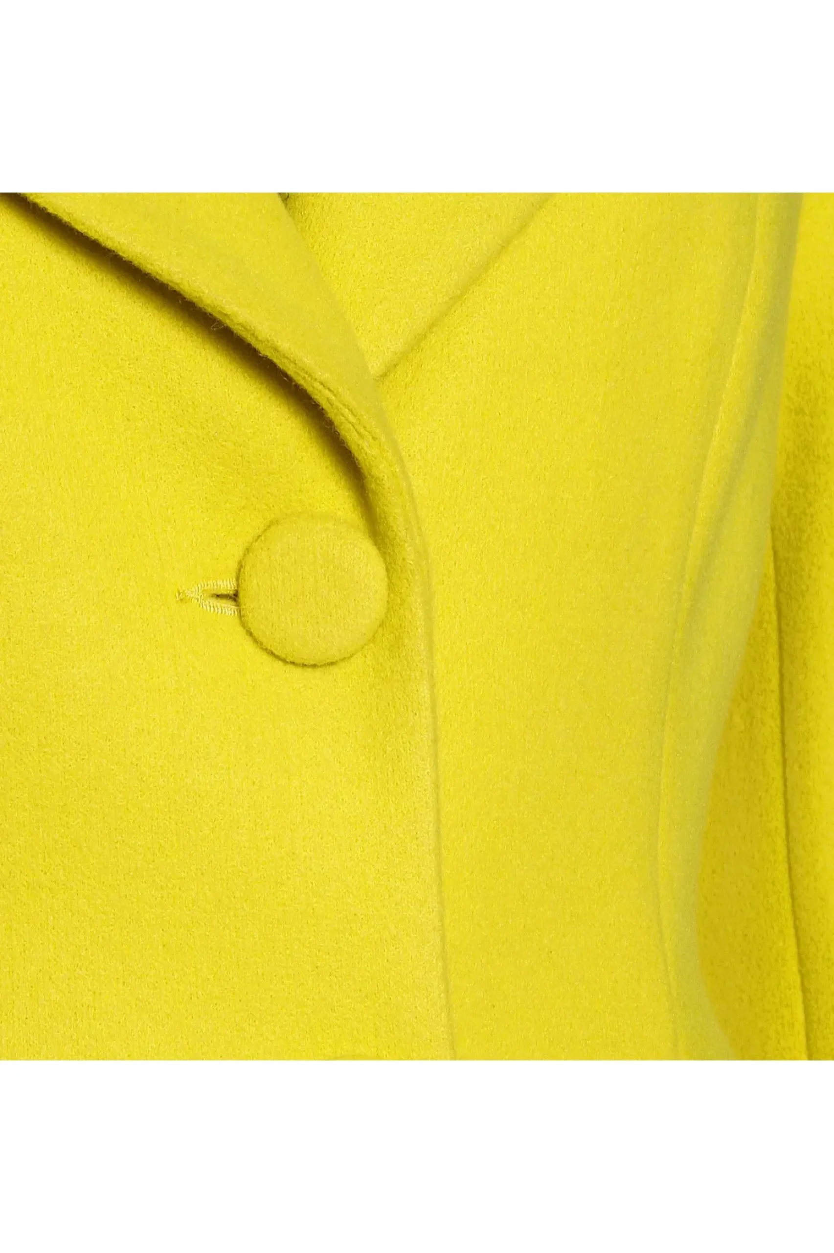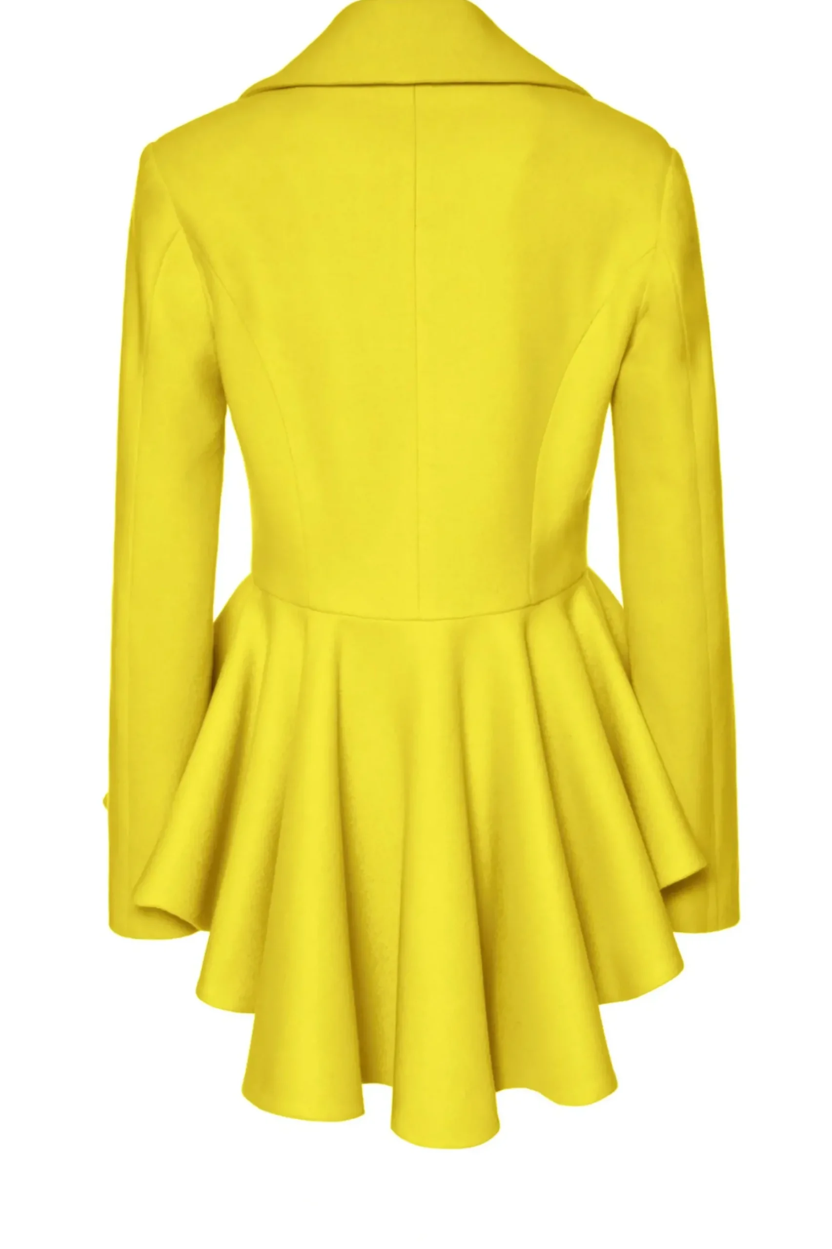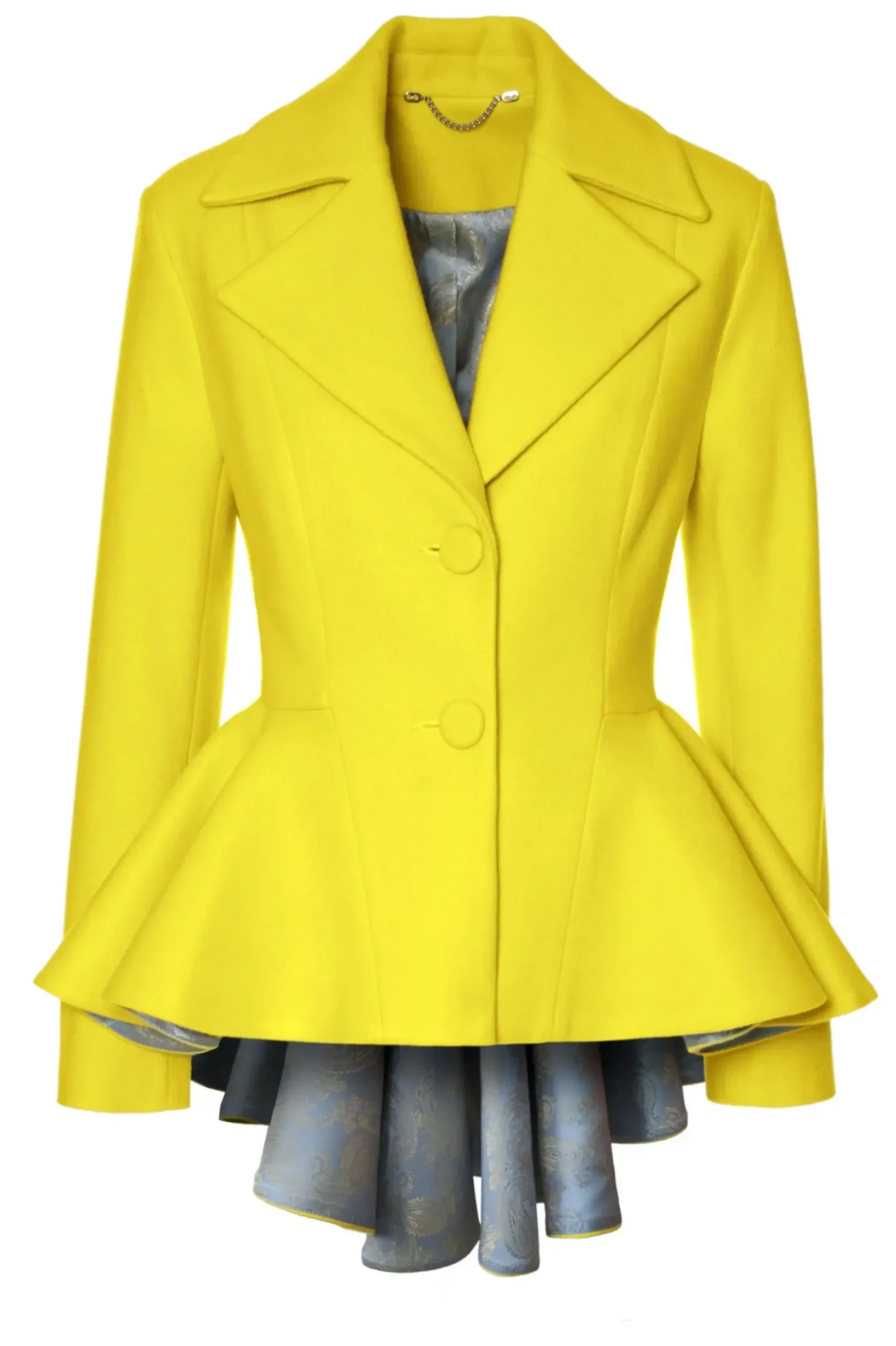Przyciagajacy Wzrok, Dopasowany, Jednorzedowy, Krotki Plaszcz W Intensywnym Zoltym Kolorze. Projekt Wykonany Z Miesistej, Cieplej Mieszanki Welny I Akrylu. Duzy Kolnierz I Klapy O Ostrym Kroju Wraz Z Mocno Zaznaczona Linia Talii Podkreslaja Kobiece Ksztalty. Rozkloszowanie Precyzyjnie Odciete Od Talii W Dol, Z Przodu Elegancko Rozchodzi Sie Na Boki Optycznie Poszerzajac Biodra, Z Tylu Przechodzac W Wyraznie Dluzsza Falbane. Zapiecie Na Oblekane Materialem Guziki. Calosc Podszyta Zakardowa Podszewka W Ornamentowy Wzor.