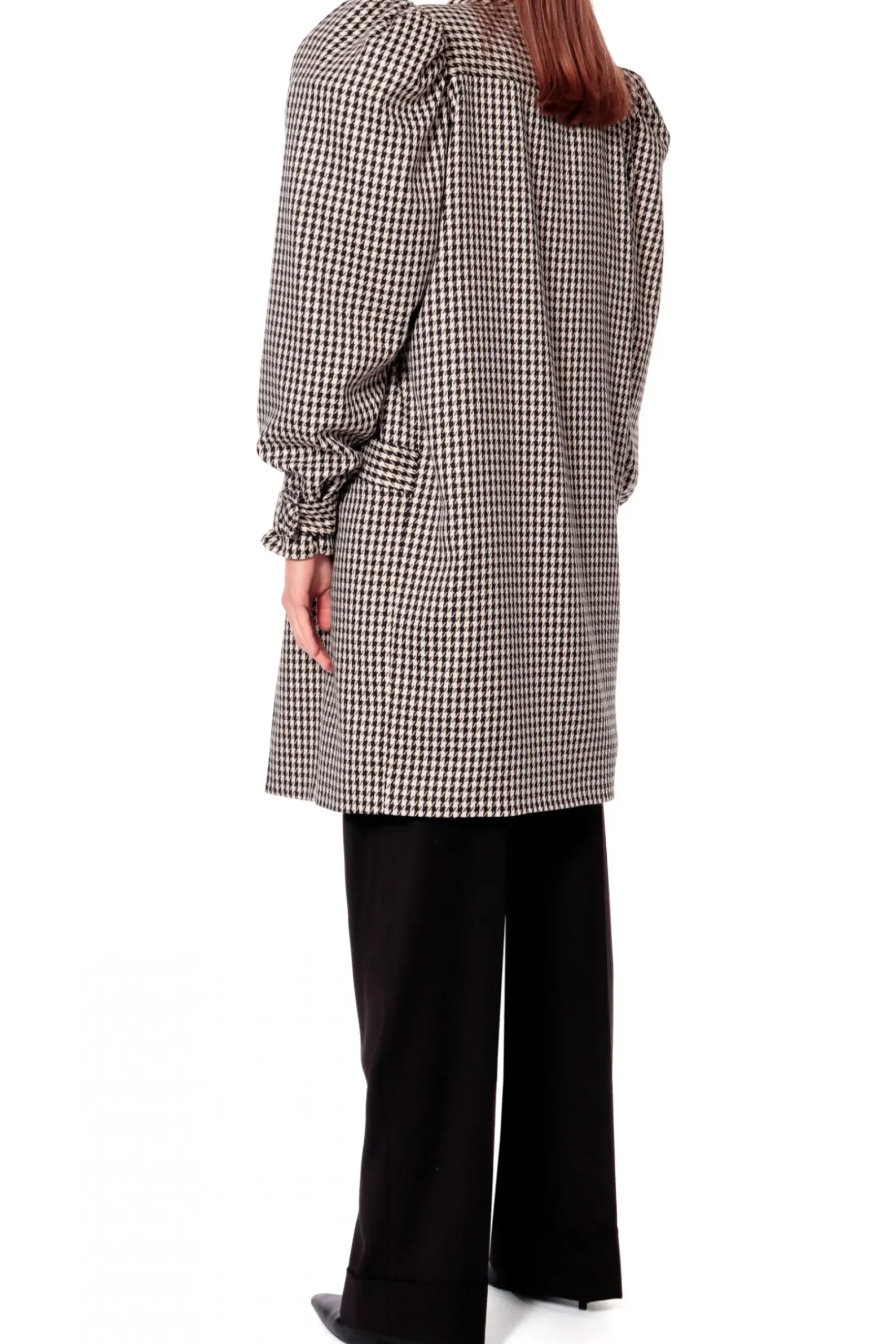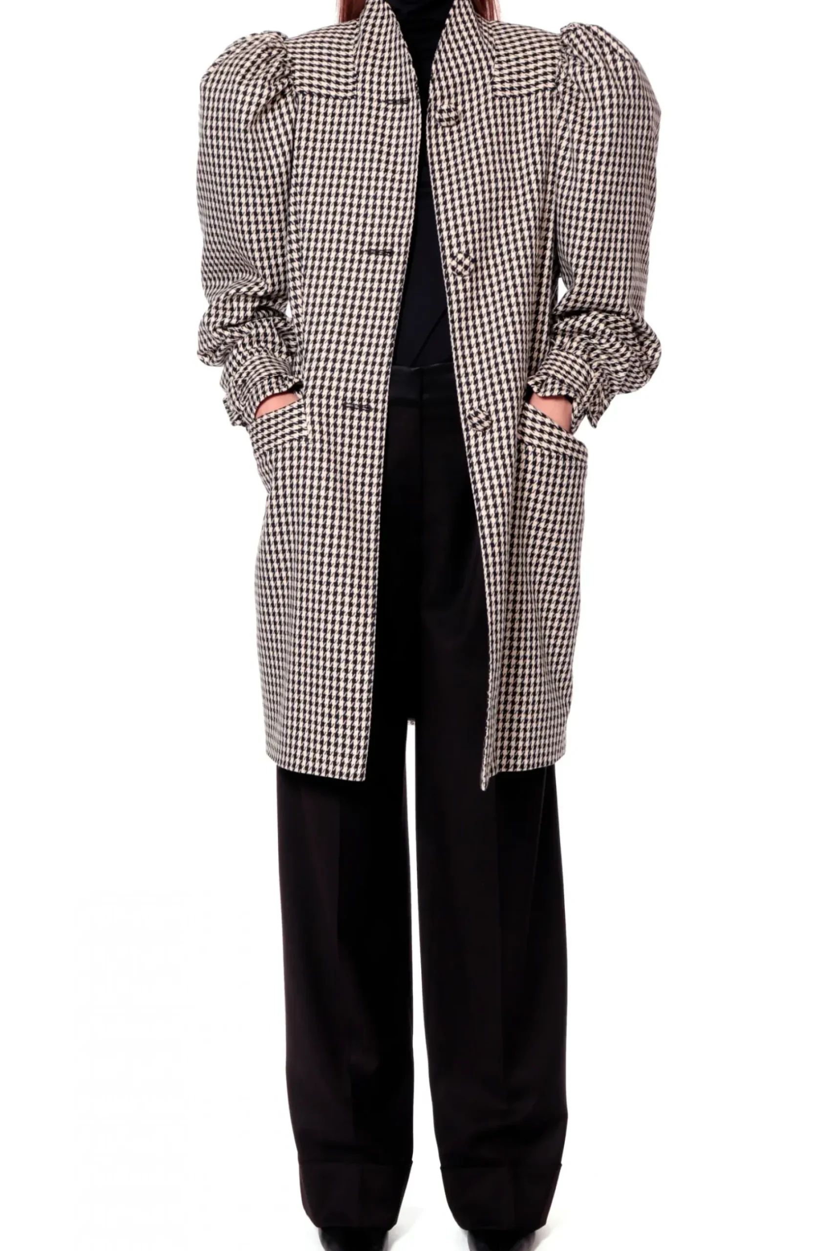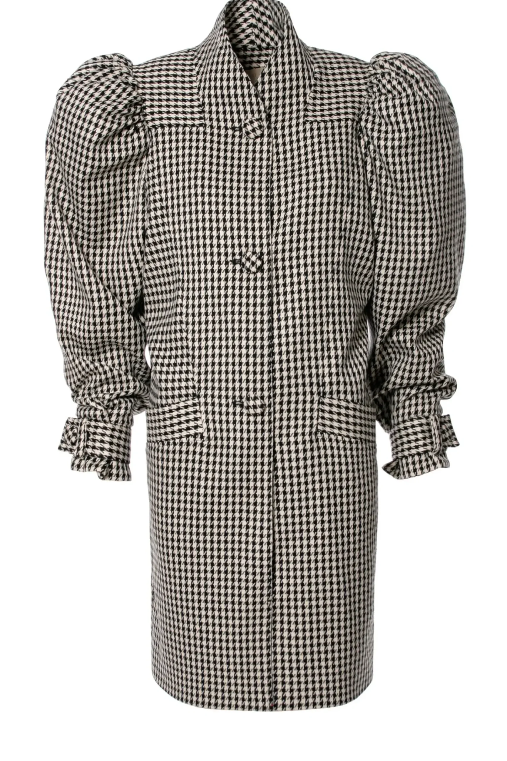 Efektowny, Niezwykle Szykowny Plaszcz W Ponadczasowy Wzor W Pepitke. Otulajaca Szyje Stojka Wraz Z Bufiastymi Rekawami I Misternie Wykonanymi Detalami Tworzy Niebanalna Calosc. Rekawy Przy Nadgarstkach Zebrane Sa Ozdobnym Paskiem Zapietym Na Guzik. Plaszcz Zapinany Jest Na Trzy Oblekane Guziki, A Boczne Kieszenie Zaznaczone Wyraznymi, Szerokimi Zakladkami. Calosc Podszyta Czarna Prazkowana Podszewka.