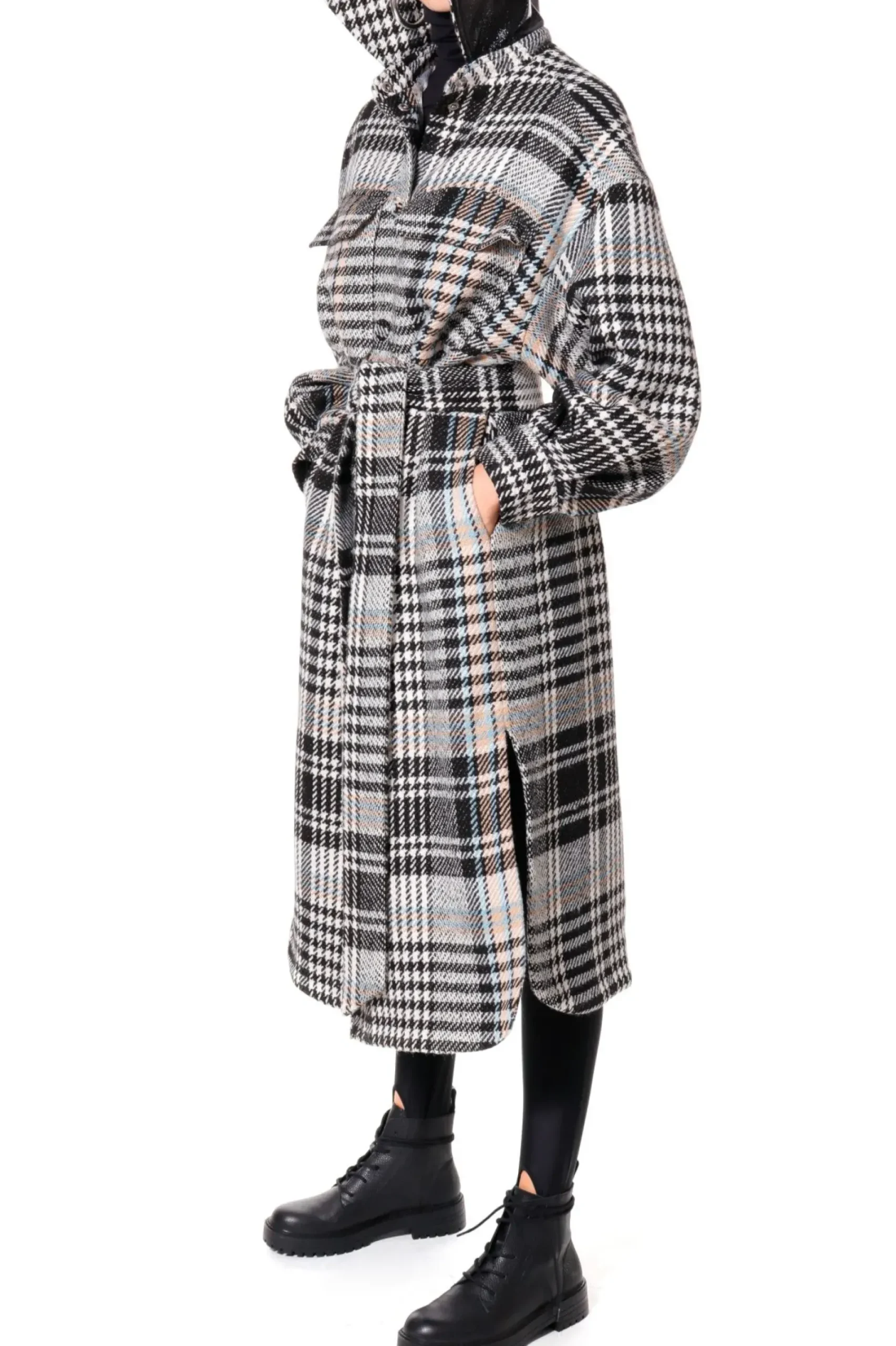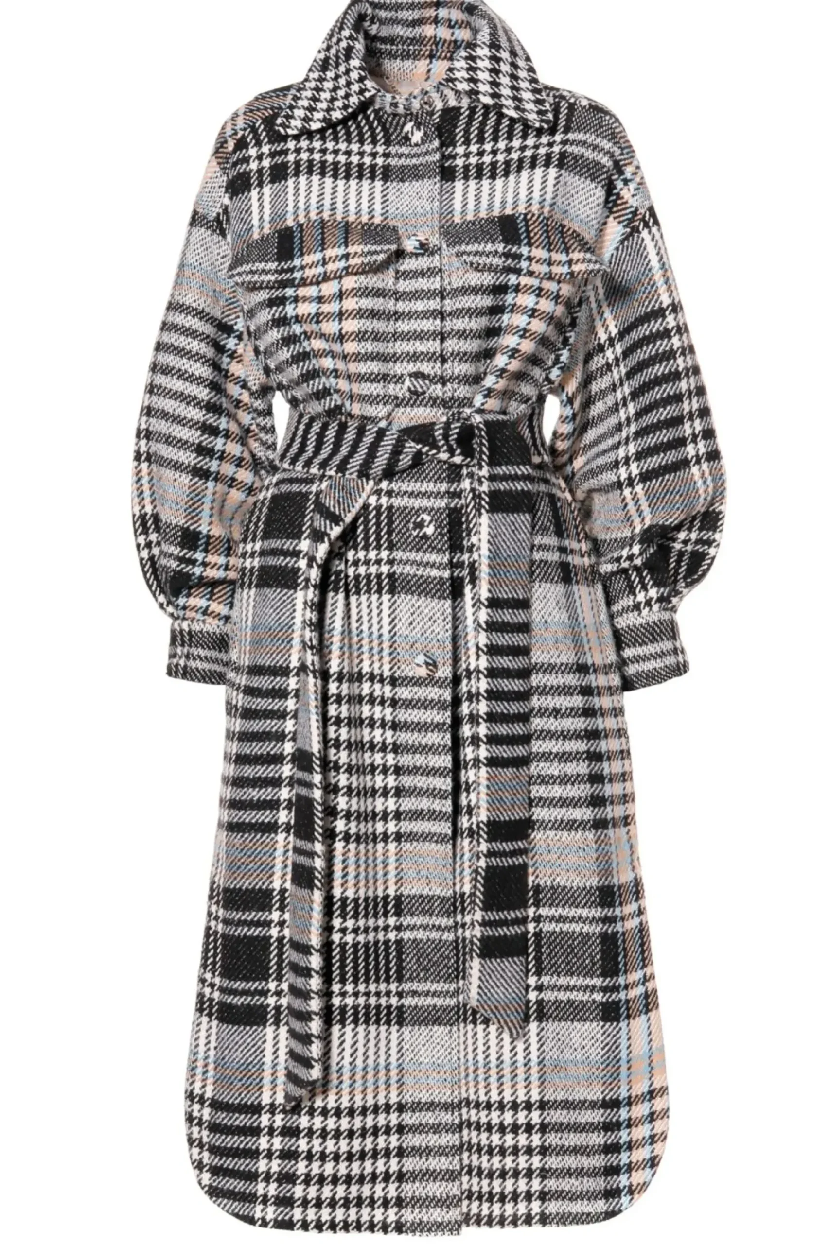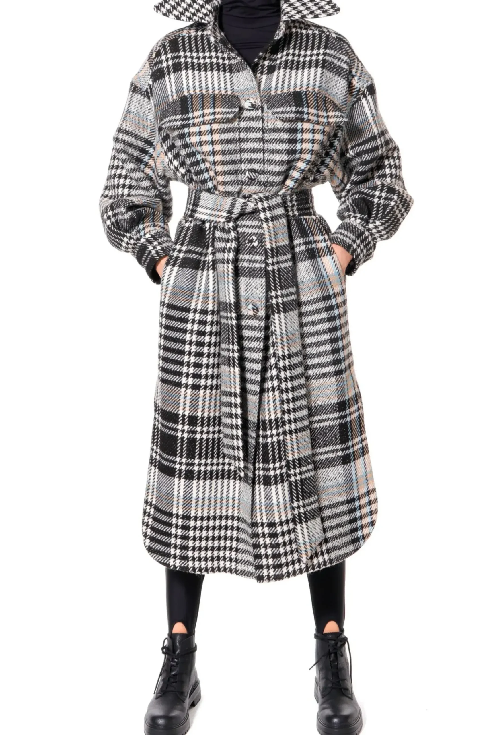Plaszcz Maxi W Wyrazista Krate Inspirowany Krojem Sportowej Koszuli. Efektowny, Kraciasty Desen Tworza Klasyczne, Neutralne Kolory: Krem, Czern, Cieply Bez I Jasny Blekit. Charakterystyczny Kolnierz Na Stojce Wykonczony Czarna Lakierowana Weganska Skora. Duze, Ozdobne Nakladane Kieszenie Z Patkami Z Przodu Oraz Dodatkowo W Szwach Bocznych Ukryte Praktyczne Kieszenie. Oversizowy Fason I Krata Stanowia O Eleganckim A Zarazem Swobodnym Charakterze Projektu. Rekaw Z Luzniejsza Pacha Pozwala Na Swobodne Noszenie Marynarki Lub Szerszego Swetra Pod Płaszczem. Talia Przewiazywana Szerokim Paskiem. Zapinany Na Metalowe Zatrzaski W Kolorze Srebrnym Z Zewnatrz Obleczone Kraciasta Tkanina Zasadnicza. Plaszcz Doskonale Wyglada Noszony Takze Bez Paska. Calosc Na Zakardowej Podszewce W Mozaikowy Zloto-Blekitny Desen.