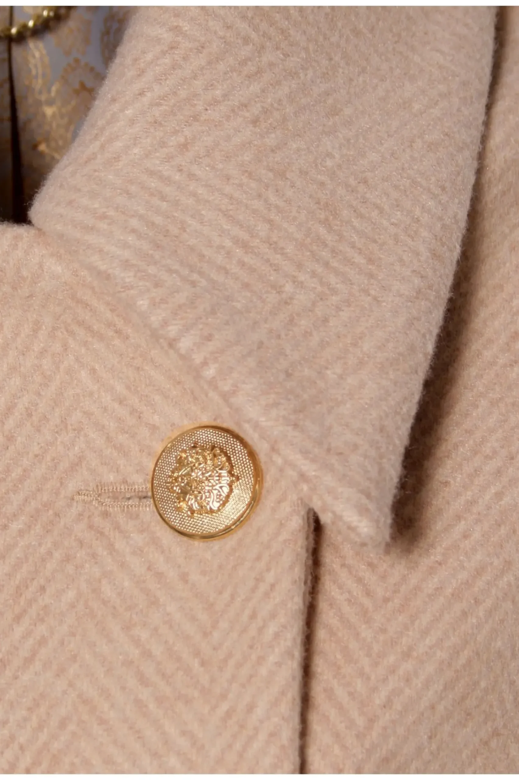 Plaszcz Maxi W Stylu Militarnym, Wykonany Z Miesistego, Miekkiego Materialu W Jodelke. Dwurzedowy, Zapinany Na Dekoracyjne Zlote Guziki, Ktore Znajduja Sie Rowniez Na Pagonach I Prostych Mankietach. Kieszenie Ukryte W Bocznych Szwach Z Mala Padka. Szeroka Linia Ramion, Prosty Kroj Oraz Kolnierz Zapinany Pod Szyja Nadaja Calosci Maskulistyczny Wyglad. Calosc Podszyta Zakardowa Podszewka. Swietnie Skomponuje Sie Z Wysokimi Butami W Stylu Militarnym.