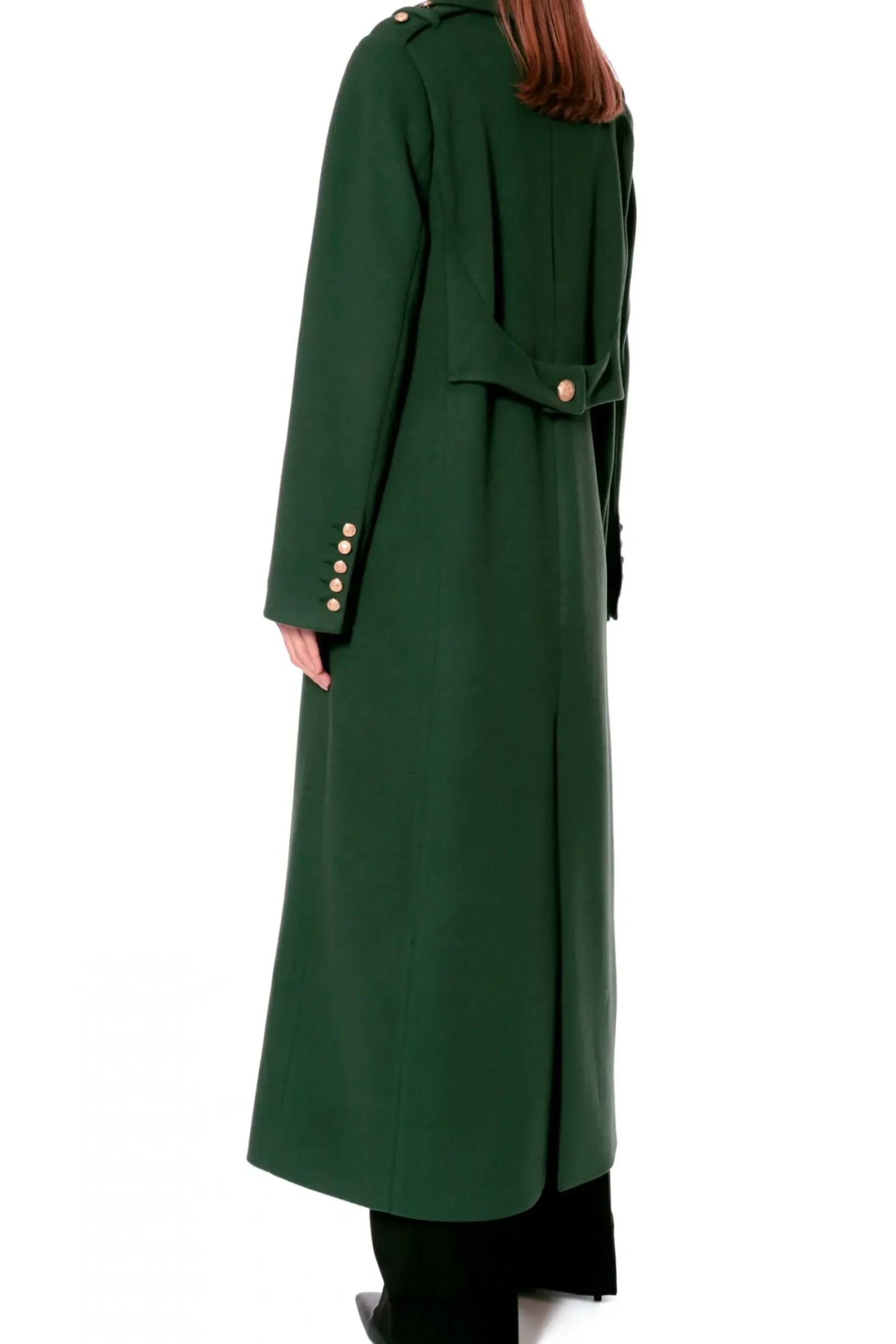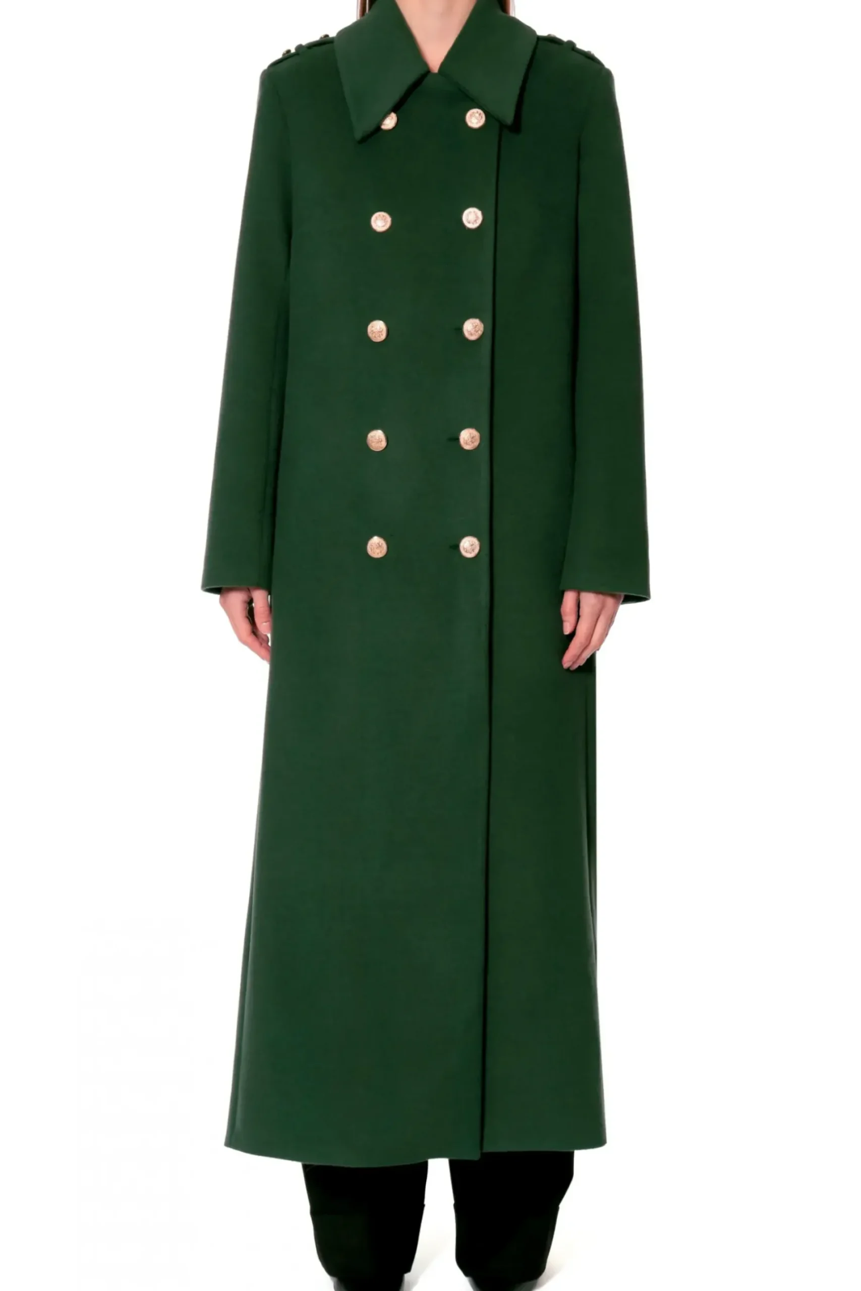 Plaszcz Maxi W Stylu Militarnym, Wykonany Z Miesistego, Miekkiego Materialu. Dwurzedowy, Zapinany Na Dekoracyjne Zlote Guziki, Ktore Znajduja Sie Rowniez Na Pagonach I Prostych Mankietach. Kieszenie Ukryte W Bocznych Szwach Z Mala Padka. Szeroka Linia Ramion, Prosty Kroj Oraz Kolnierz Zapinany Pod Szyja Nadaja Calosci Maskulistyczny Wyglad. Calosc Podszyta Zakardowa Podszewka. Swietnie Skomponuje Sie Z Wysokimi Butami W Stylu Militarnym.