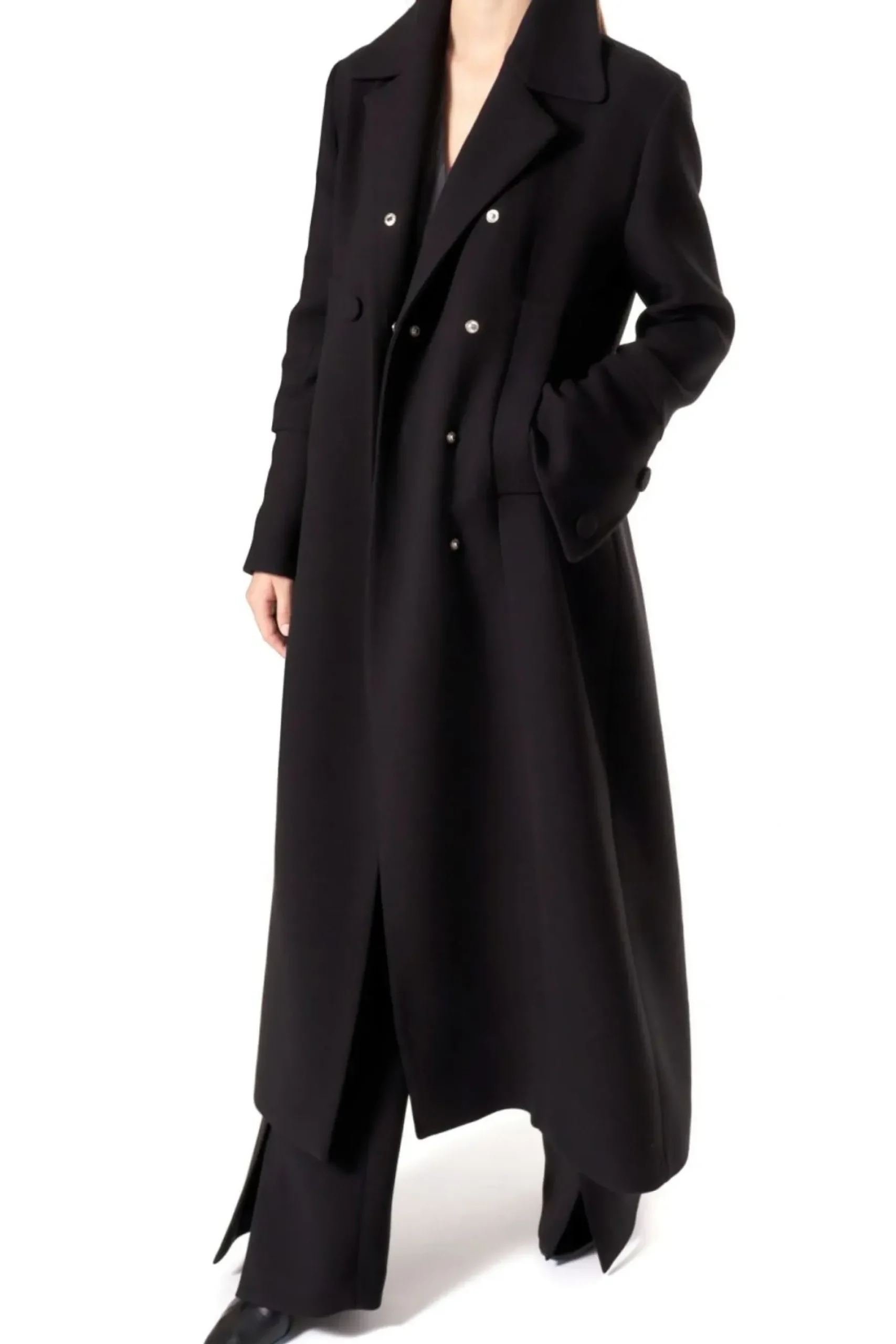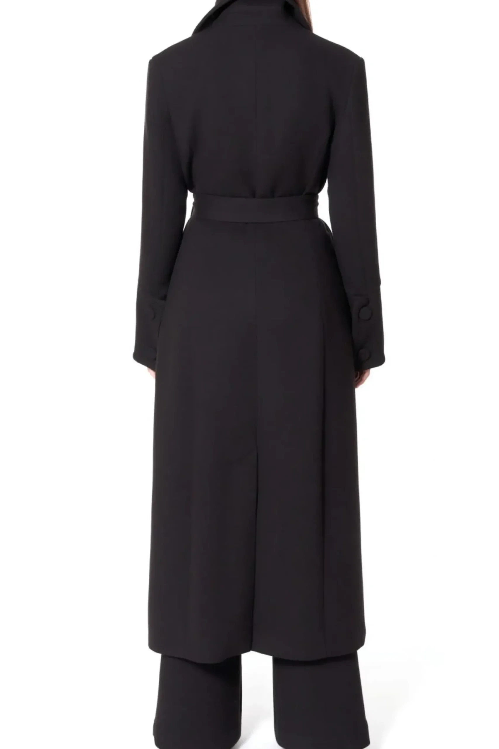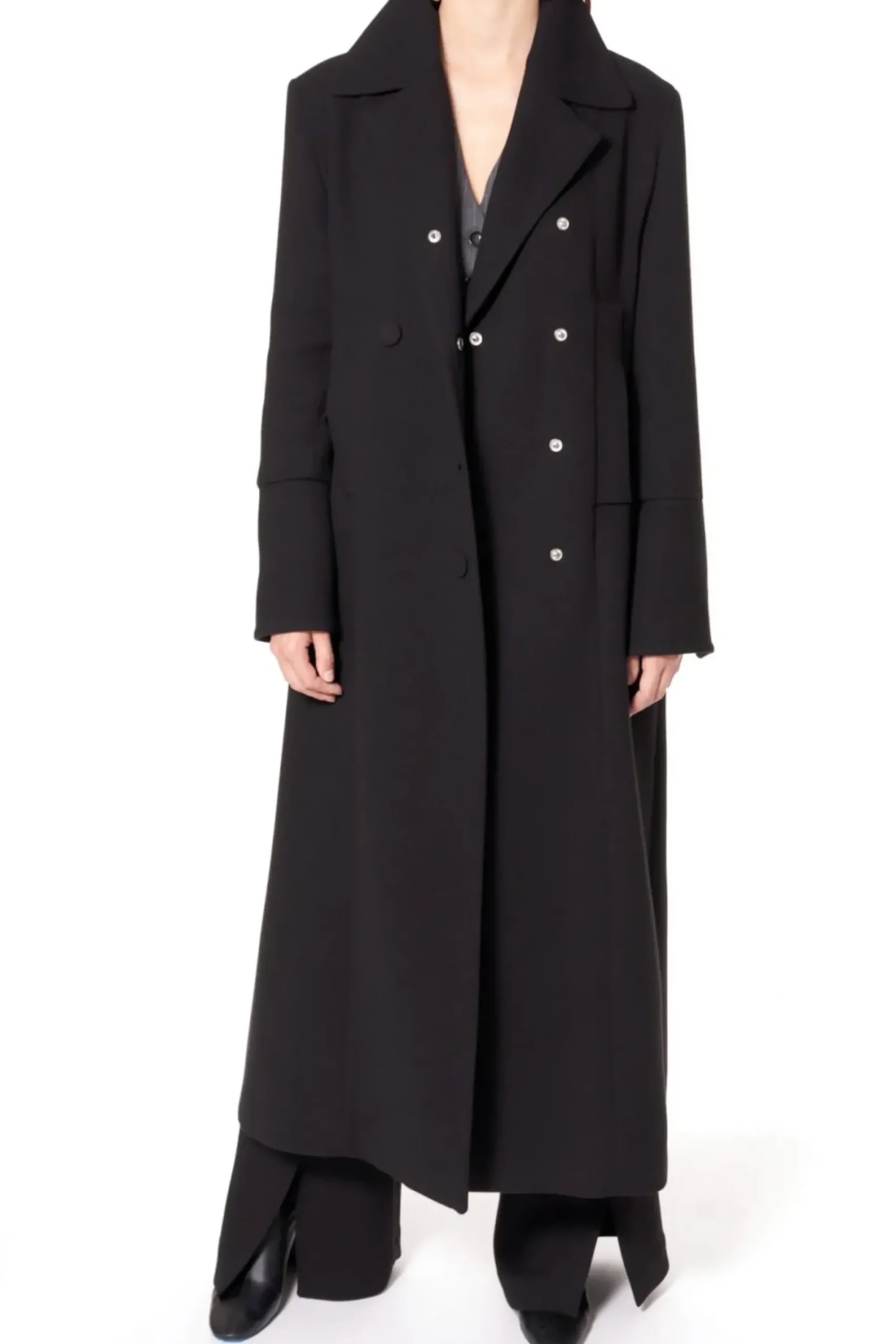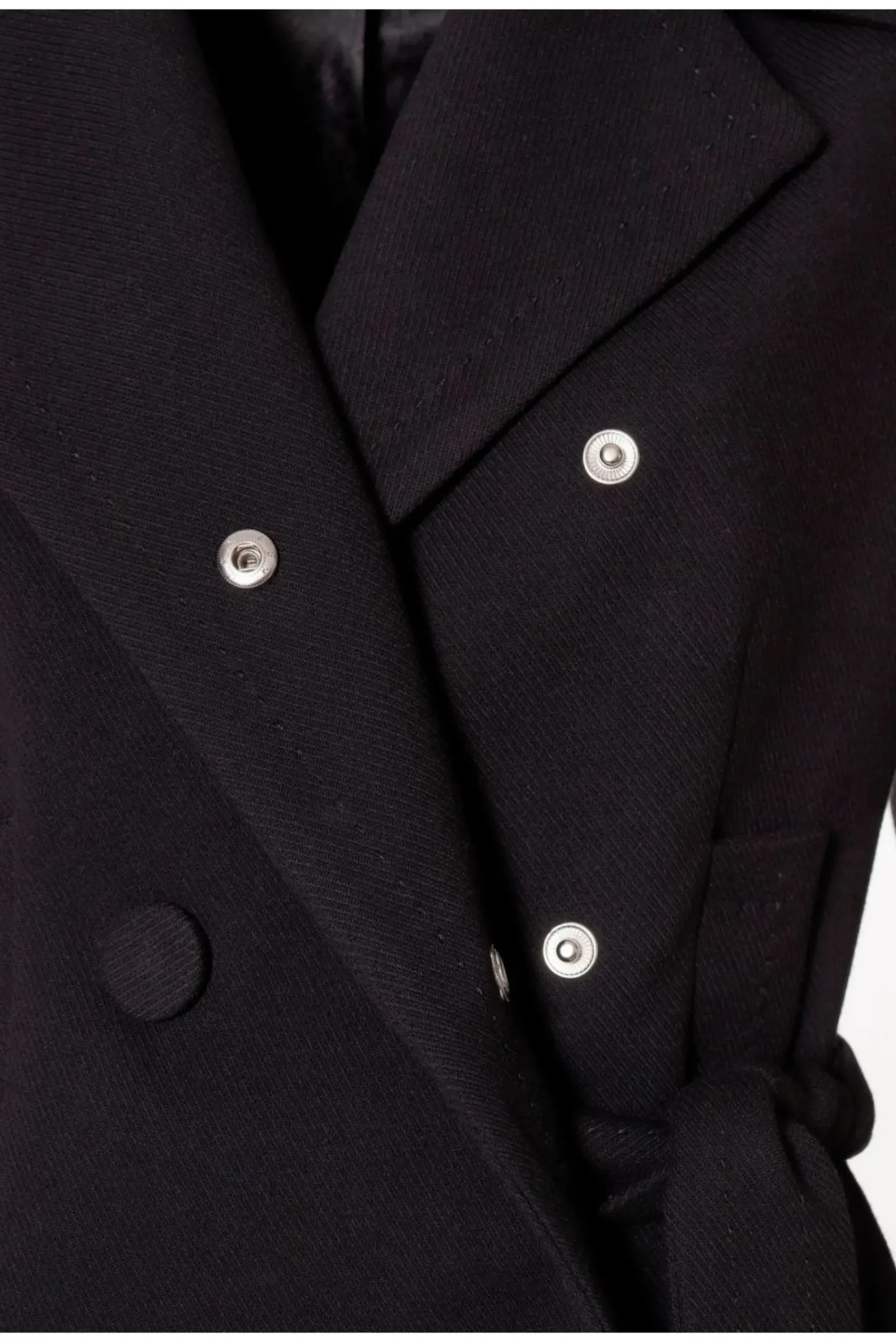Elegancki Plaszcz Maxi Uszyty Z Miesistego Diagonalu O Sredniej Grubosci. Minimalistyczna, Klasyczna Linia Plaszcza Przelamana Asymetrycznym Wiazaniem W Pasie. Krawiecki Kunszt Uwidoczniony W Cieciach Wysmuklajacych Sylwetke Oraz Ozdobnych Stebnowaniach Na Krawedziech. Dwurzedowe Zapiecie Na Napy Z Zewnatrz Obleczone Tkanina, Po Rozpieciu Widoczne Metalowe Srebrne Elementy Nap Co Nadaje Nowoczesnego Charakteru Projektowi. Plaszcz Nos Mocno Zwiazany Aby Podkreslic Talie Lub Nonszalancko Rozpiety W Wielkomiejskim Stylu