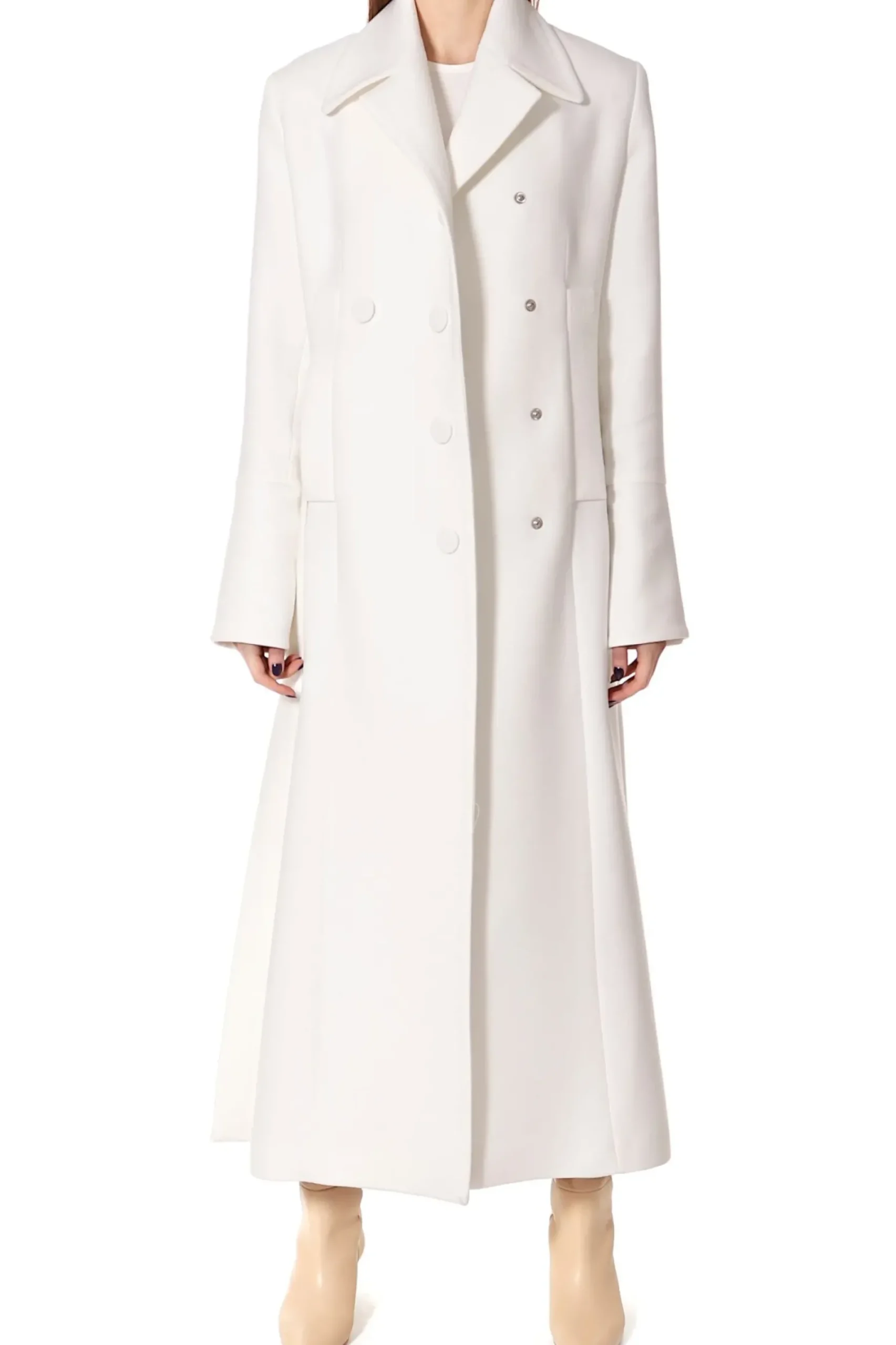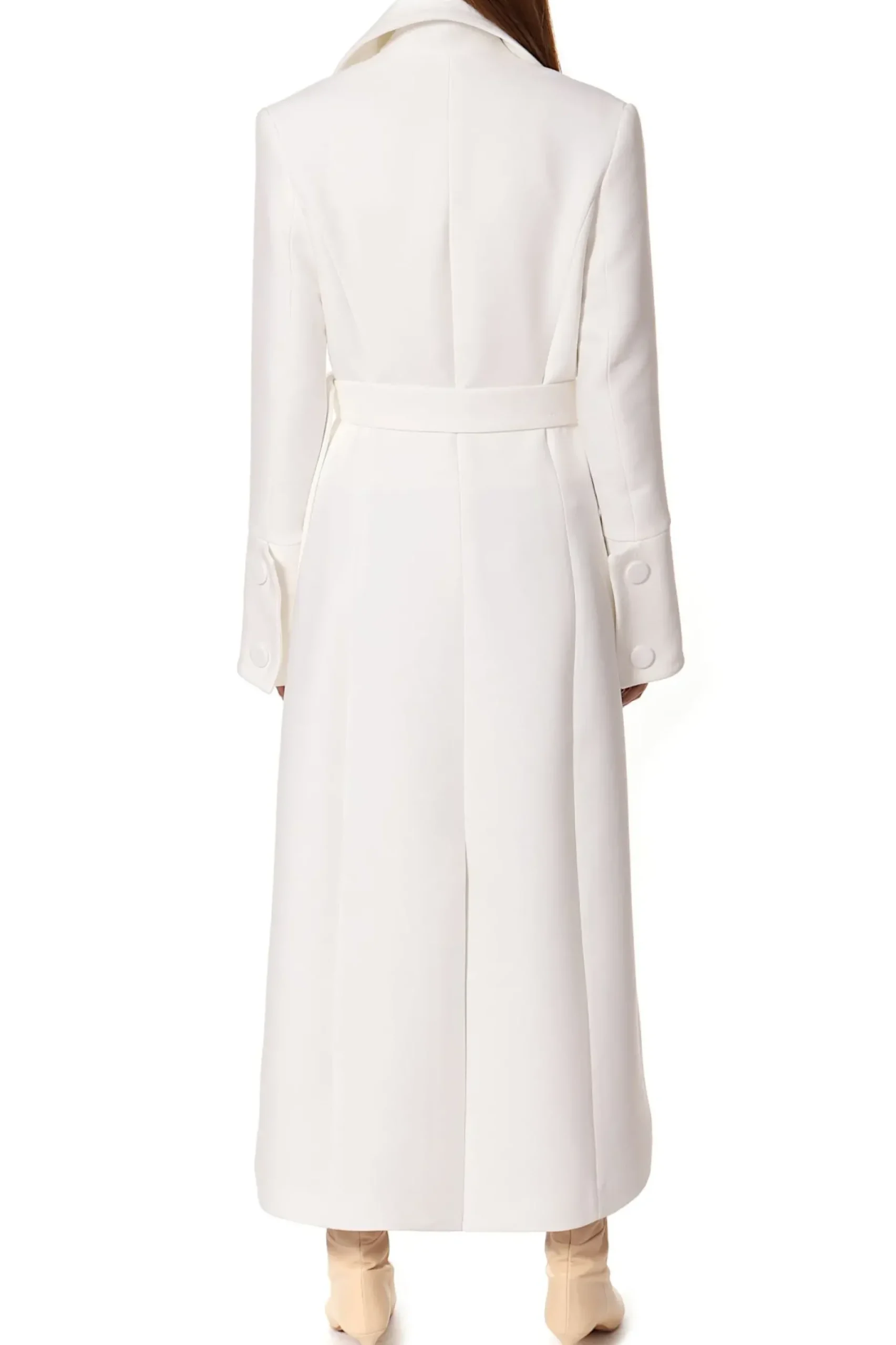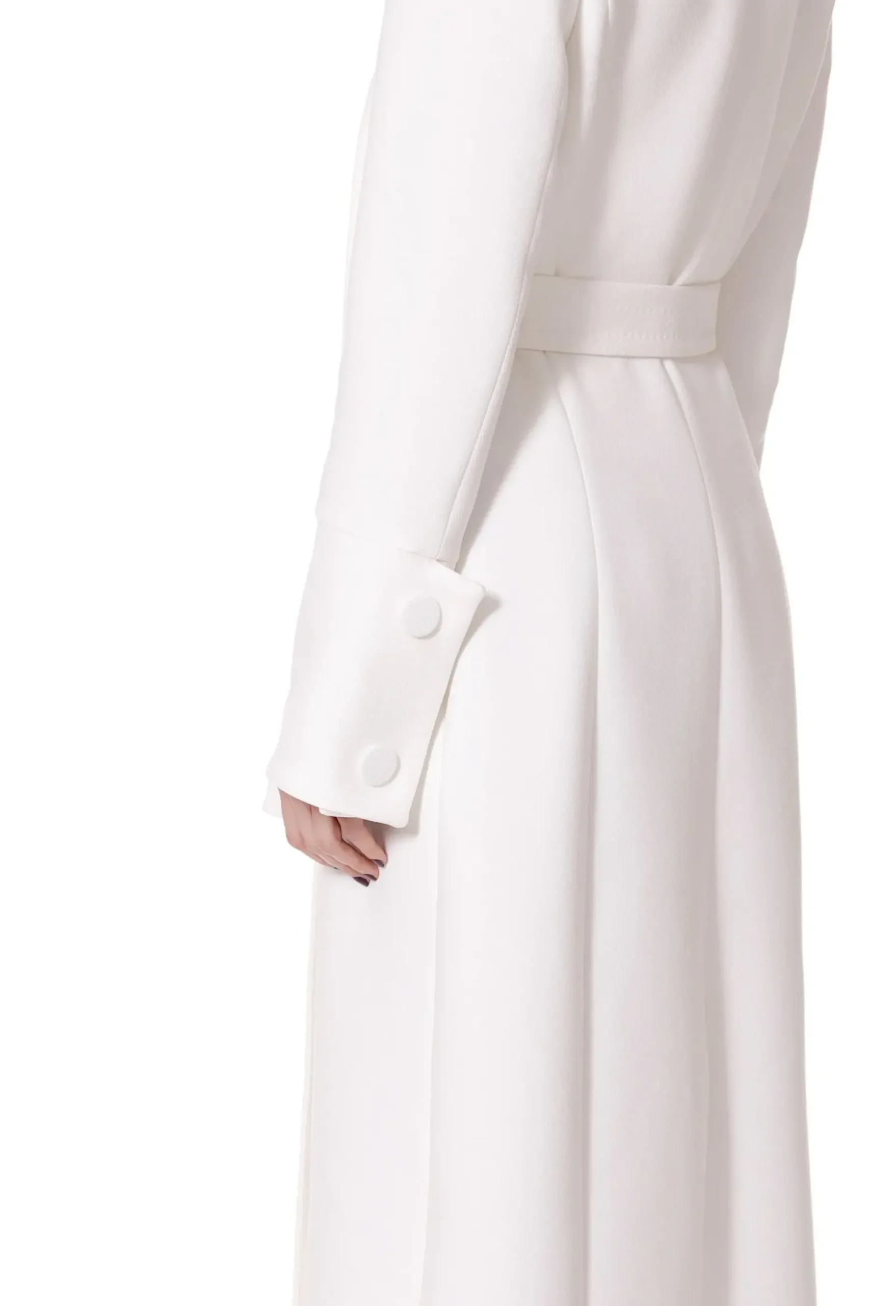 Elegancki Plaszcz Maxi Uszyty Z Miesistego Diagonalu O Sredniej Grubosci. Minimalistyczna, Klasyczna Linia Plaszcza Przelamana Asymetrycznym Wiazaniem W Pasie. Krawiecki Kunszt Uwidoczniony W Cieciach Wysmuklajacych Sylwetke Oraz Ozdobnych Stebnowaniach Na Krawedziech. Dwurzedowe Zapiecie Na Napy Z Zewnatrz Obleczone Tkanina, Po Rozpieciu Widoczne Metalowe Srebrne Elementy Nap Co Nadaje Nowoczesnego Charakteru Projektowi. Plaszcz Nos Mocno Zwiazany Aby Podkreslic Talie Lub Nonszalancko Rozpiety W Wielkomiejskim Stylu
