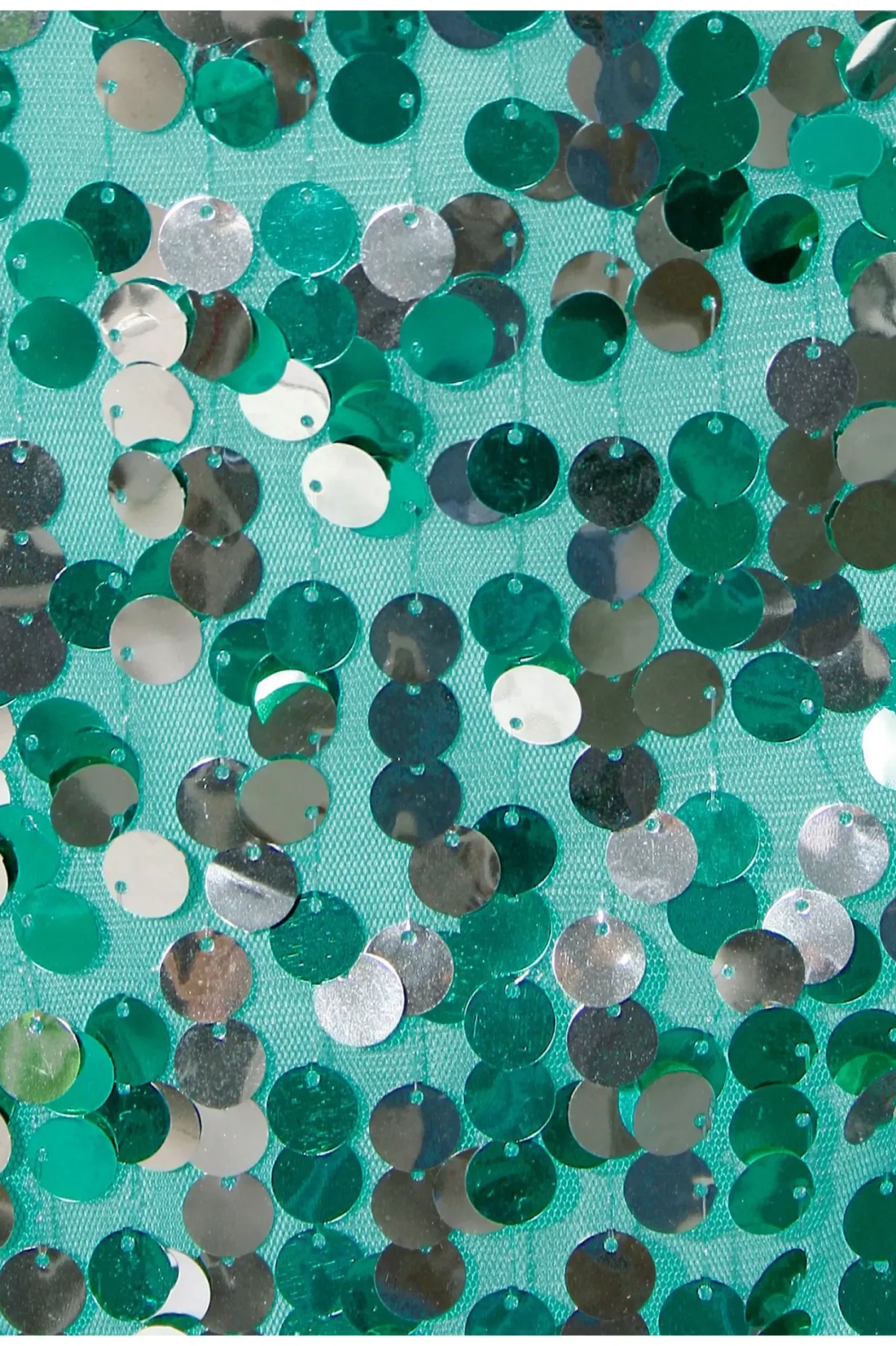 Cekinowa Spodnica Midi Wykonana Z Blyszczacych Dwukolorowych Turkusowo-Srebrnych Ruchomych Pajetek Naszywanych Na Delikatnej Siateczce Podbitej Cienka Zorzeta. Pajetki Poruszaja Sie Przy Ruchu I Tworza „Zywa” Strukture Spodnicy. Wysoki Stan I Dlugosc Midi Przelamana Wysokim Rozcieciem Na Lewym Udzie. Wystylizuj Ja Z Prosta Koszula Lub Tshirtem Dla Kontrastu. Dobierz Do Projektu Minimalistyczne Dodatki I Pozwol Aby Spodnica Zagrala Pierwsza Role W Twojej Stylizacji.