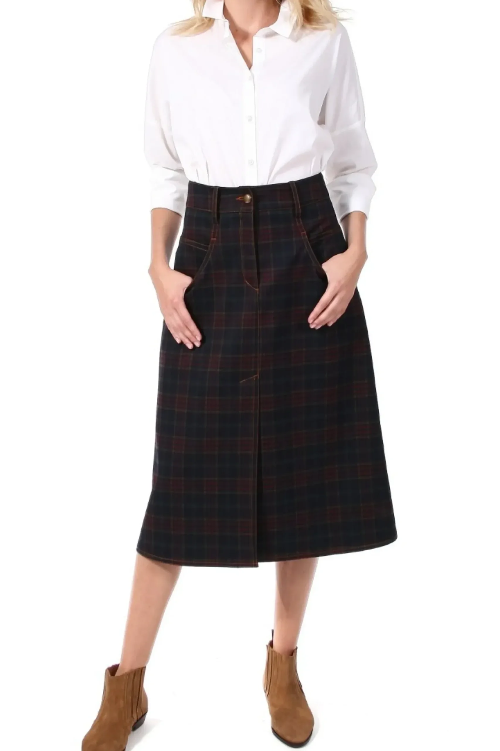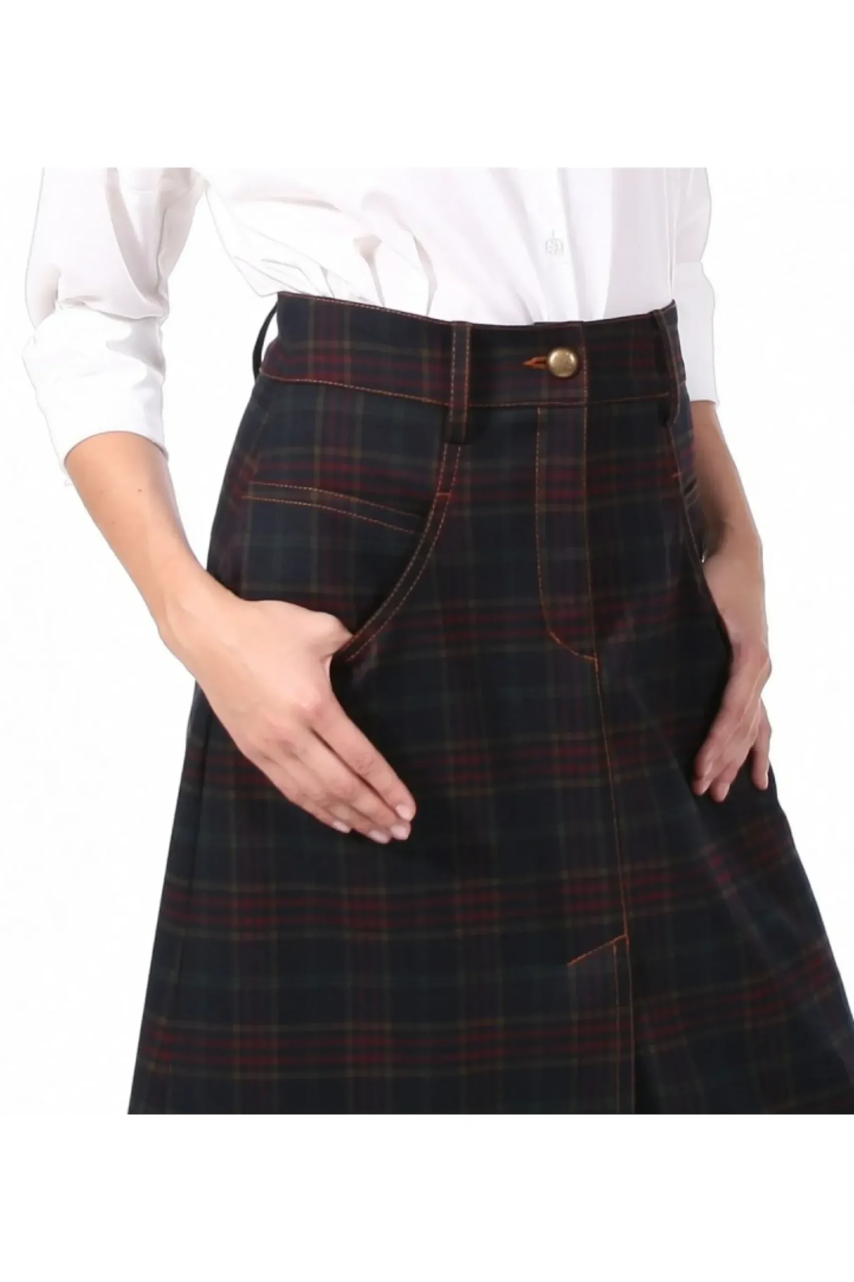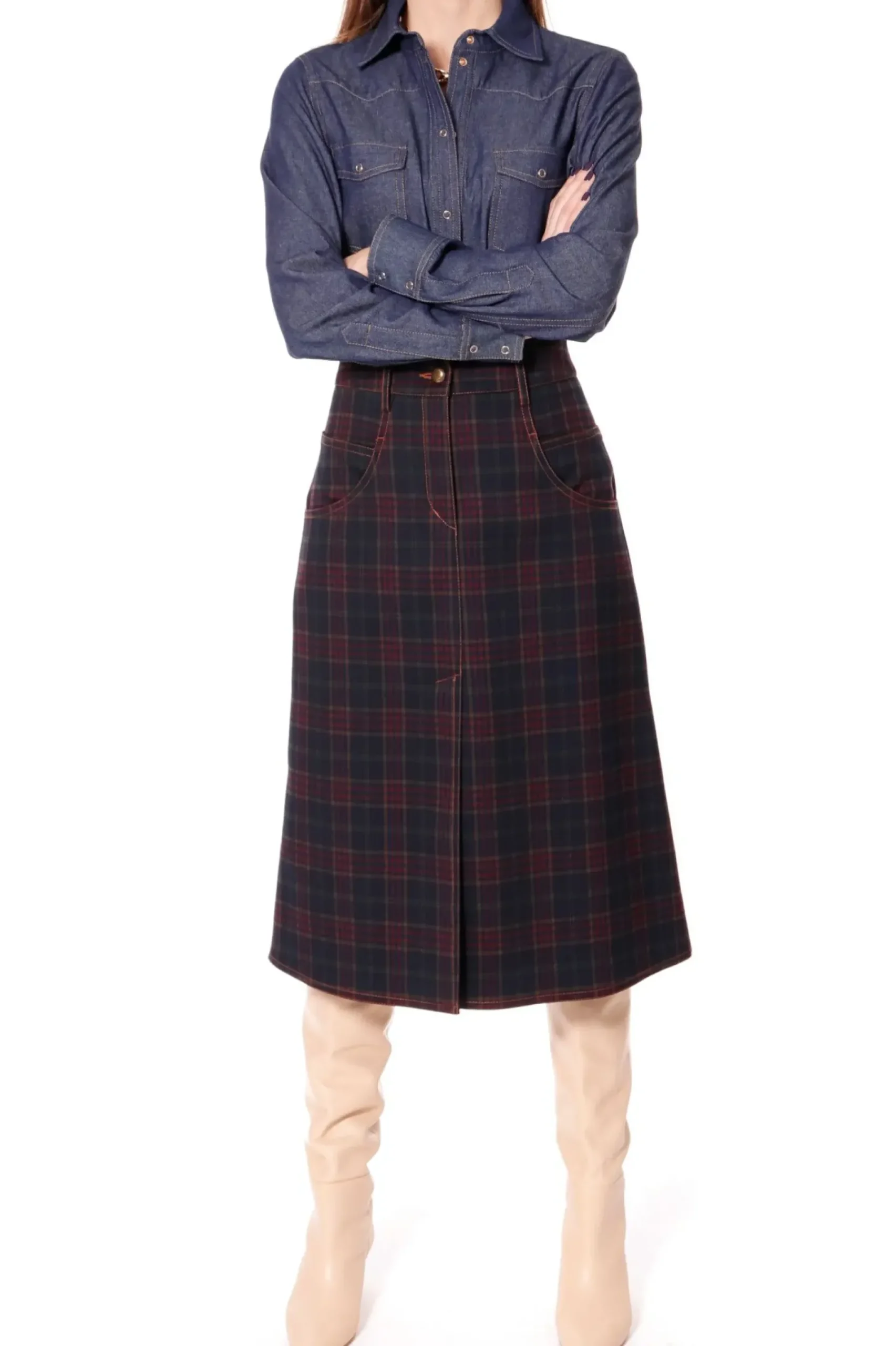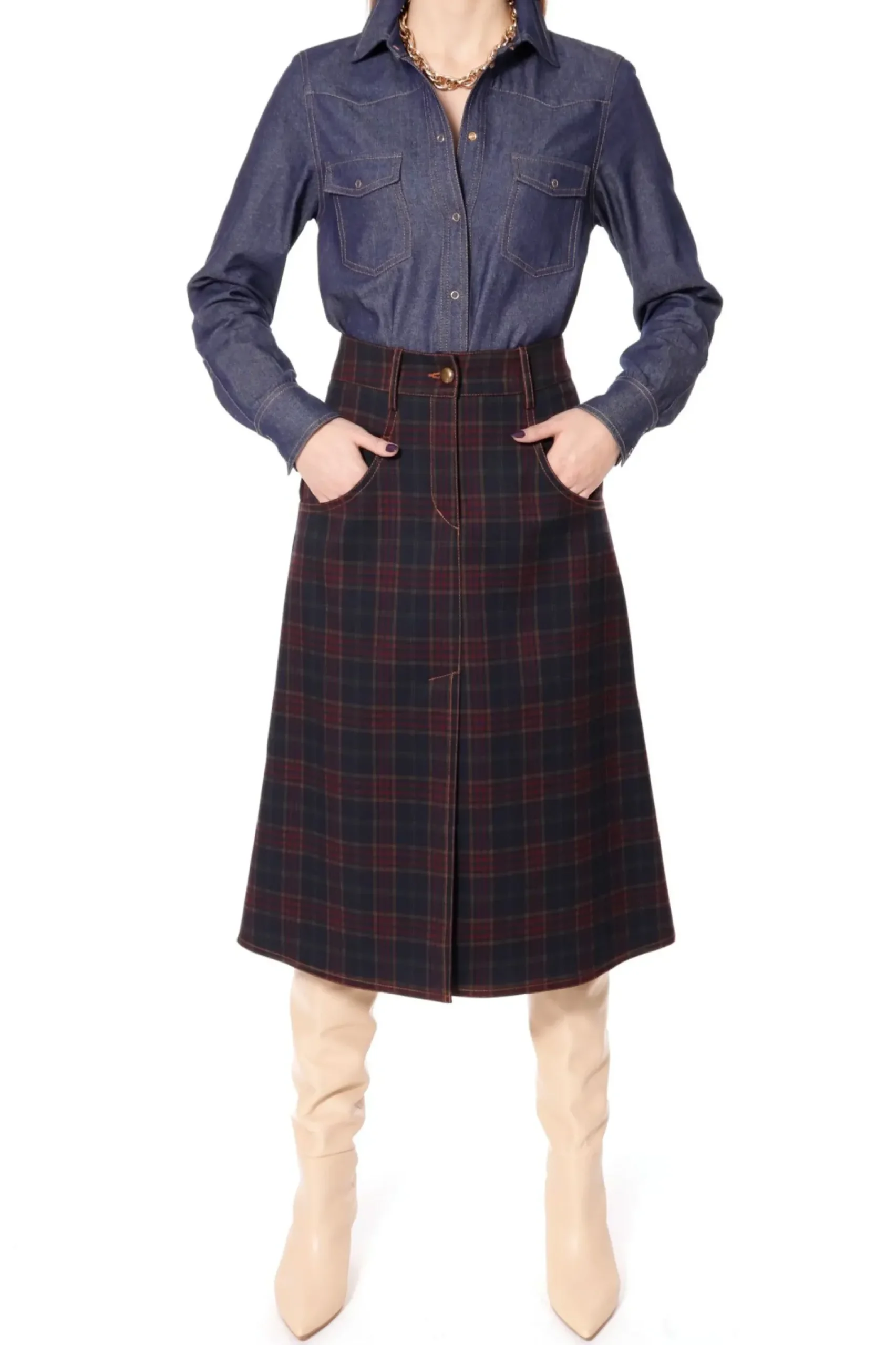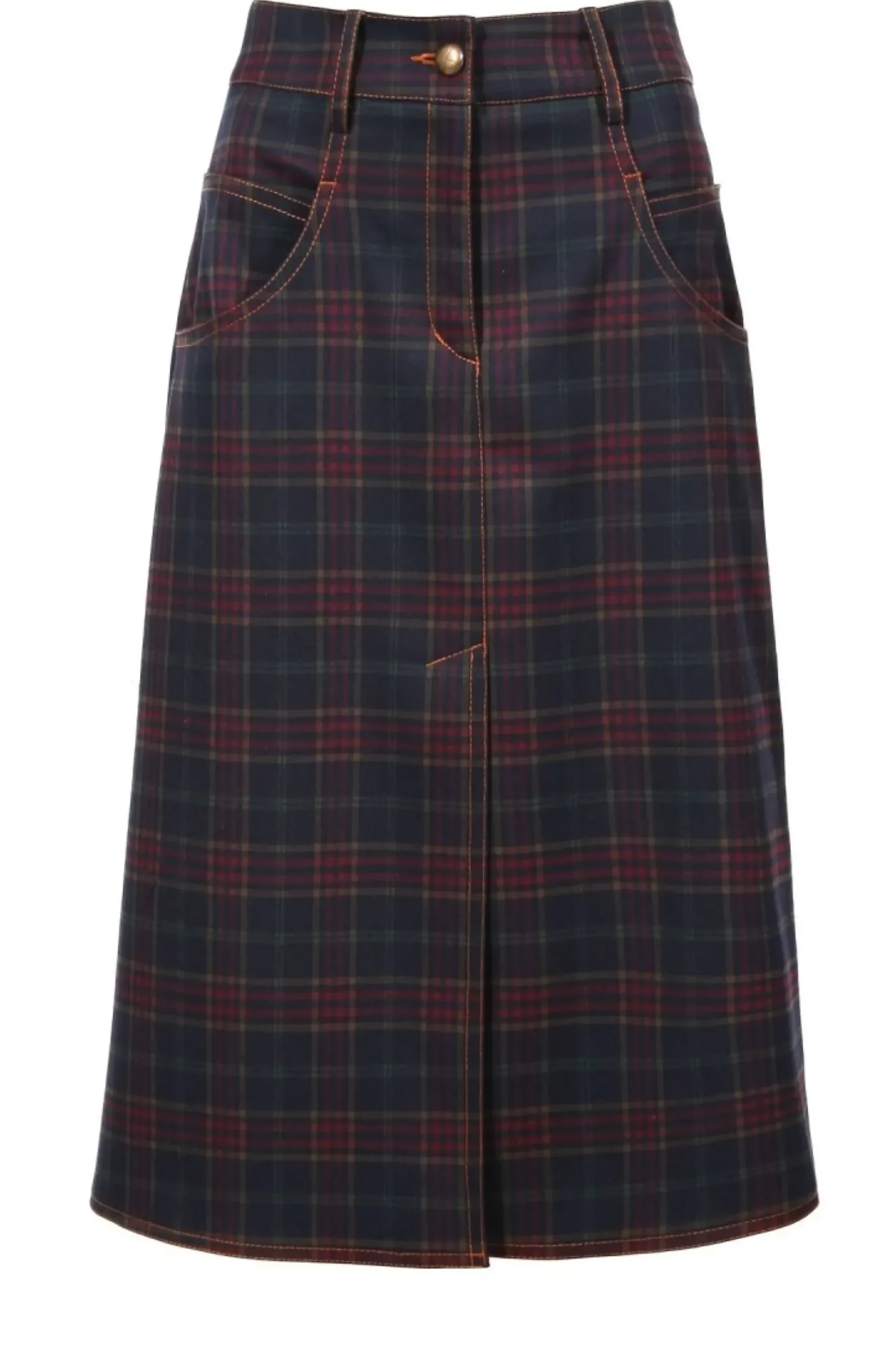 Spodnica Midi O Linii Trapezu Uszyta Z Lekko Usztywnionej Wielokolorowej, Kraciastej Tkaniny. Z Przodu 4 Kieszenie I Zapiecie Charakterystyczne Dla Odziezy Dzinsowej. Ozdobne, Precyzyjne Stebnowania W Kolorze Ciemnopomaranczowym. Zapiecie Na Metalowy Guzik W Kolorze Starego Zlota.