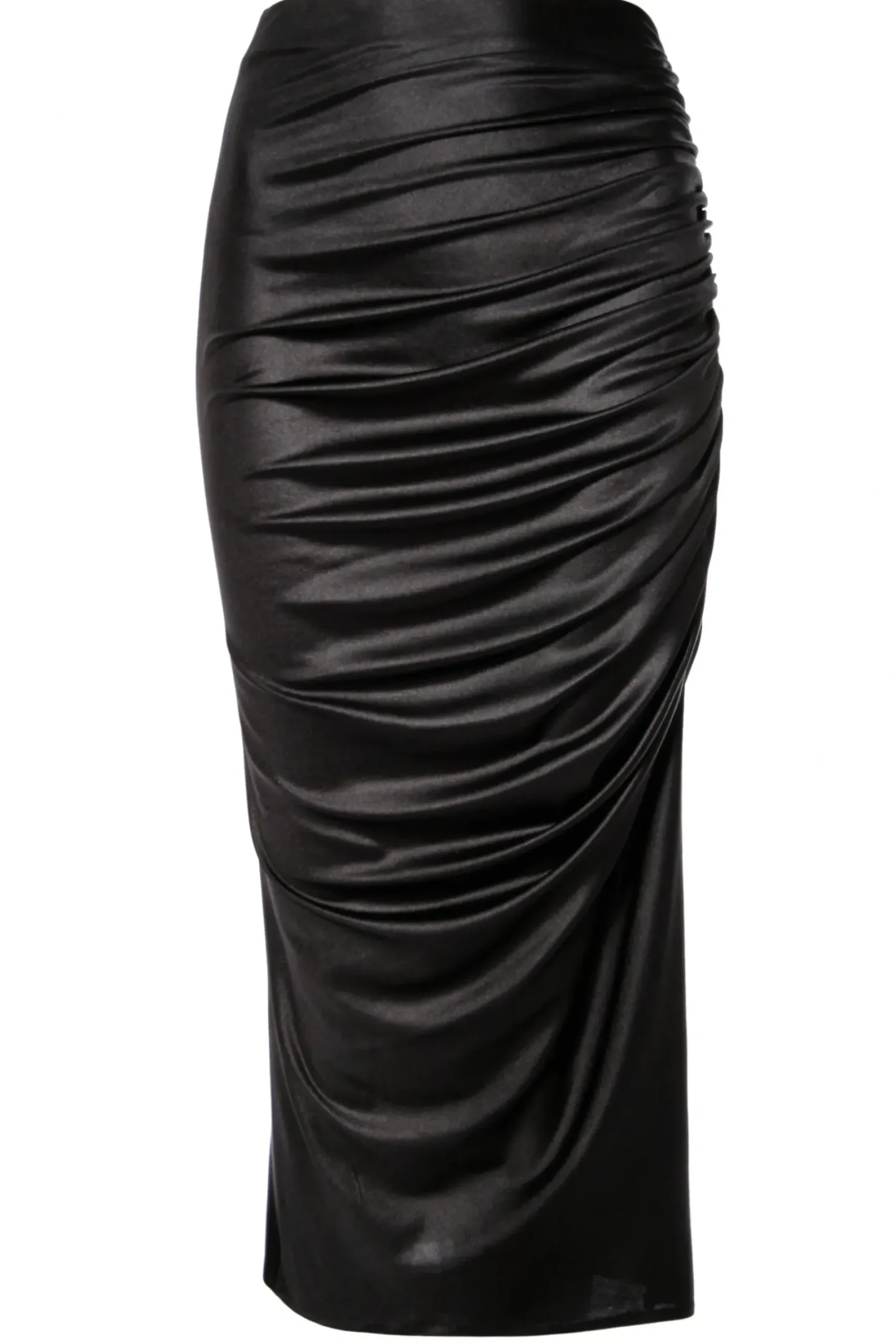 Spodnica Midi Uszyta Z Elastycznego, Miekko Podkreslajacego Sylwetke Materialu O Subtelnym Polysku.Wysokie, Efektowne Mocno Udrapowane Pekniecie Na Lewym Boku Spodnicy. Nos Ja Z Bluzka Dalia Power Black I Wysokimi Szpilkami By Stworzyc Elegancki Wieczorowy Look.