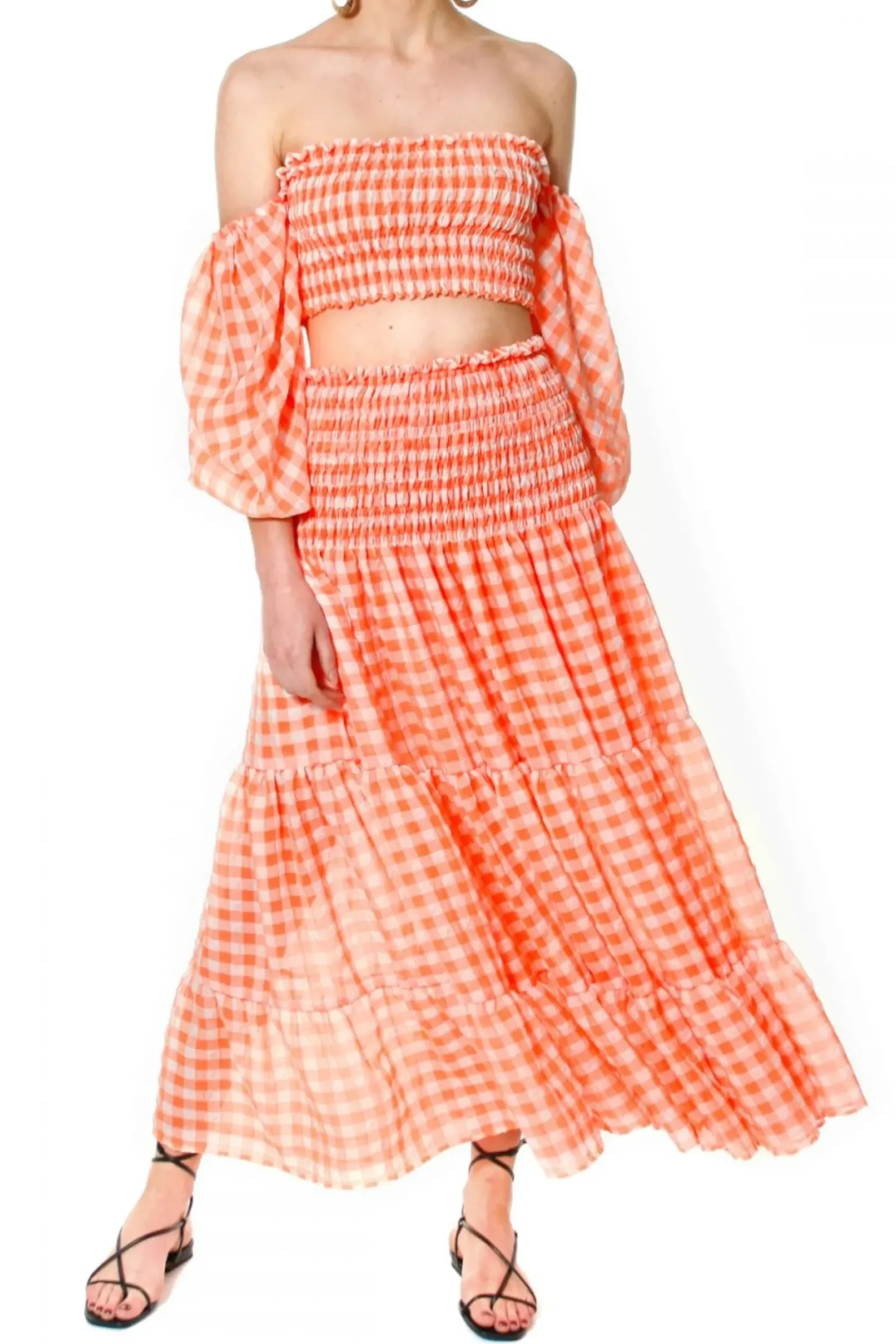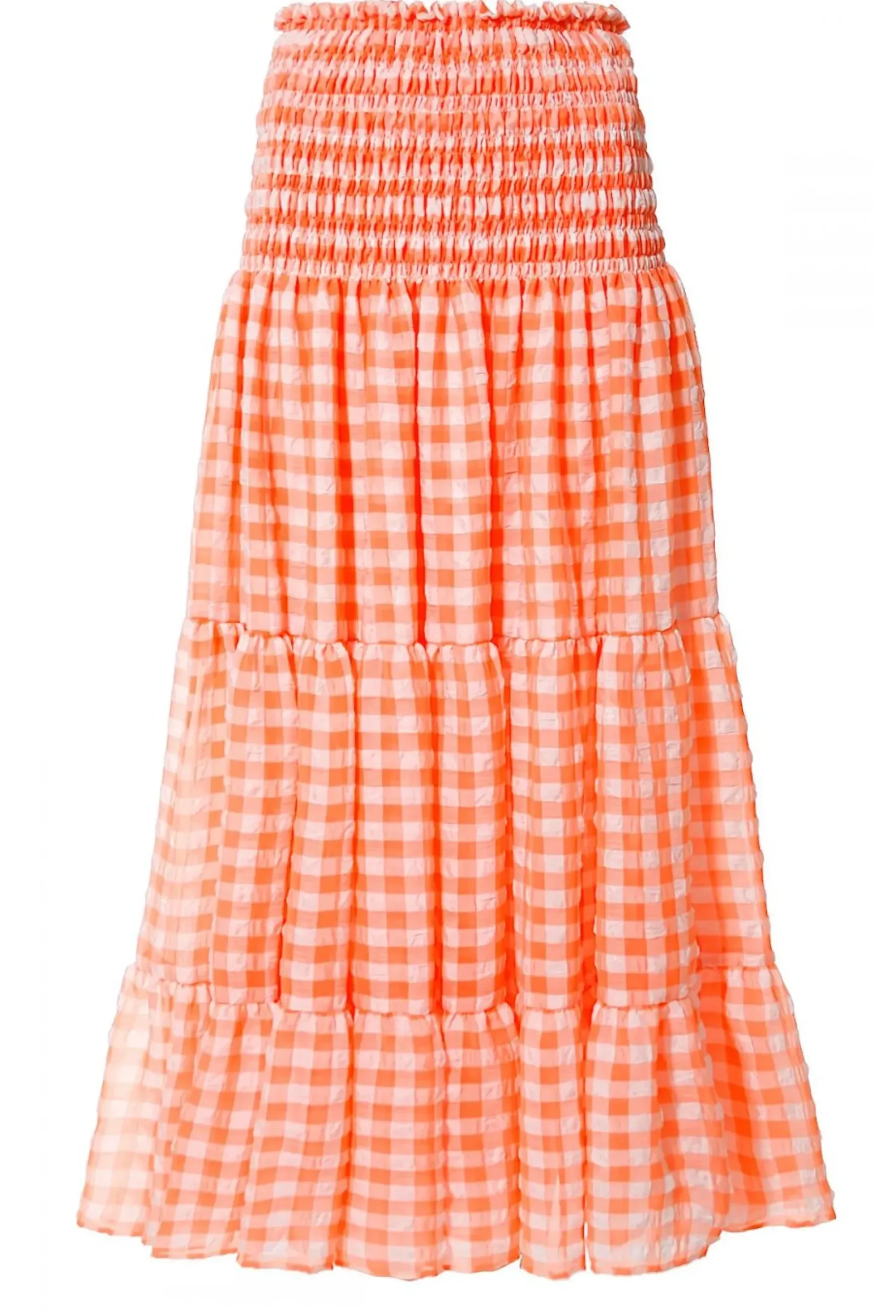 Spodnica Maxi W Kratke Vichy Inspirowana Kreacjami Brigitte Bardot. Uszyta Z Cienkiej, Zwiewnej Lekko Gniecionej Tkaniny. Talia I Biodra Pieknie Podkreslone Gesto Marszczonymi Delikatnymi Gumeczkami. U Dolu Obfite Falbany Miekko Ukladajace Sie Podczas Ruchu.