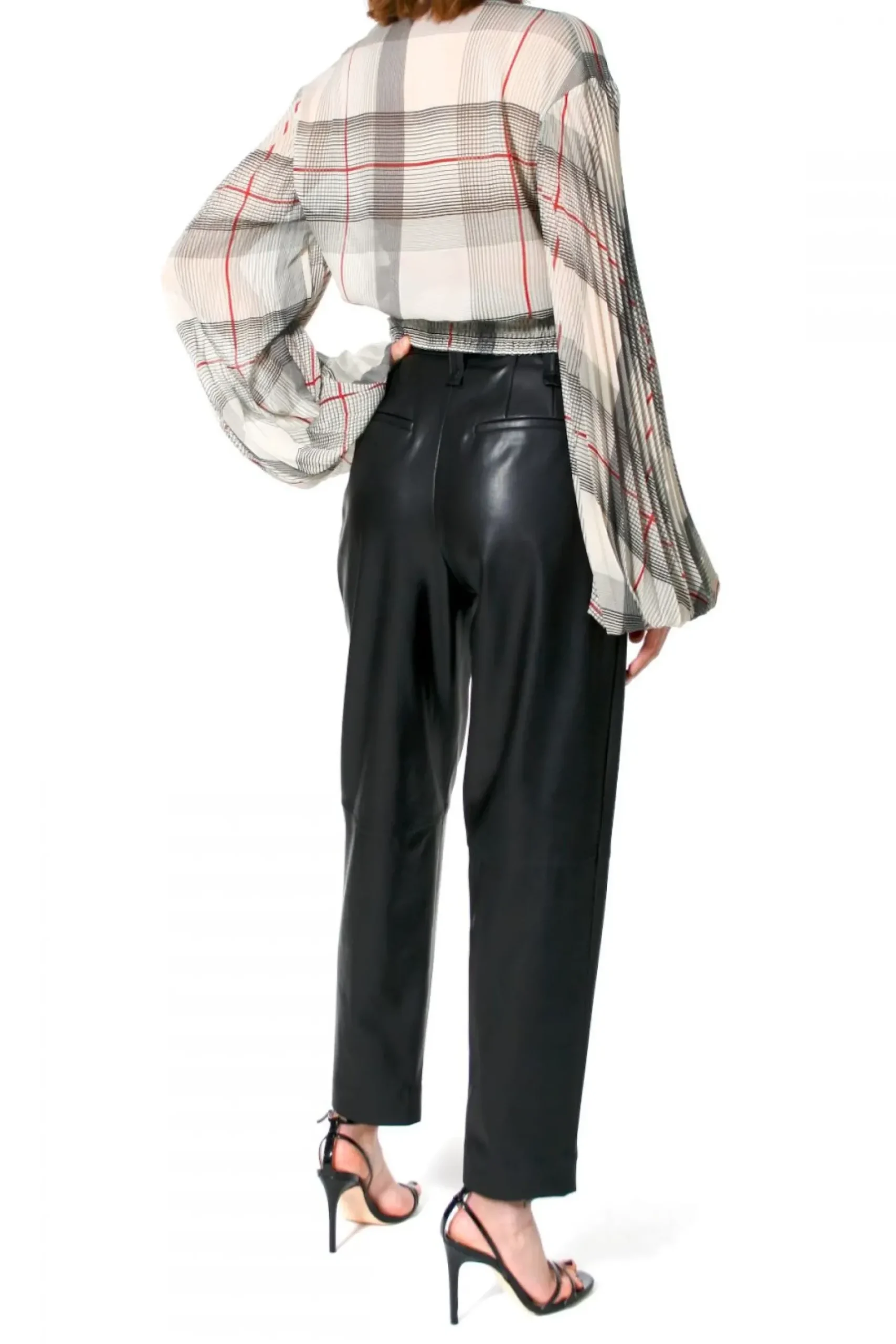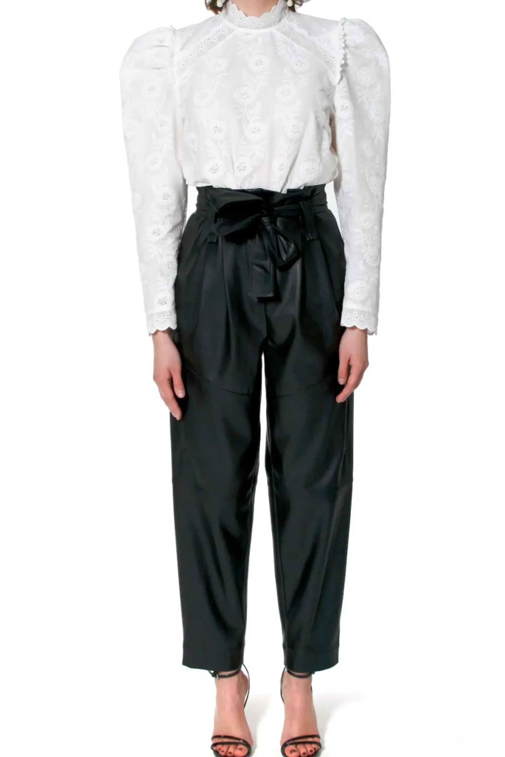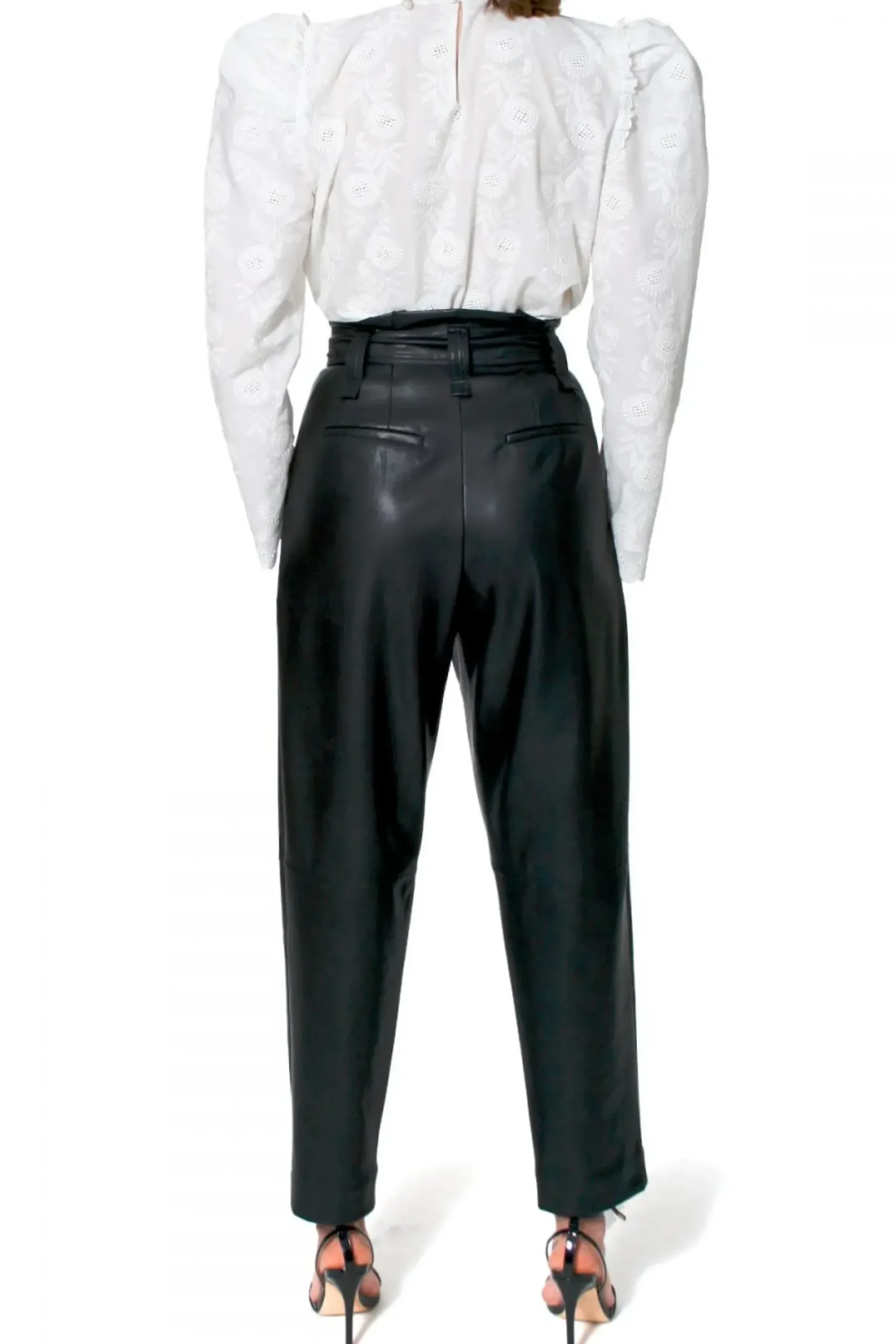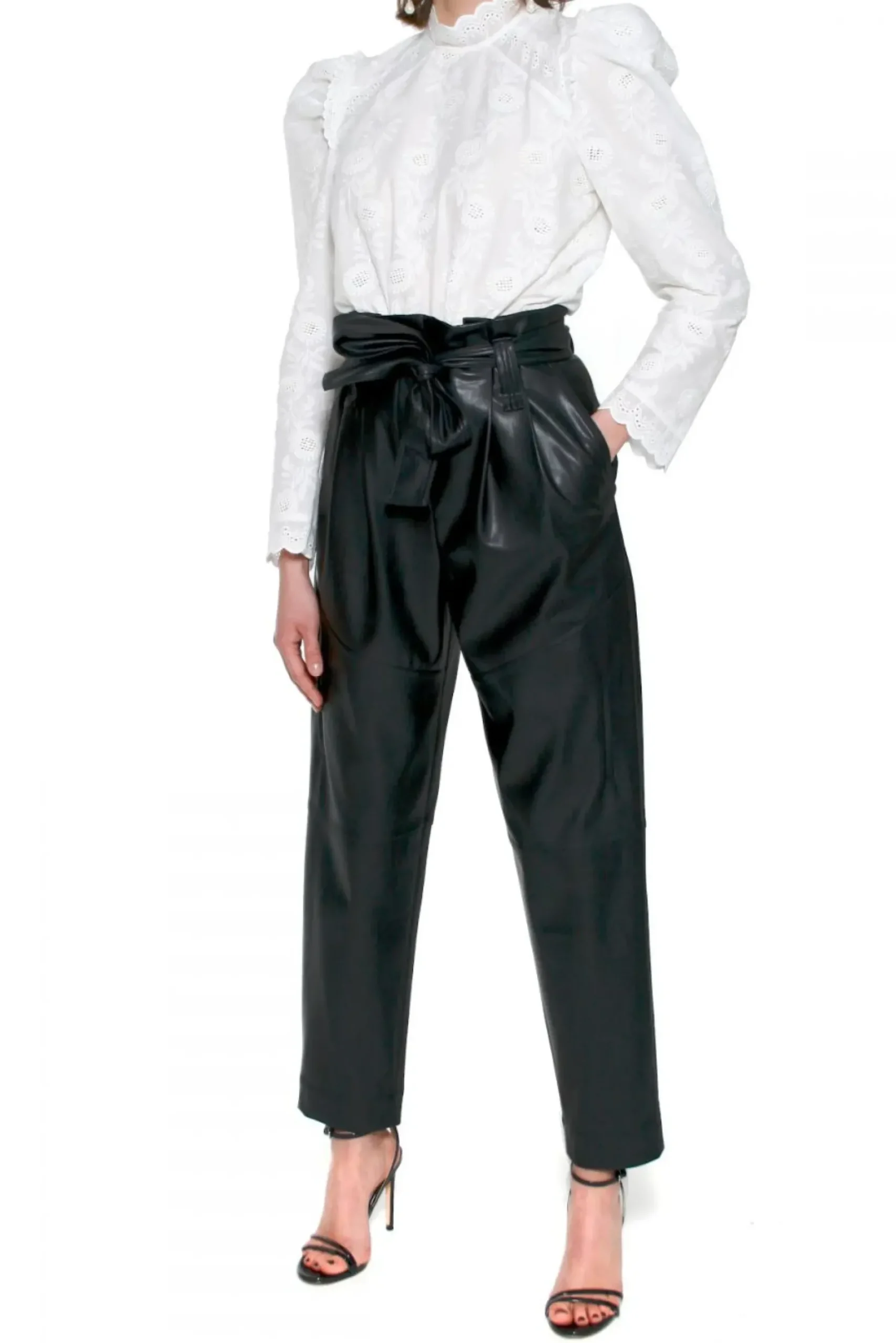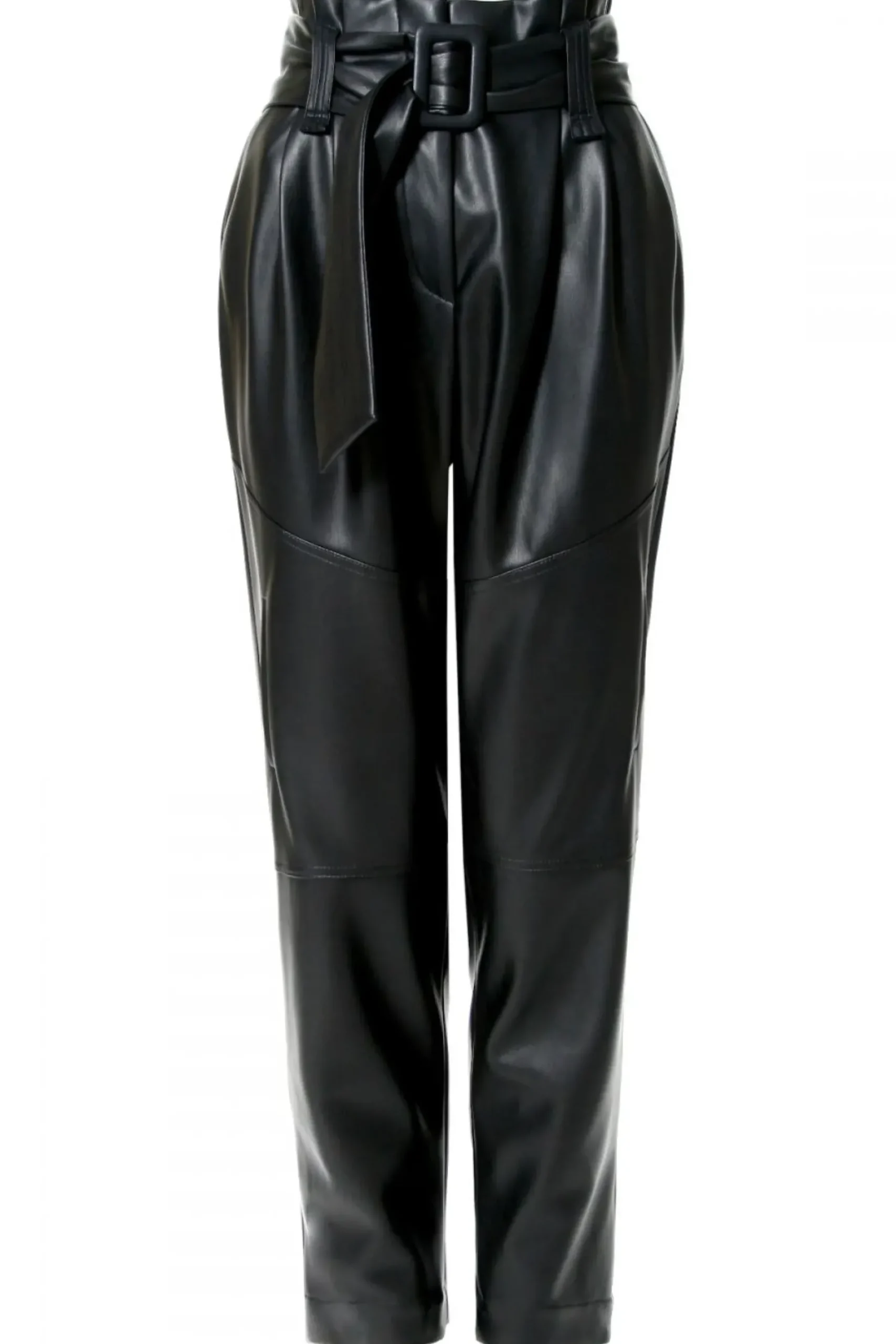 Spodnie Typu Paperbag Uszyte Z Miekkiej, Delikatnej W Dotyku, Wysokogatunkowej Skory Weganskiej. Drobiazgowo Dopracowane Detale W Postaci Ozdobnie Stebnowanych Szlufek. Dwa Wymienne Paski: Efektowny Z Oblekana Klamra Do Eleganckich Stylizacji Oraz Drugi Tradycyjnie Wiazany Na Supel/Kokarde Zmieniajacy Charakter Spodni Na Bardziej Codzienny. Wygodne Boczne Kieszenie Oraz Ciete Kieszonki Z Wypustka Na Posladkach Oraz Dodatkowo Z Przodu Na Nogawkach. Skosne Ciecia I Stebnowania W Linii Kolan. Wysoki Stan Z Zakladkami Na Przodzie I Modelujacymi Talie Zaszewkami Tylnimi. Luzna Linia Nogawek Z Mozliwoscia Wywiniecia W Celu Skrocenia Nogawek Badz Nadania Stylizacji Bardziej Nonszalanckiego Charakteru. Ten Bardzo Modowy Projekt Spodni Swietnie Komponuje Sie Ze Szpilkami, Krotkimi Botkami Lub Wpuszczony Do Wysokich Kozakow.