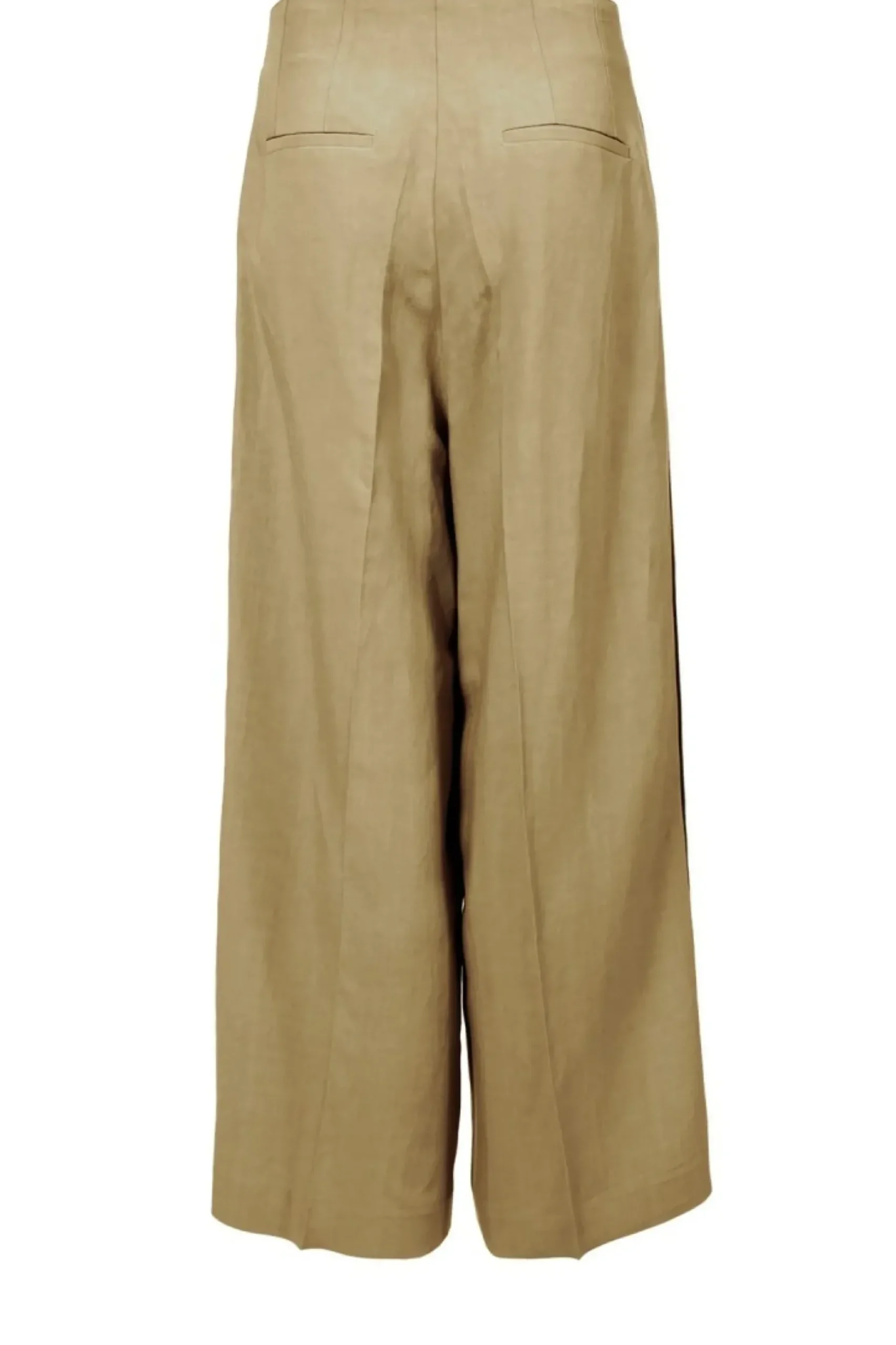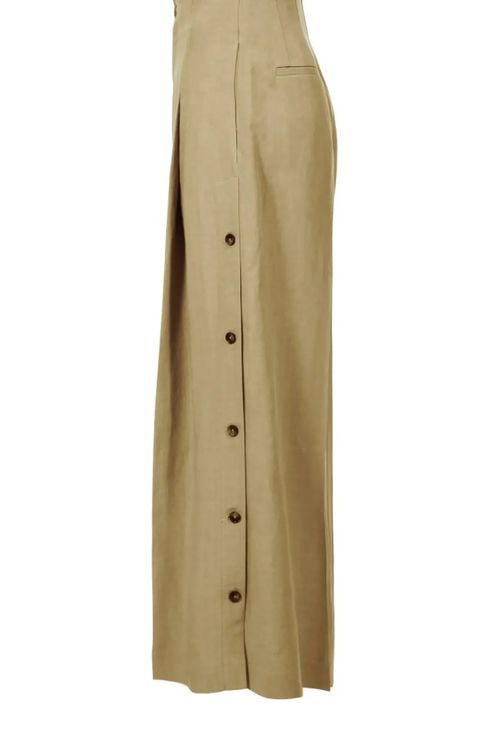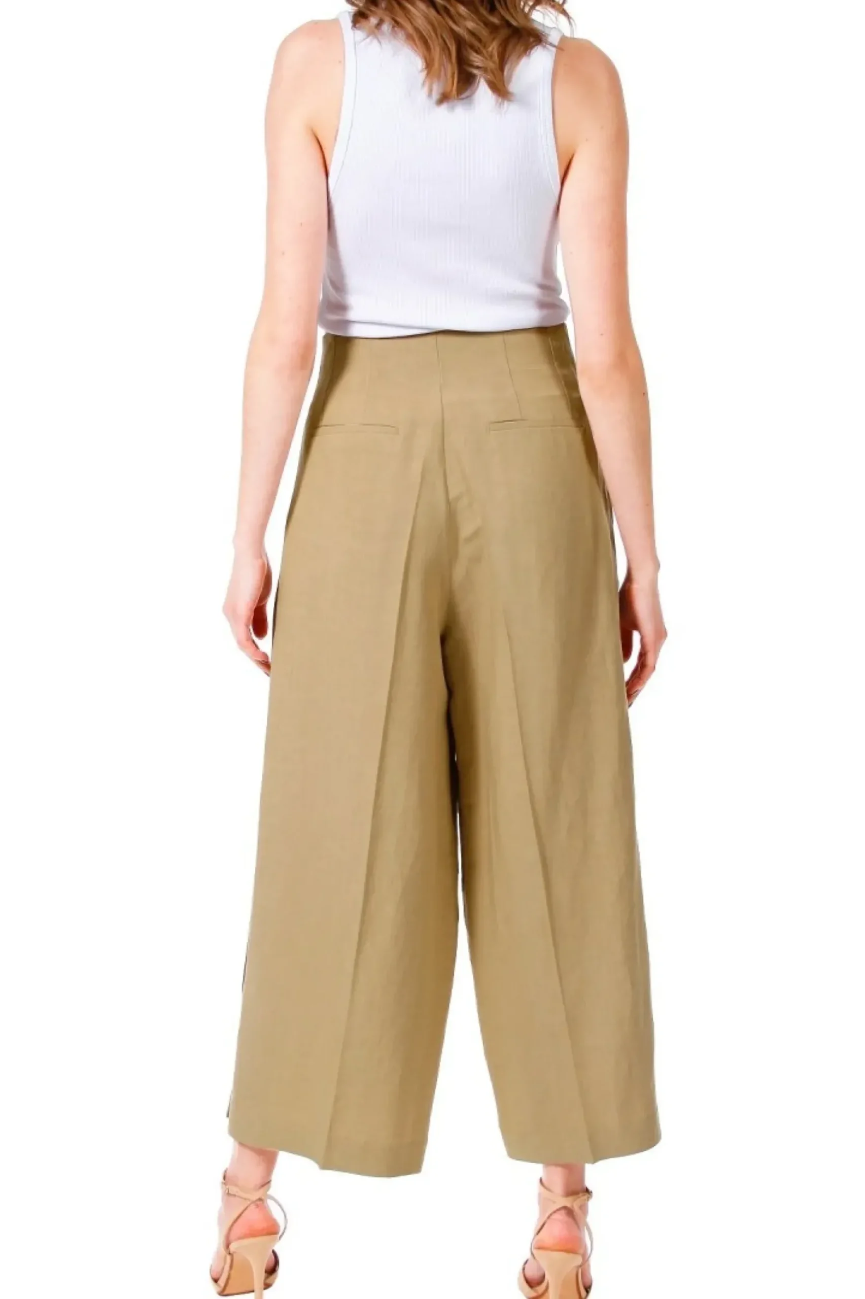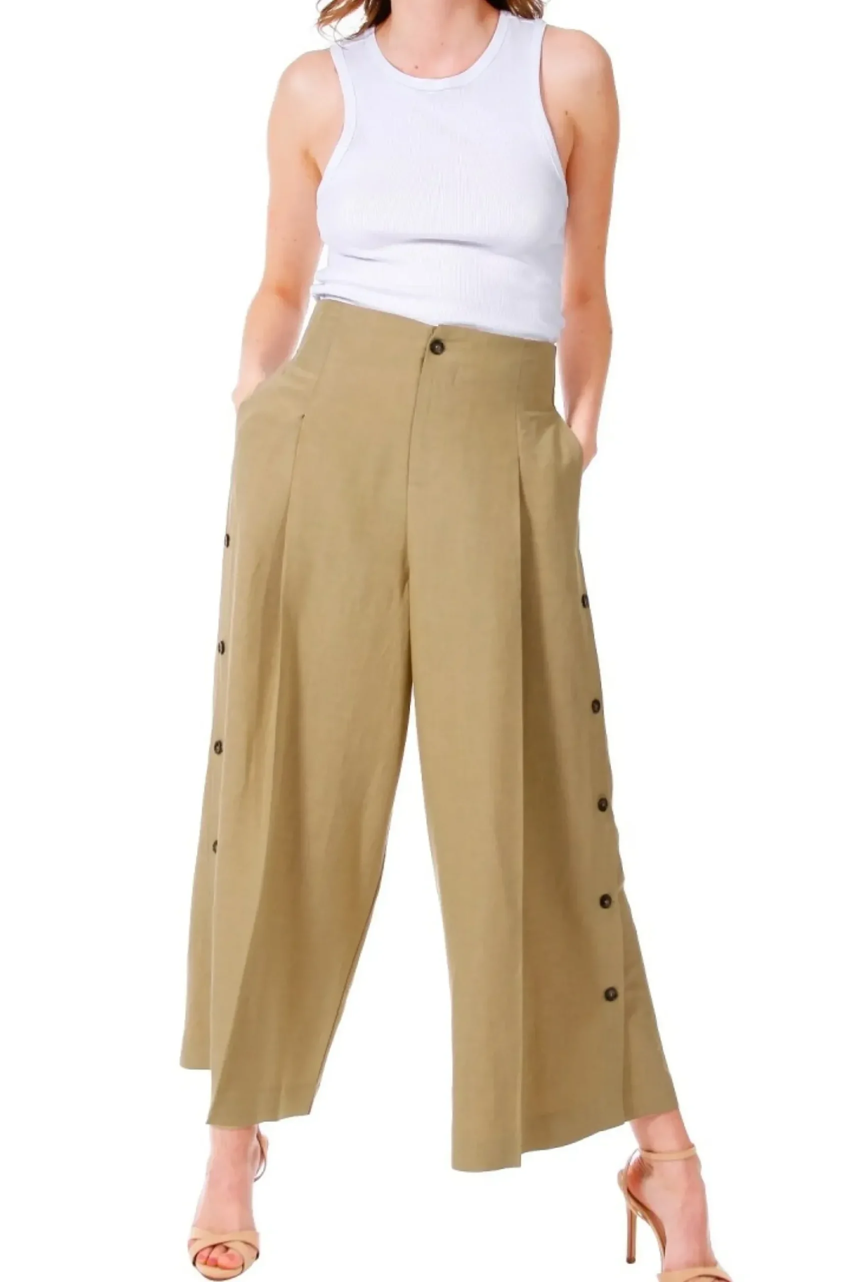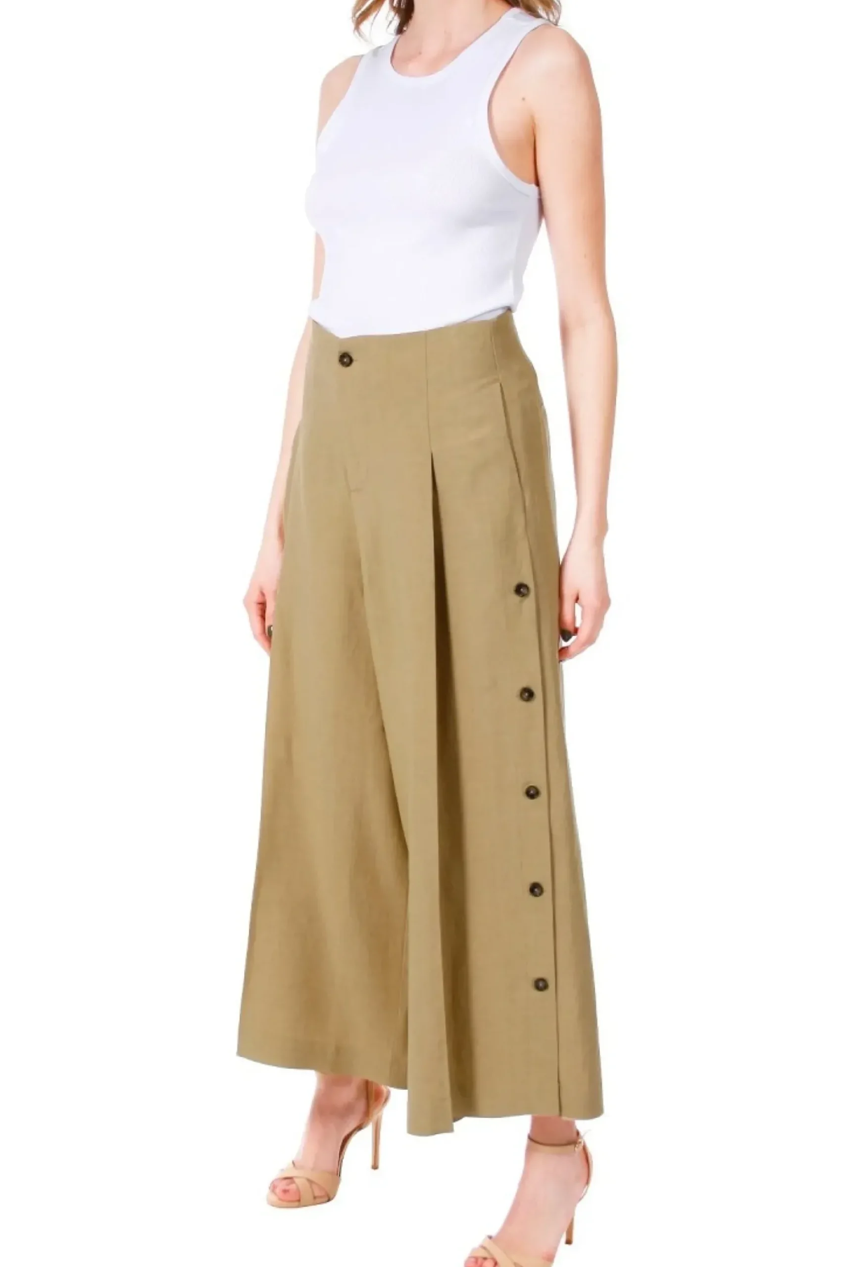 Lniane Spodnico-Spodnie, W Jezyku Francuskim Nazywane Culottes. Fason O Wysokiej Talli. Szerokie Nogawki Zapinane Na Szylkretowe Guziki – Mozliwosc Regulacji Wysokosci Rozpiecia Pozwalajaca Eksponowac Nogi. W Szwach Bocznych Wygodne Kieszenie. Swietnie Wspolgraja Z Sandalami Na Klocku, Espadrylami Czy Wygodnymi Sneakersami.
