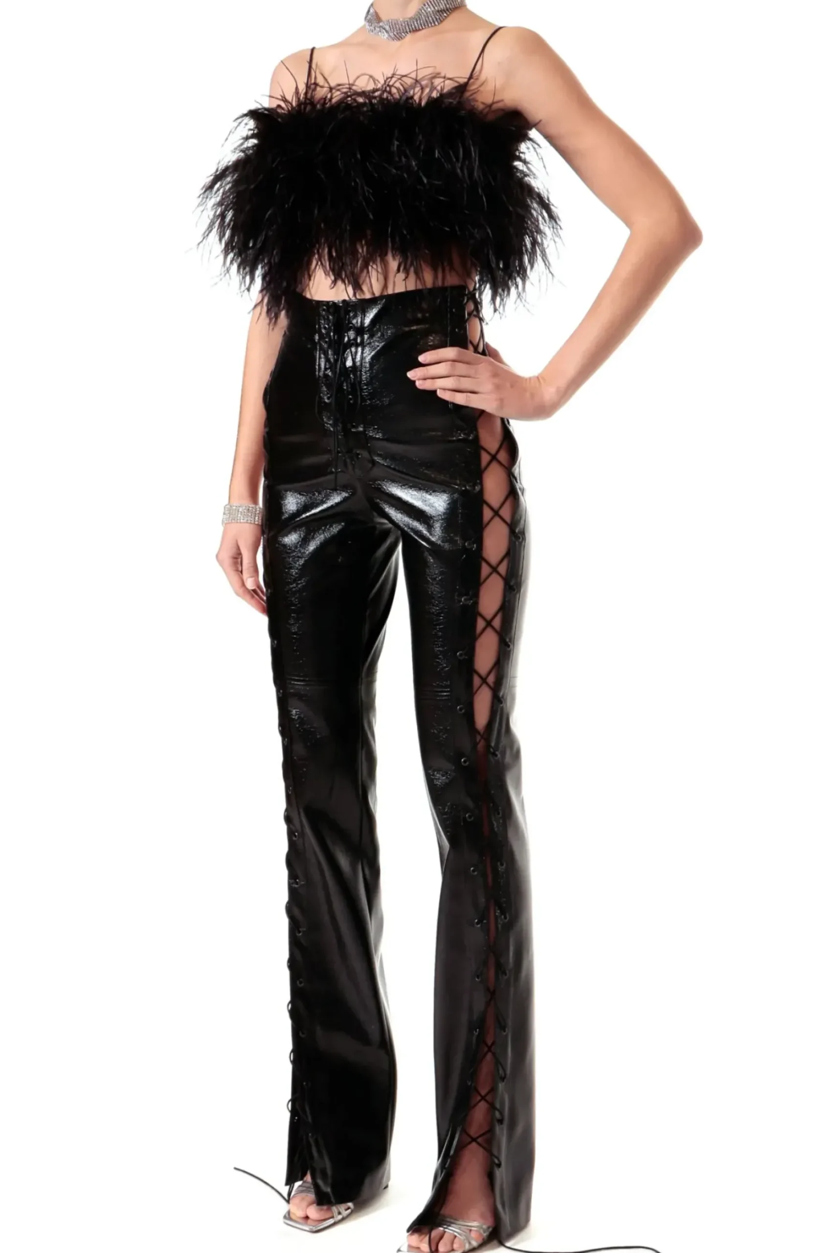 Spodnie Uszyte Z Lakierowanej Skory Weganskiej. Dluzsze Nogawki Maksymalnie Wydluzaja Optycznie Nogi. Sznurowane Rozciecia Wzdluz Nogawek I Bioder Zmyslowo Eksponuja Cialo. Nos Je Do Sandalow Na Wysokim Obcasie.