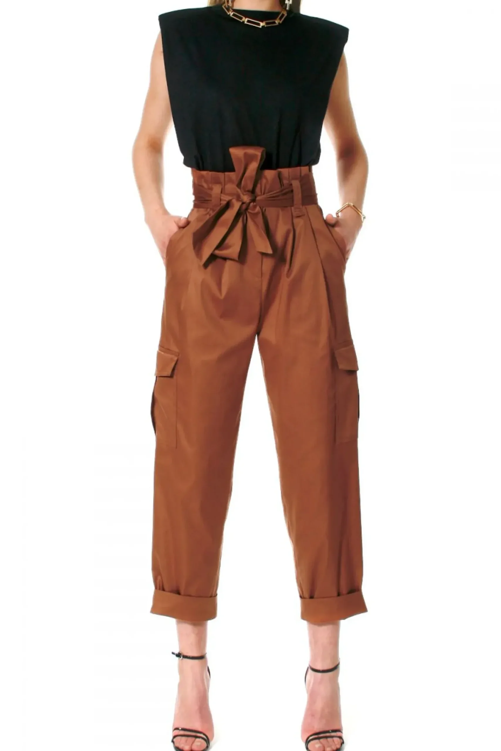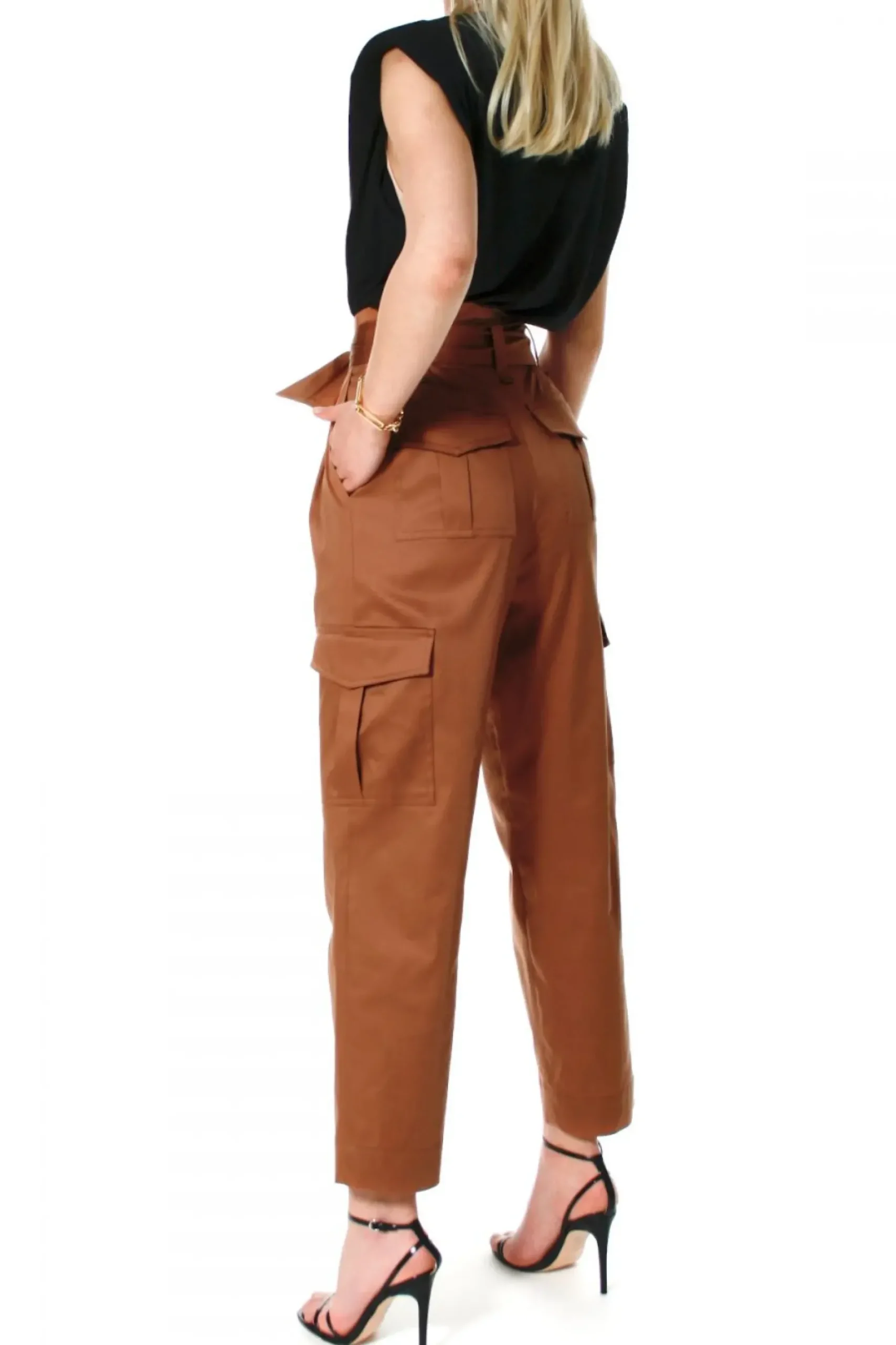 Spodnie Z Talia Typu Paper Bag W Klimacie Miejskiego Safari. Wysoka Talia Z Kontrafaldami Z Przodu; Z Tylu Dopasowanie Do Sylwetki Modelujacymi Zaszewkami. Efektowne, Duze Kieszenie Z Patkami Na Udach Oraz Nieco Mniejsze Na Posladkach. Pasek- Szarfa Przeciagniety W Szerokich Szlufkach Wiazany Na Supel Z Kokarda. Uszyte Z Cienszej Lecz Lekko Sztywnej Bawelny O Delikatnym Blysku Z Dodatkiem Elastanu. Na Letni Wieczor Zaloz Do Nich Sandaly Na Wysokim Obcasie Lub Sneakersy Do Codziennej Stylizacji.