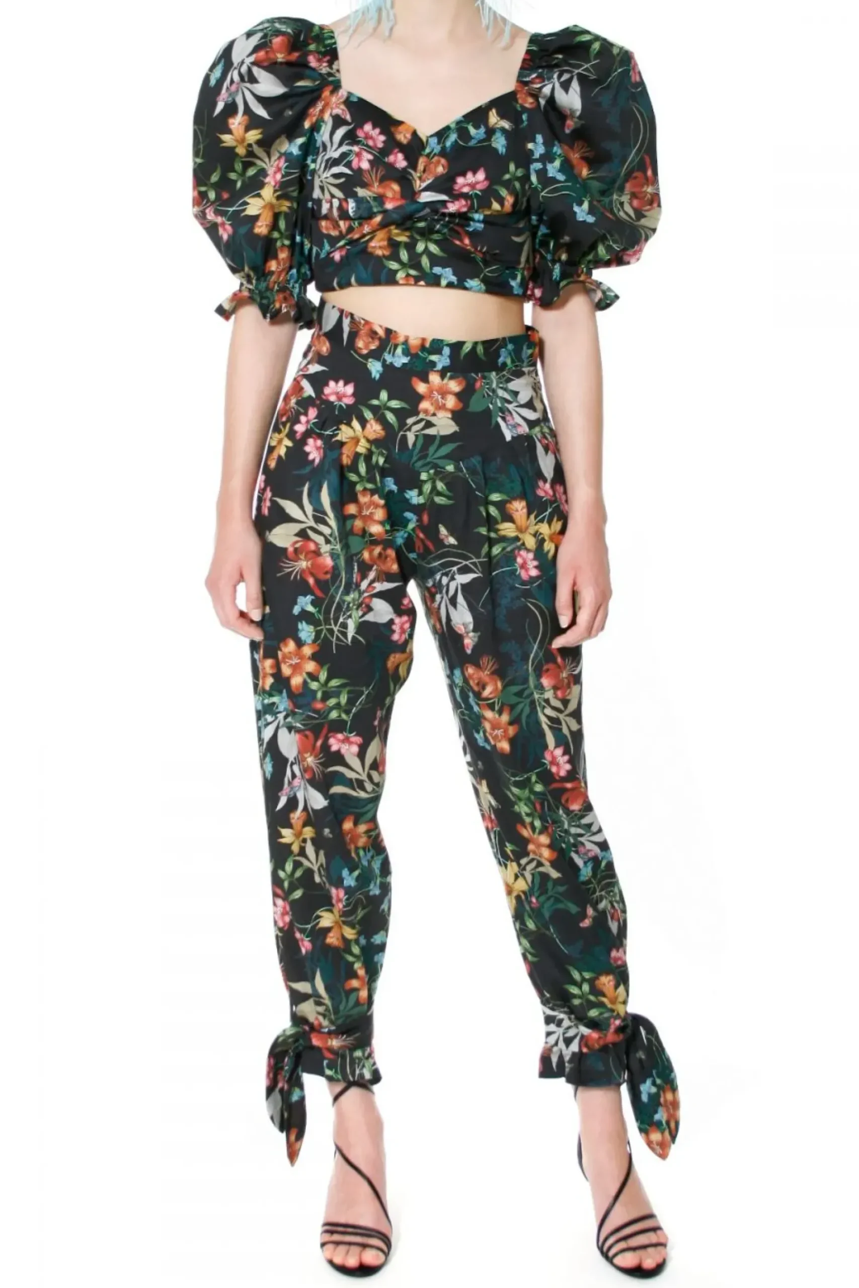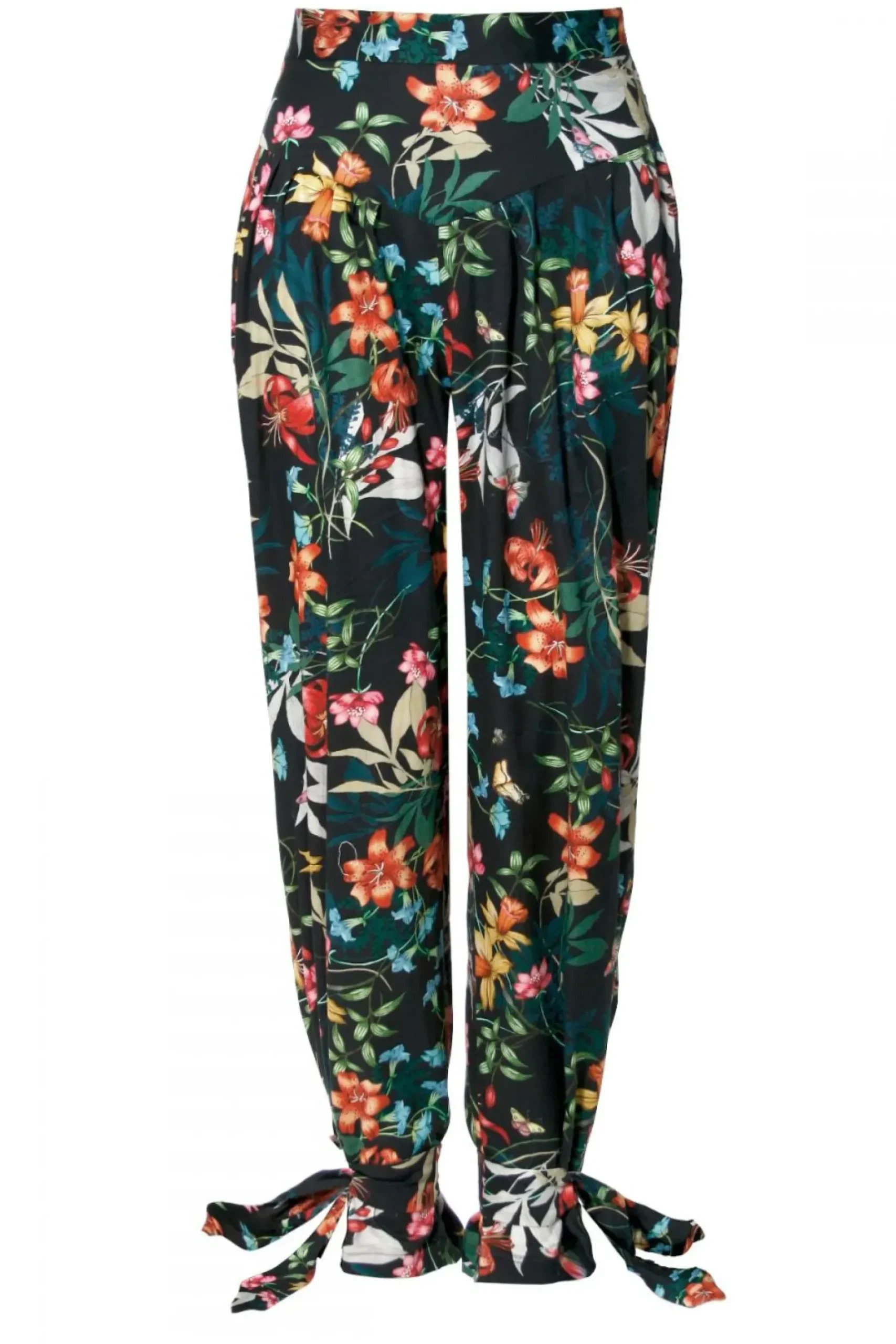 Spodnie Z Wysoka Talia I Karczkiem Uszyte Ze 100% Bawelny O Subtelnym Satynowym Wykonczeniu W Przyciagajacy Wzrok Wielobarwny Desen Kwiatowo-Florystyczny.