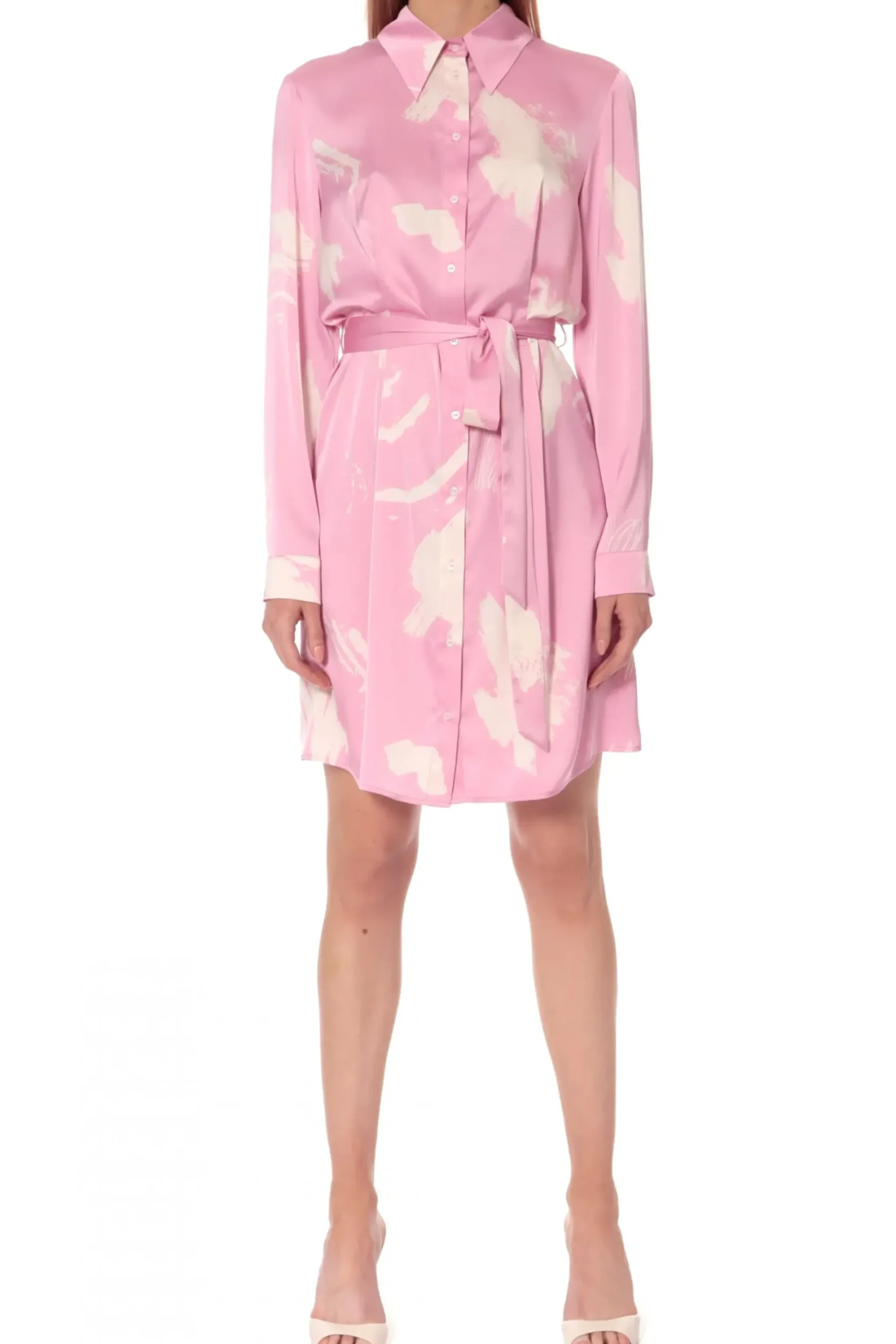 Koszulowa Sukienka Mini Z Dlugim Rekawem. Wykonana Z Delikatnego Materialu W Nieregularny Rozowo-Bialy Print. Z Klasycznym Kolnierzem Oraz Mankietami. Wiazana Paskiem. Idealna Sukienka Na Lato, Sprawdzi Sie Do Kazdej Stylizacji.