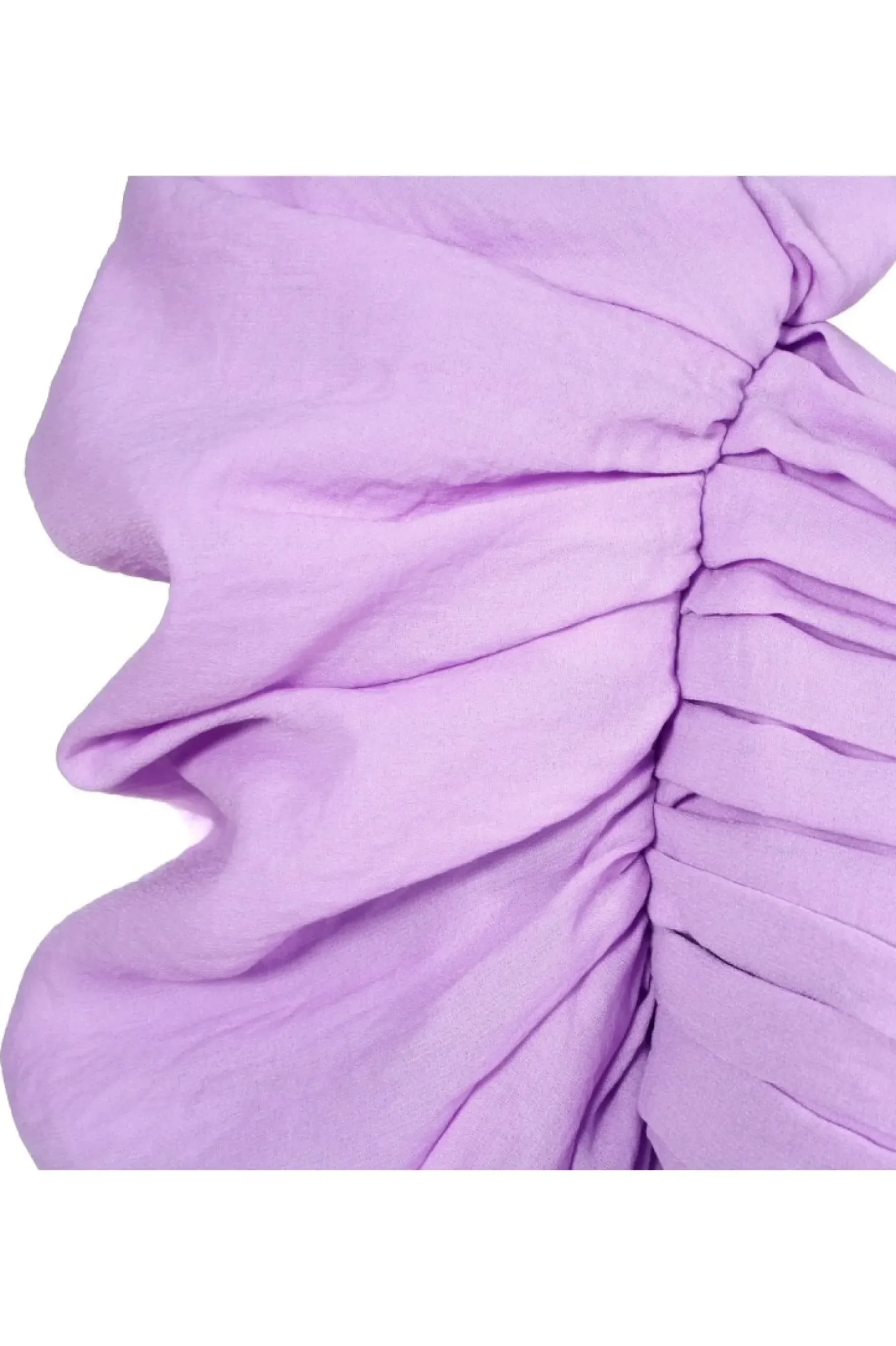 Wyjatkowa, Oszalamiajaca Kreacja. Asymetryczna Sukienka W Lawendowym Kolorze. Futurystyczny, Mocno Zaakcentowany Rekaw Z Bufka Oraz Zalotna Falbanka Na Lewym Udzie Stanowia O Odwaznej Linii Projektu. Kazdy Egzemplarz Jest Recznie, Pojedynczo Drapowany W Pracowni W Krakowie.