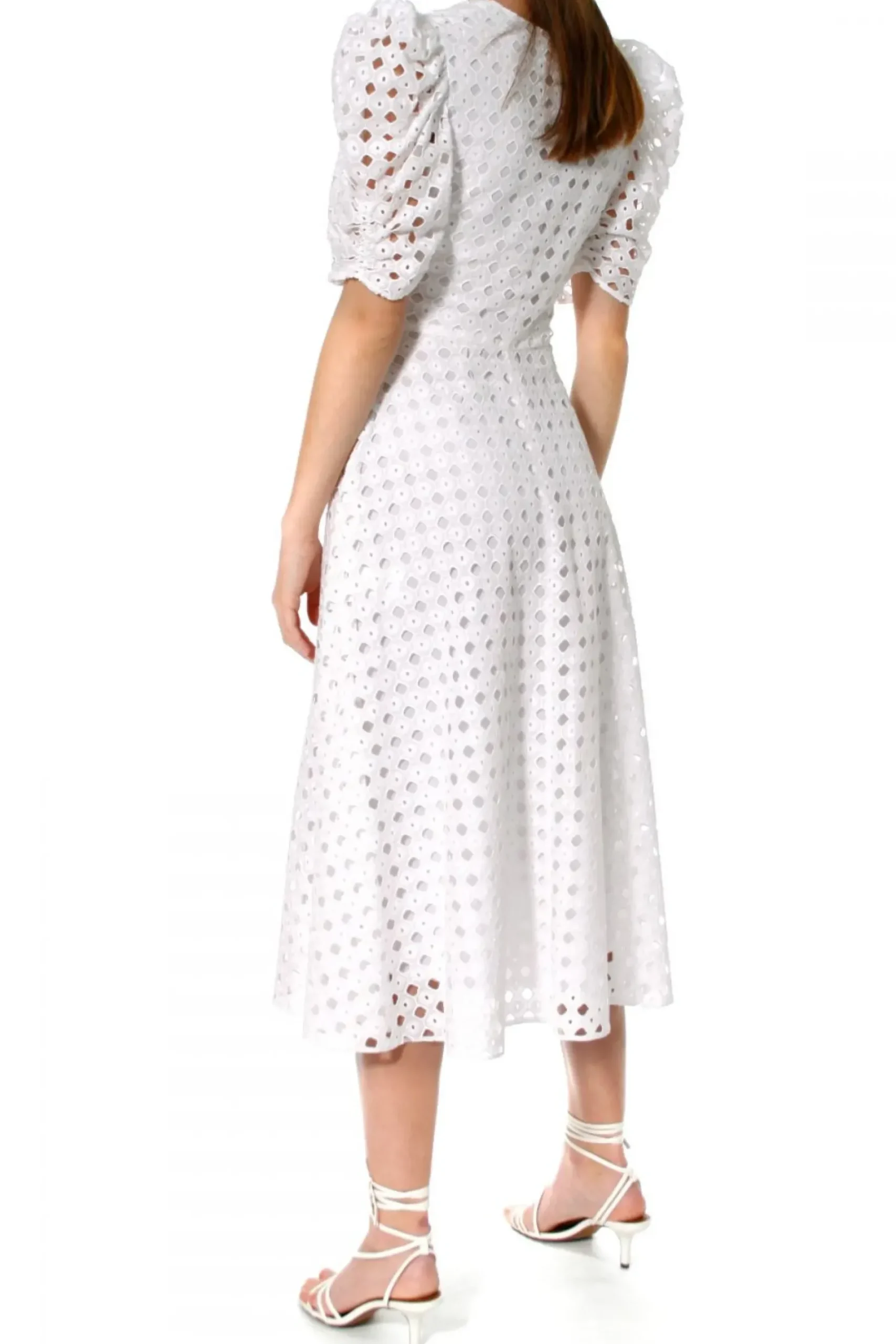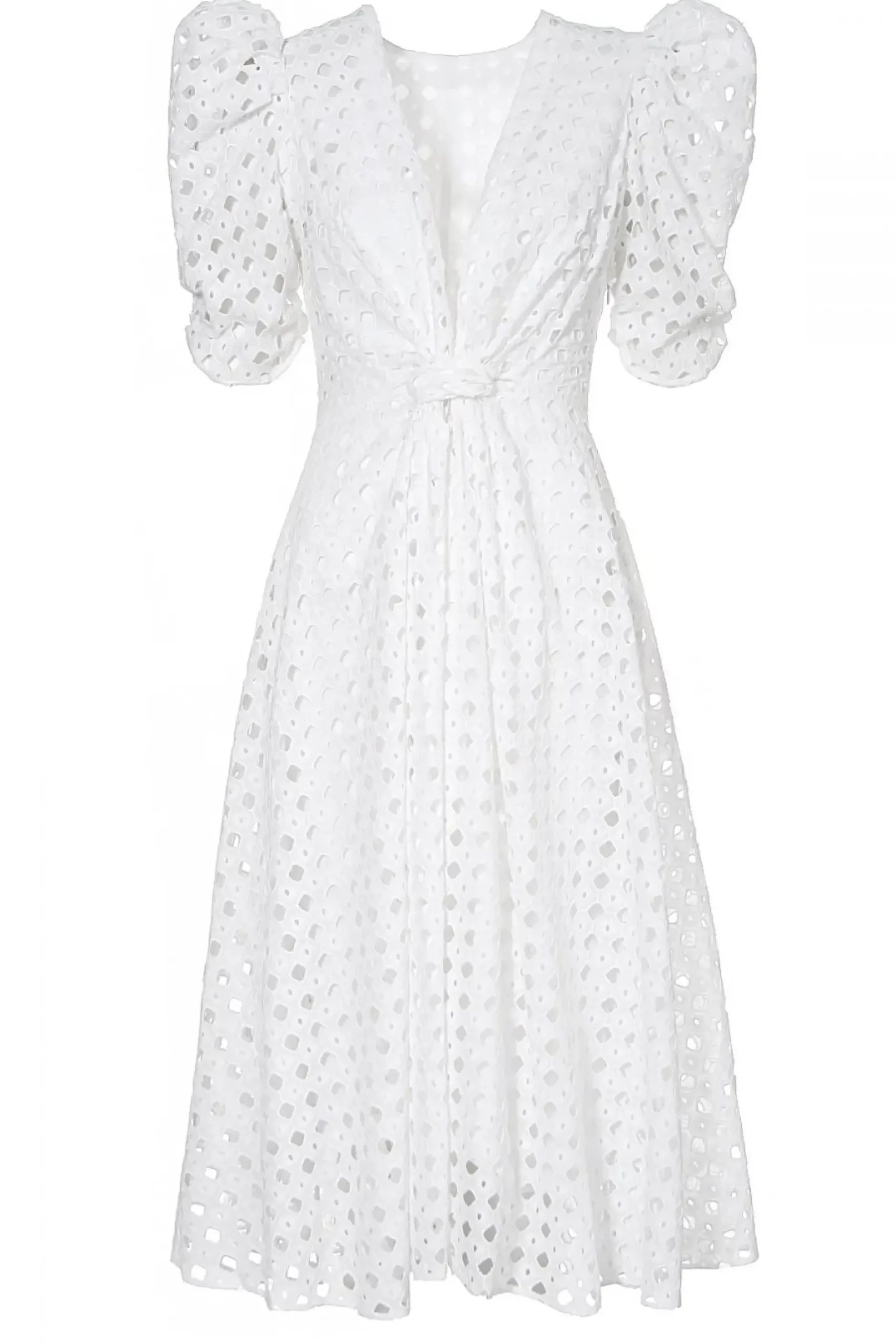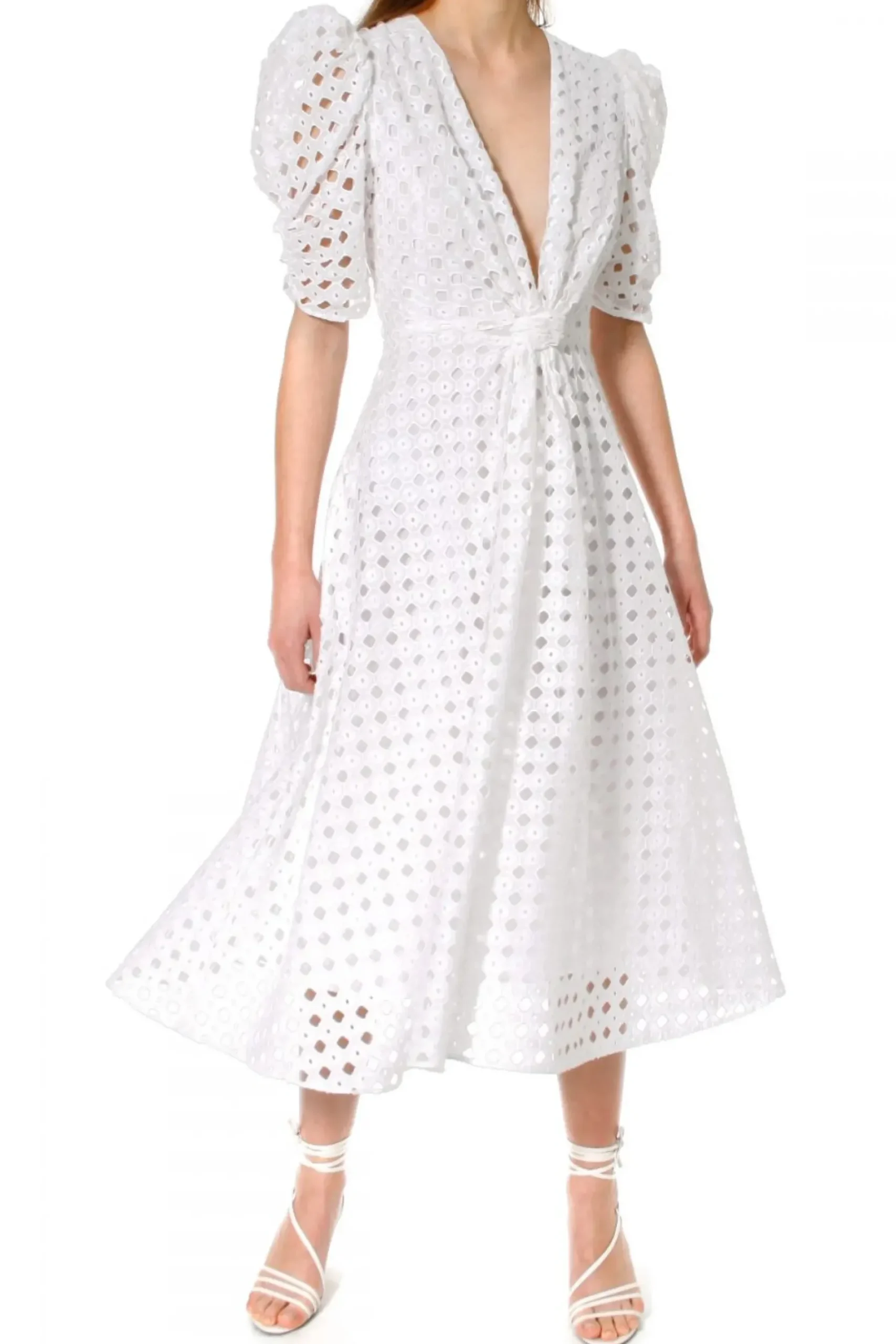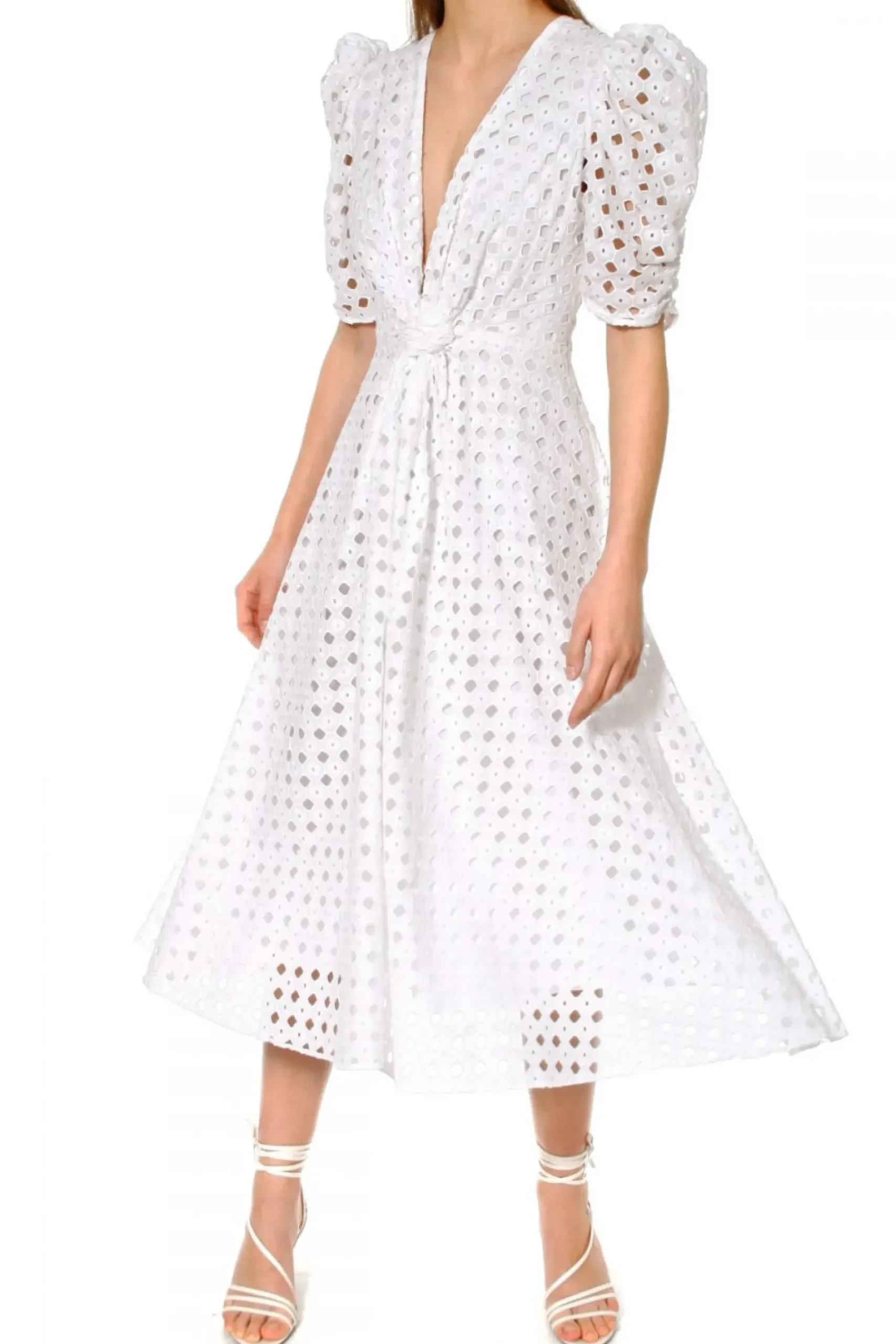 Impressive And Elegant – Embroidered Midi Dress Made Of Cotton. The Decisive Character Of The Design Is Created By: A Deep Neckline, Raised Puffs And A Decorative Knot At The Waist. Finished With A Cotton Veil Lining. In Combination With Delicate Pumps, It Acquires A Subtle And Formal Character. Worn With Cowboy Boots, It Creates A Summer Boho Style.