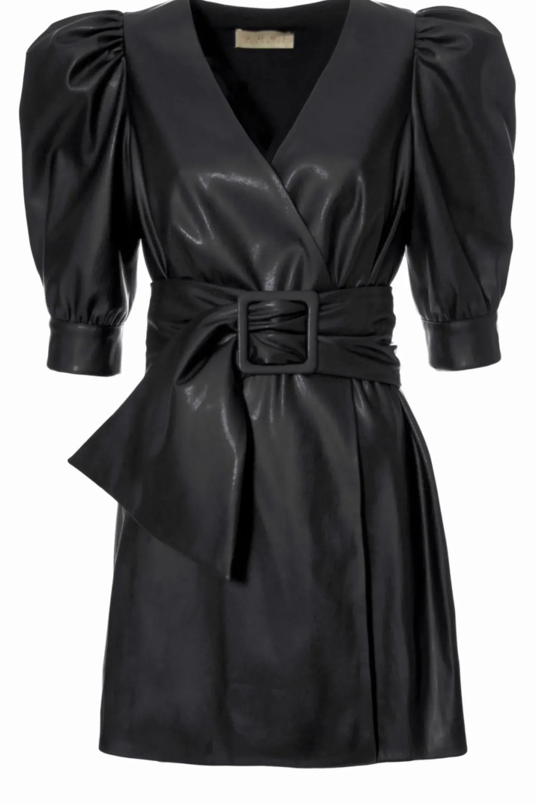 Kopertowa Sukienka Mini Wykonana Z Delikatnej W Dotyku I Miekko Ukladajacej Sie Skory Weganskiej. Rekawy Marszczone W Duze Bufy Zebrane Nad Lokciem W Mankiet Zapinany Na Oblekane Guziki. Talia Podkreslona W Spektakularny Sposob Szerokim Drapowanym Paskiem Z Oblekana Klamra. Calosc Na Zorzetowej Podszewce. Wystylizuj Ja Z Martensami Lub Wysokimi Kozakami.