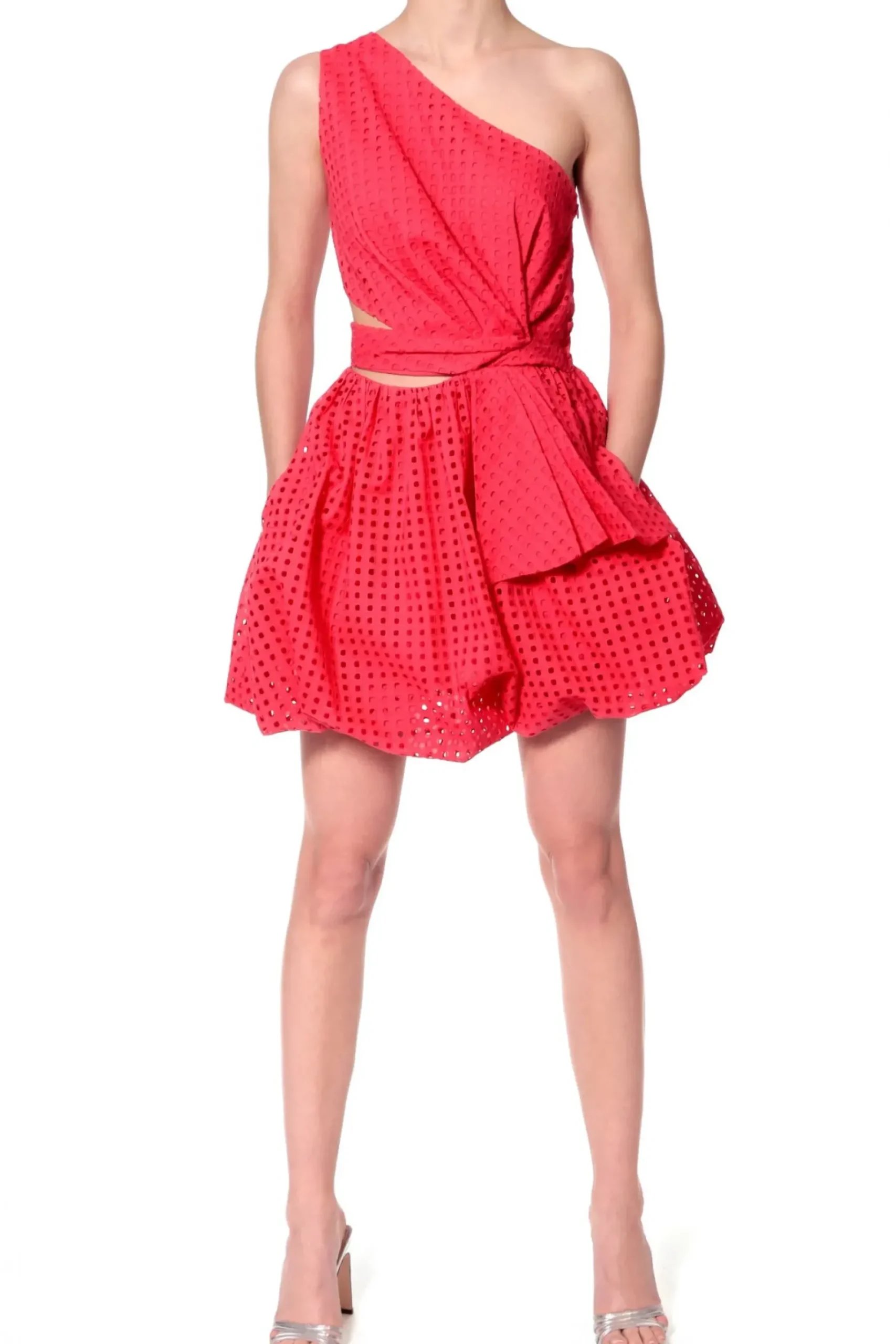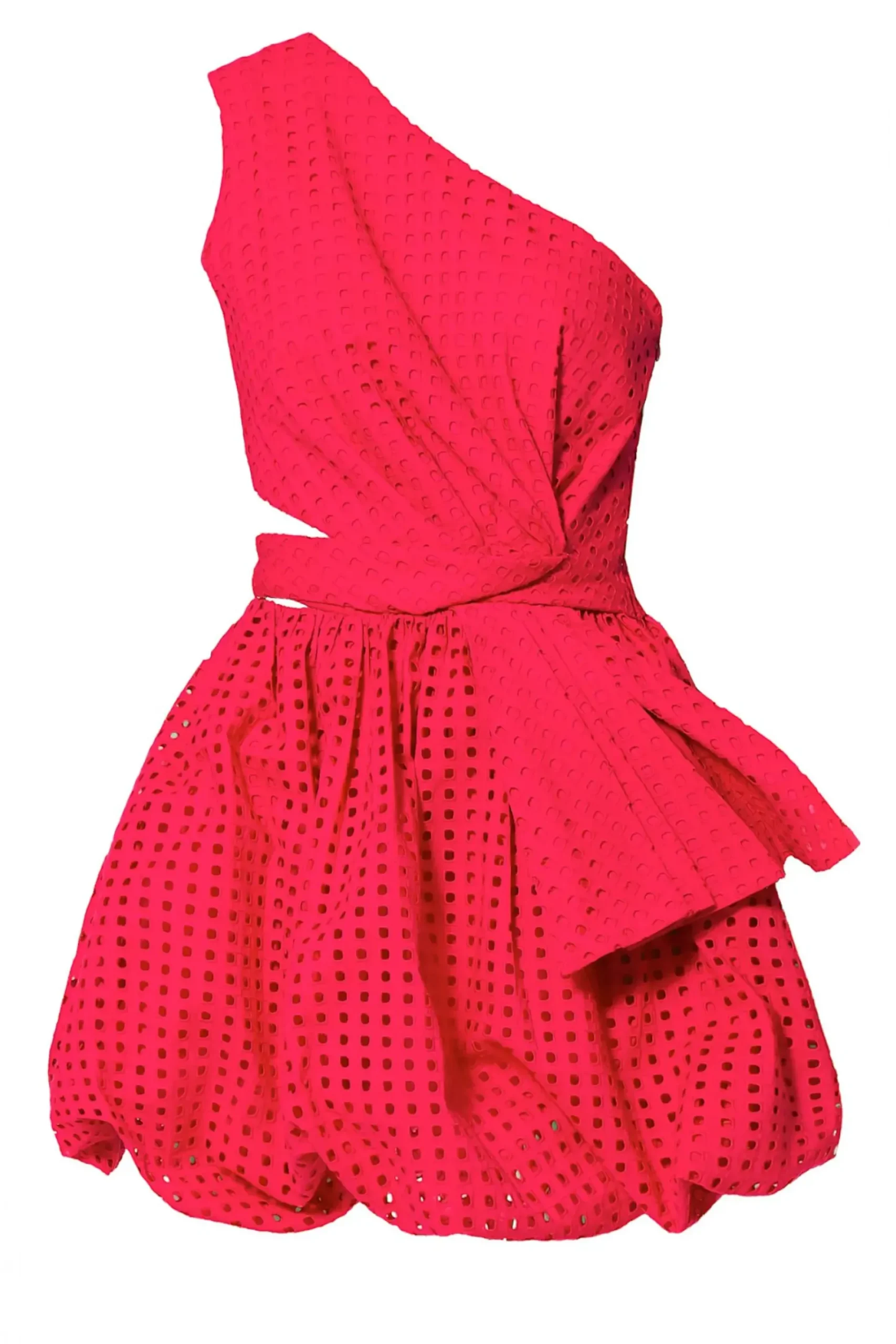 Sukienka Bombka Uszyta Z Haftowanej Bawelny W Nasyconym Koralowym Kolorze. Asymetryczna Mini Sukienka Odslaniajaca Ramie Oraz Fragment Talii. Fantazyjne Zakladki, Drapowania, Marszczenie Nadaja Projektowi Rzezbiarskiej Przestrzeni. W Szwach Bocznych Kieszenie, Zapinana Z Boku Na Zamek Blyskawiczny. Spektakularny Model Na Letnie Party.