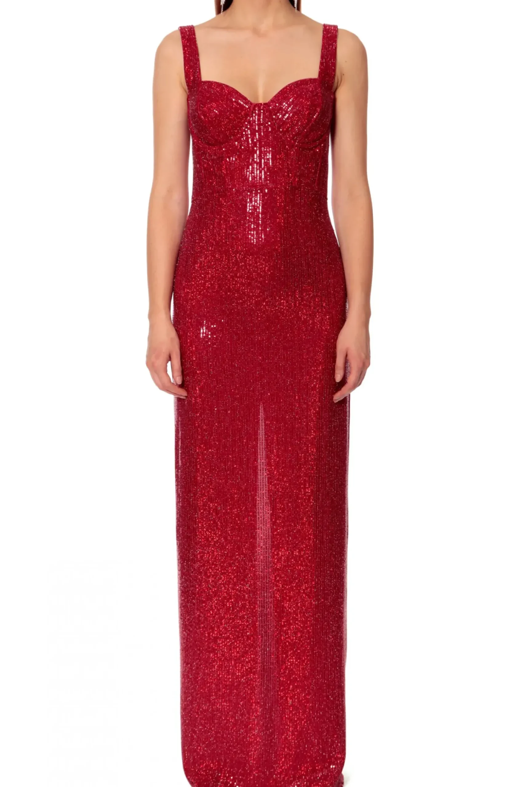 Wieczorowa Sukienka Maxi W Intensywnym Czerwonym Kolorze. Wykonana Z Elastycznego Materialu Z Metaliczna Nicia Pokrytego Polyskujacymi Pajetkami. Misternie Skrojony I Wymodelowany Gorset Na Szerokich Ramiaczkach Podkresla Kobiece Walory. Prosty Dol Sukienki Z Wysokim Sensualnym Rozcieciem Z Tylu.