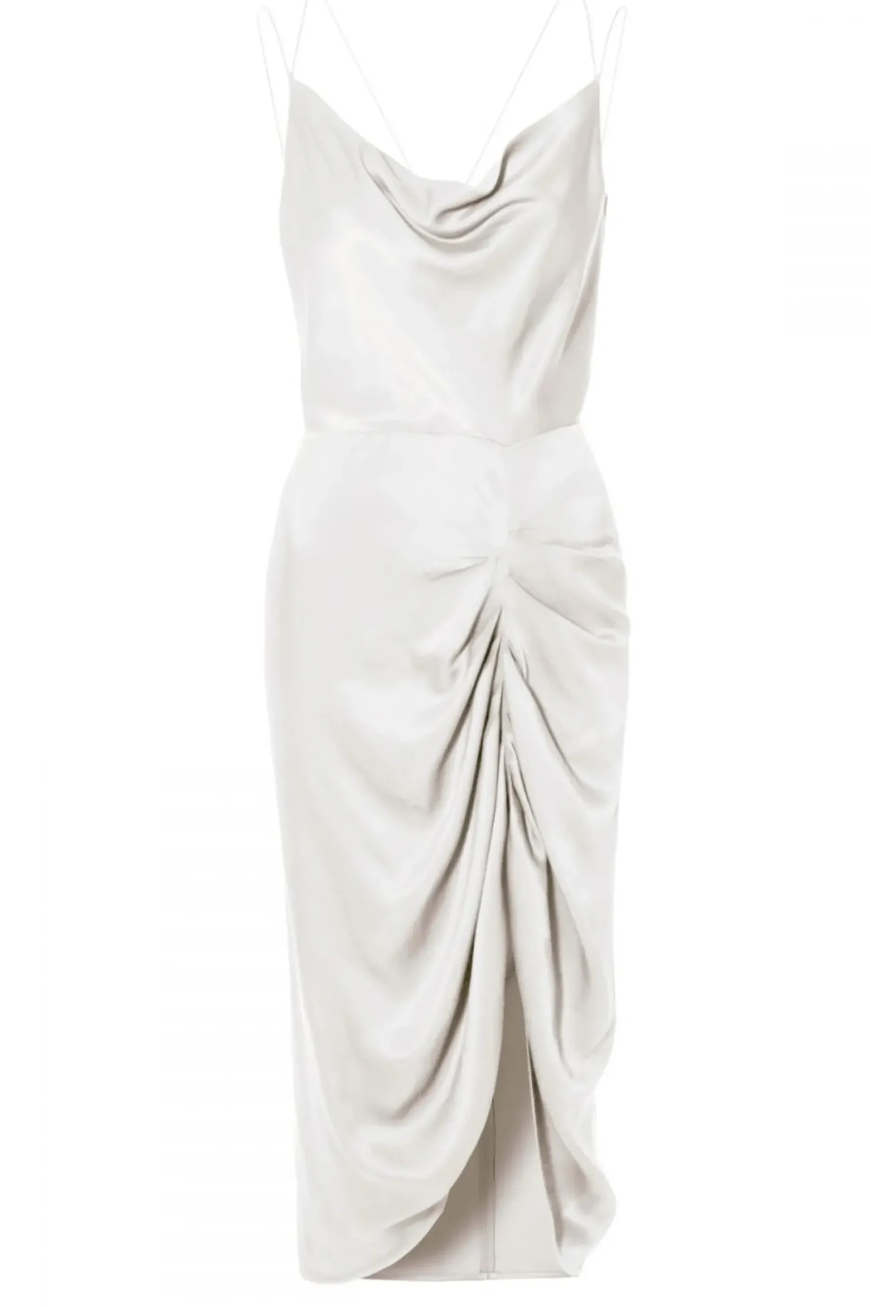 Spektakularny Projekt Wykonany Z Miesistego, Szlachetnego Atlasu. Drapowany Dekolt Utrzymany Cieniutkimi Ramiaczkami Typu Makaroniki Krzyzujacymi Sie Na Zmyslowo Odkrytych Plecach. Dlugosc Midi Przelamana Wysokim, Mocno Udrapowanym Peknieciem Na Lewym Udzie. Zestaw Sukienke Z Sandalami Na Wysokiej Szpilce I Mocna Bizuteria I Stworz Koktajlowy, Seksowny Look, Badz Przekornie Zaloz Do Niej Biale Sneakersy I Poczuj Sie Wyjatkowo Podczas Letniego Popoludnia.