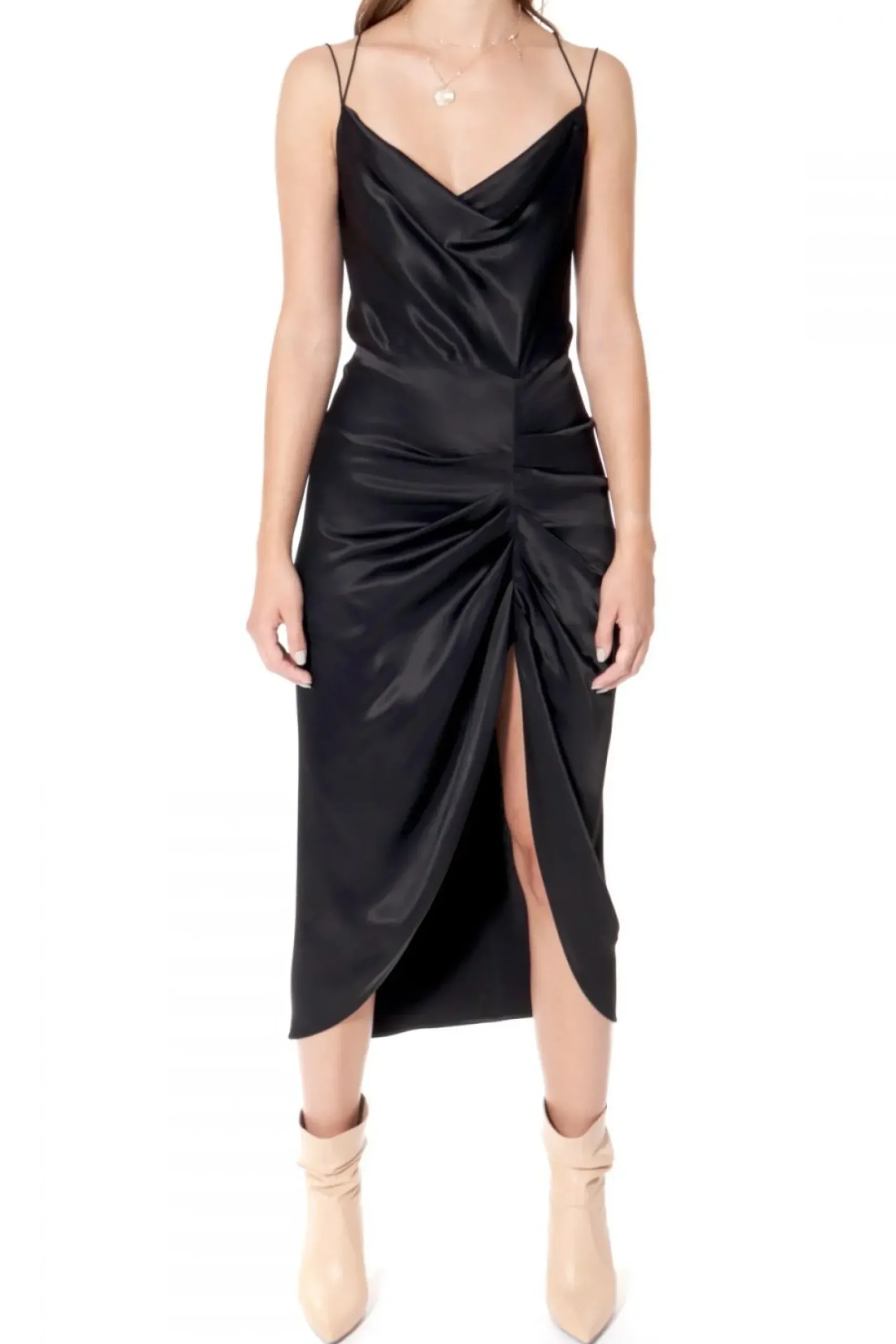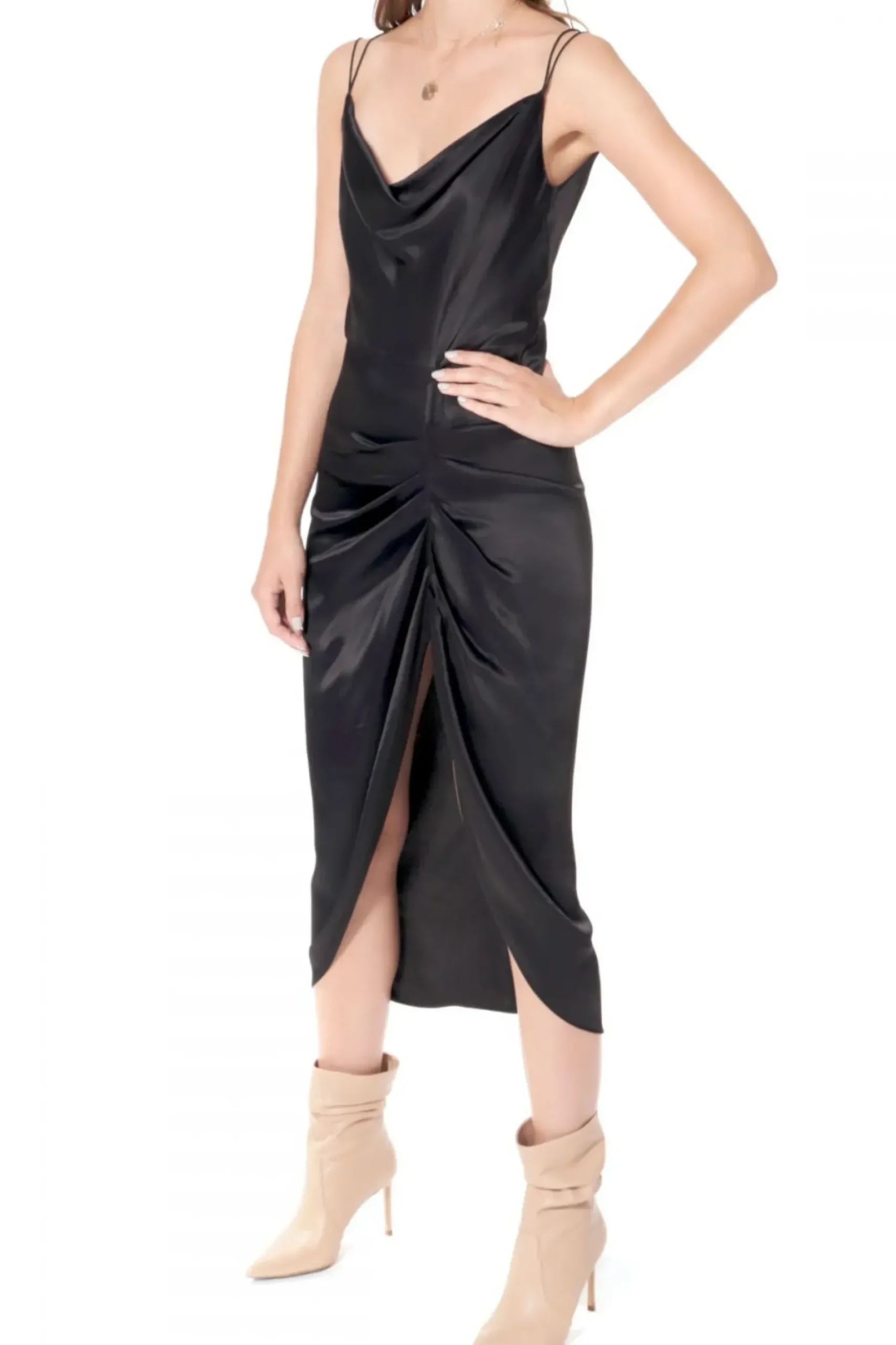 Spektakularny Projekt Wykonany Z Miesistego, Szlachetnego Atlasu. Drapowany Dekolt Utrzymany Cieniutkimi Ramiaczkami Typu Makaroniki Krzyzujacymi Sie Na Zmyslowo Odkrytych Plecach. Dlugosc Midi Przelamana Wysokim, Mocno Udrapowanym Peknieciem Na Lewym Udzie. Zestaw Sukienke Z Sandalami Na Wysokiej Szpilce I Mocna Bizuteria I Stworz Wieczorowy, Seksowny Look, Badz Przeciwnie Polacz Nasz Atlasowy Projekt Z Botkami Lub Ciezkimi Martensami I Nos Nasz Projekt Jako Codzienna Stylizacje Zakladajac Na Ramiona Jedna Z Oversizowych Marynarek Z Naszej Kolekcji.