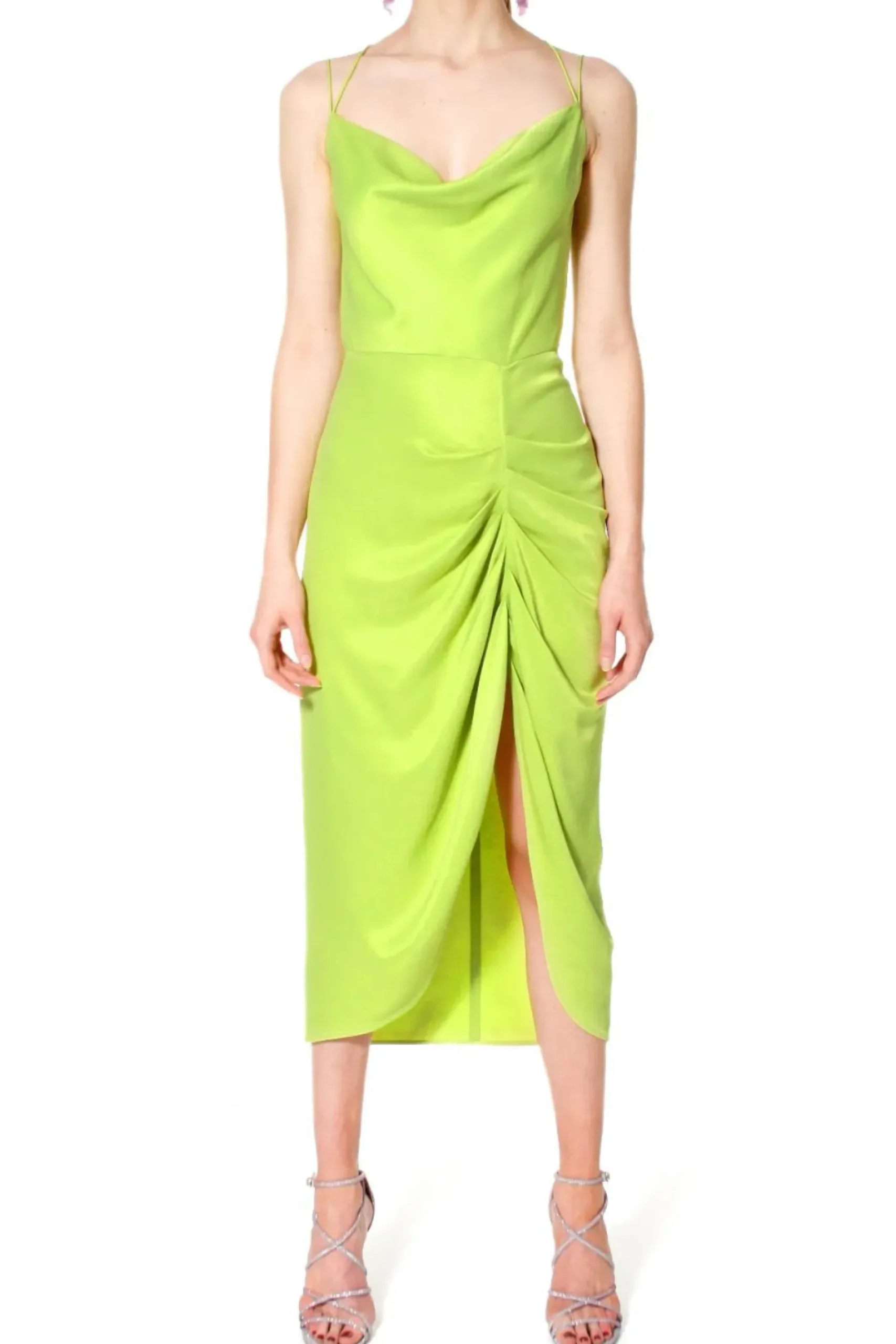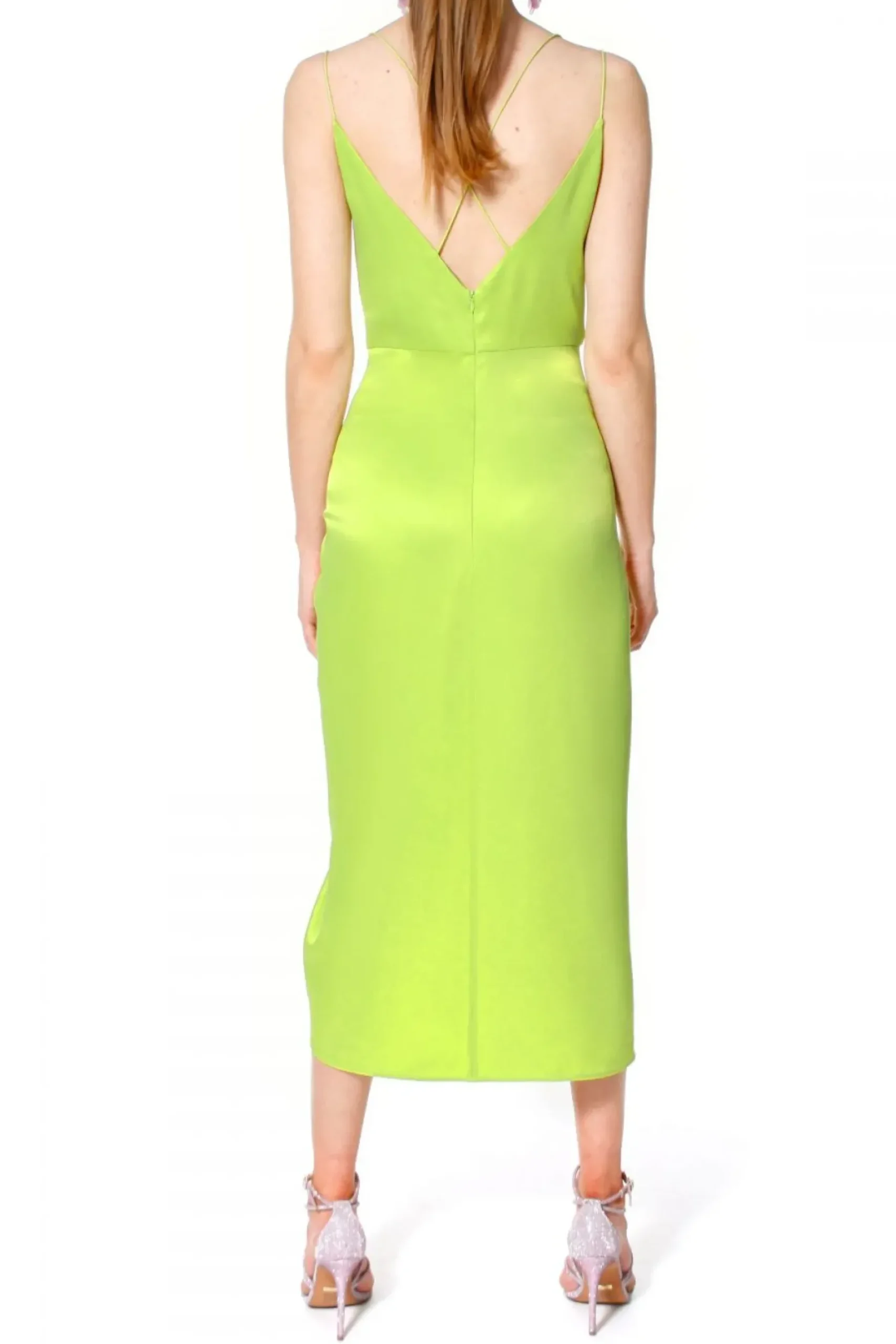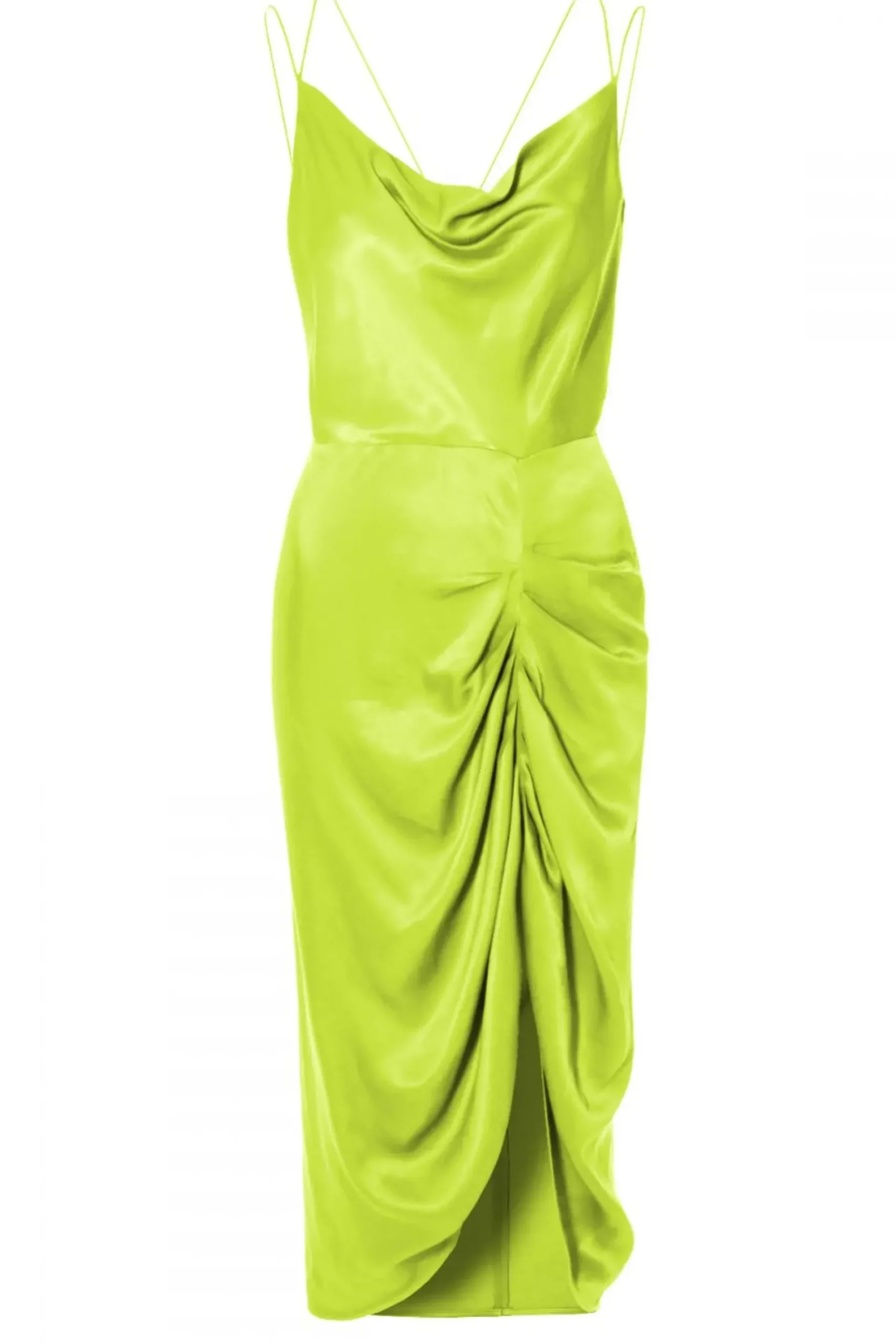 Spektakularny Projekt Wykonany Z Miesistego, Szlachetnego Atlasu. Drapowany Dekolt Utrzymany Cieniutkimi Ramiaczkami Typu Makaroniki Krzyzujacymi Sie Na Zmyslowo Odkrytych Plecach. Dlugosc Midi Przelamana Wysokim, Mocno Udrapowanym Peknieciem Na Lewym Udzie. Zestaw Sukienke Z Sandalami Na Wysokiej Szpilce I Mocna Bizuteria I Stworz Koktajlowy, Seksowny Look, Badz Przekornie Zaloz Do Niej Biale Sneakersy I Poczuj Sie Wyjatkowo Podczas Letniego Popoludnia.