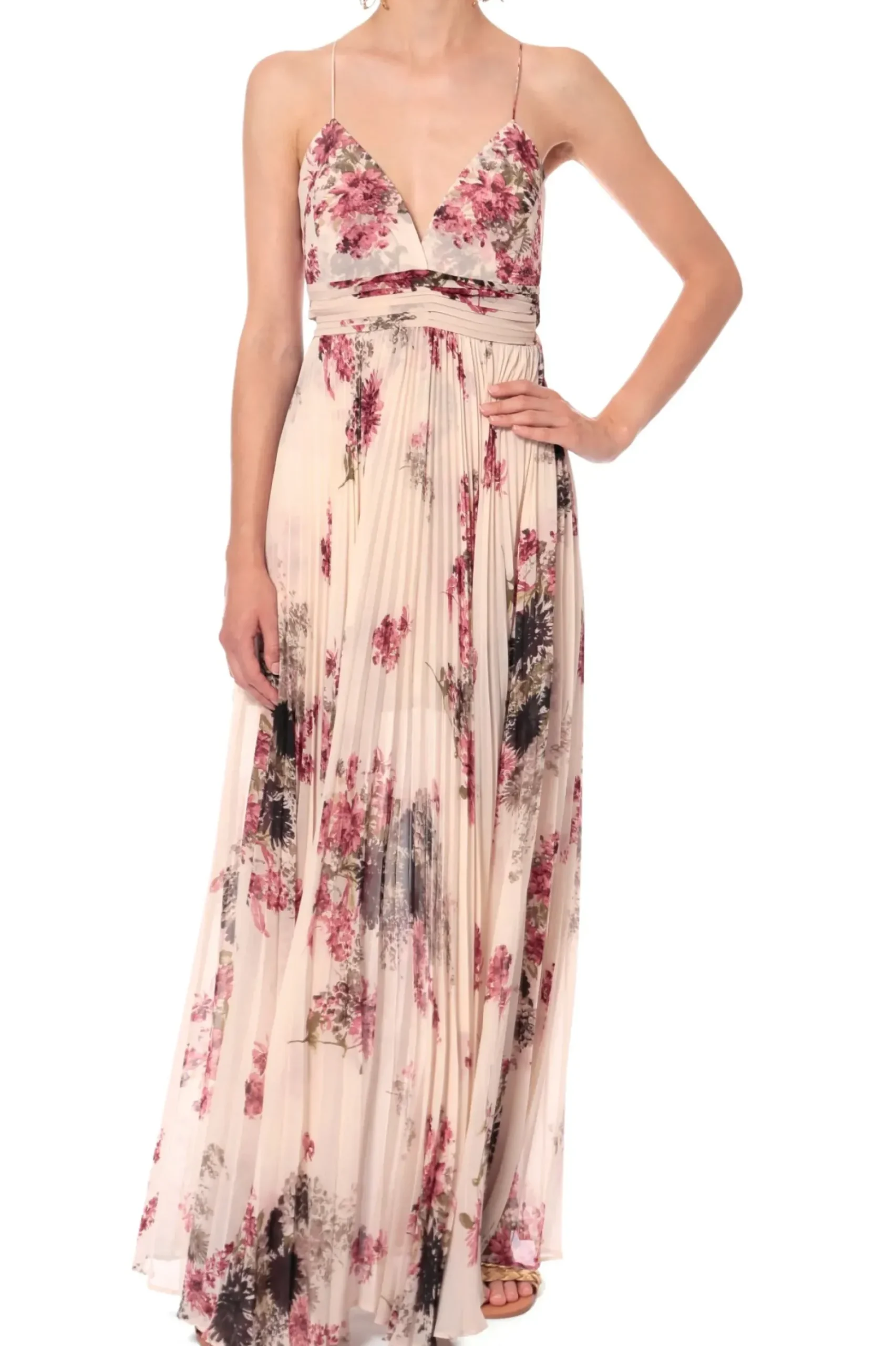 Zjawiskowa Suknia Maxi Z Odkrytymi Plecami Uszyta Z Cieniutkiego, Zwiewnego Szyfonu W Malarski Desen Kwiatowy Inspirowany Kwitnaca Magnolia.