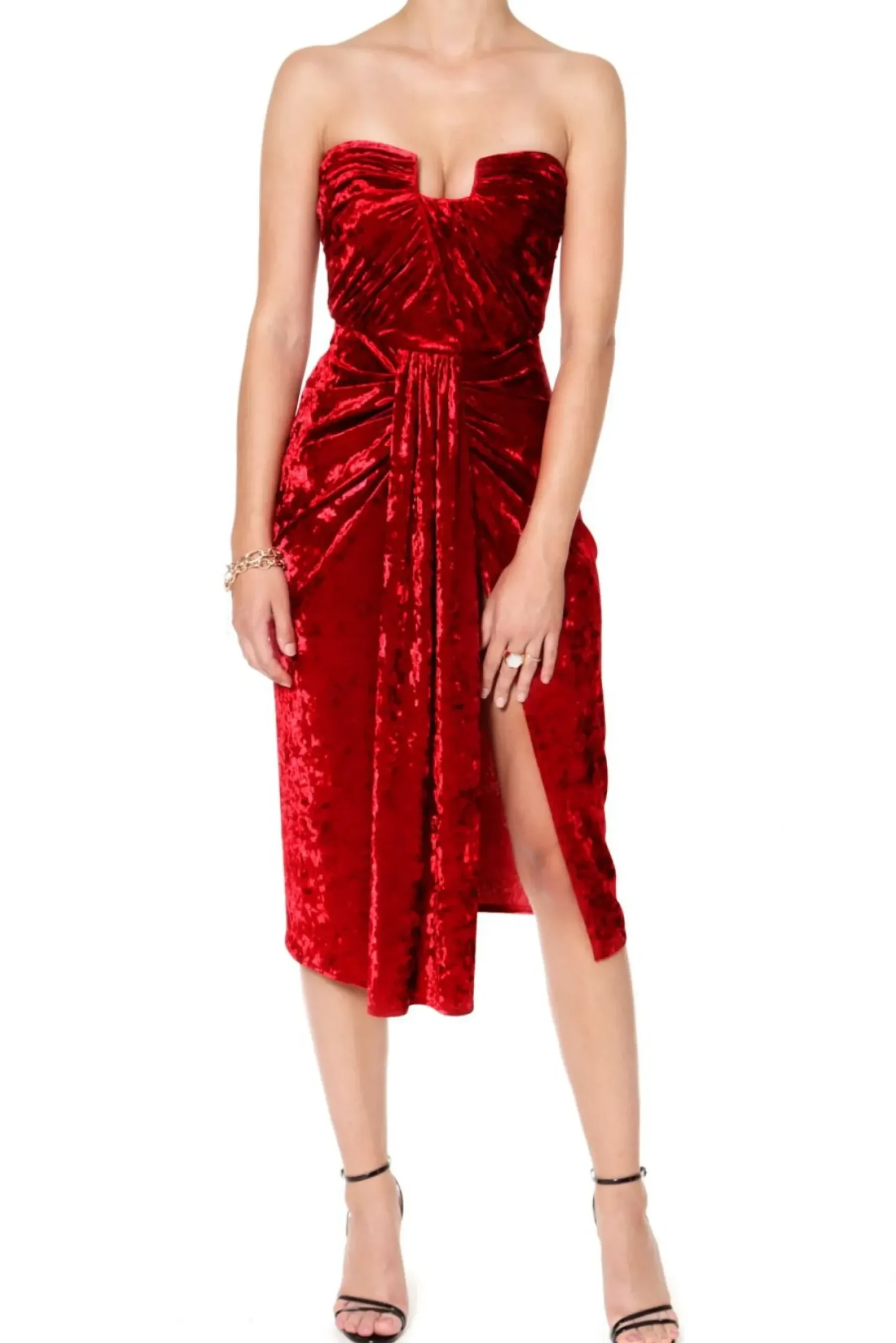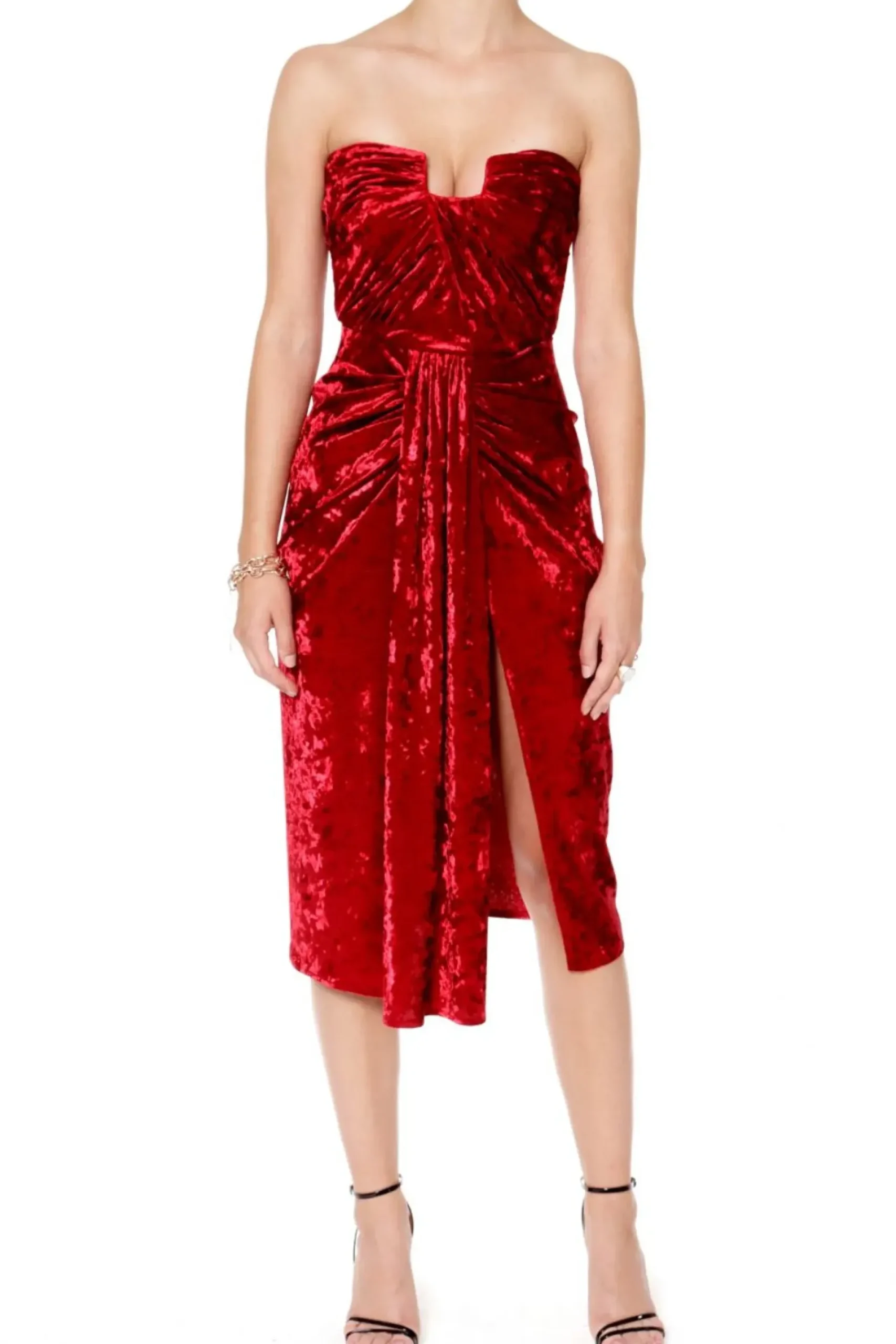 Zmyslowa Sukienka Midi Uszyta Z „Pomietego” Lejacego Aksamitu. Gorsetowy Top O Oryginalnym Prostokatnym Kroju Podkreslajacym Dekolt. Wysokie Rozciecie Odslaniajace Lewe Udo.