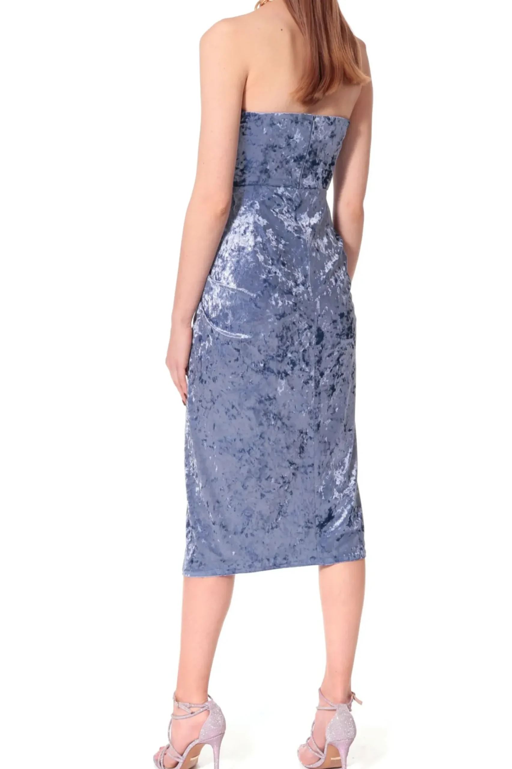 Zmyslowa Sukienka Midi Uszyta Z „Pomietego” Lejacego Aksamitu. Gorsetowy Top O Oryginalnym Prostokatnym Kroju Podkreslajacym Dekolt. Wysokie Rozciecie Odslaniajace Lewe Udo.