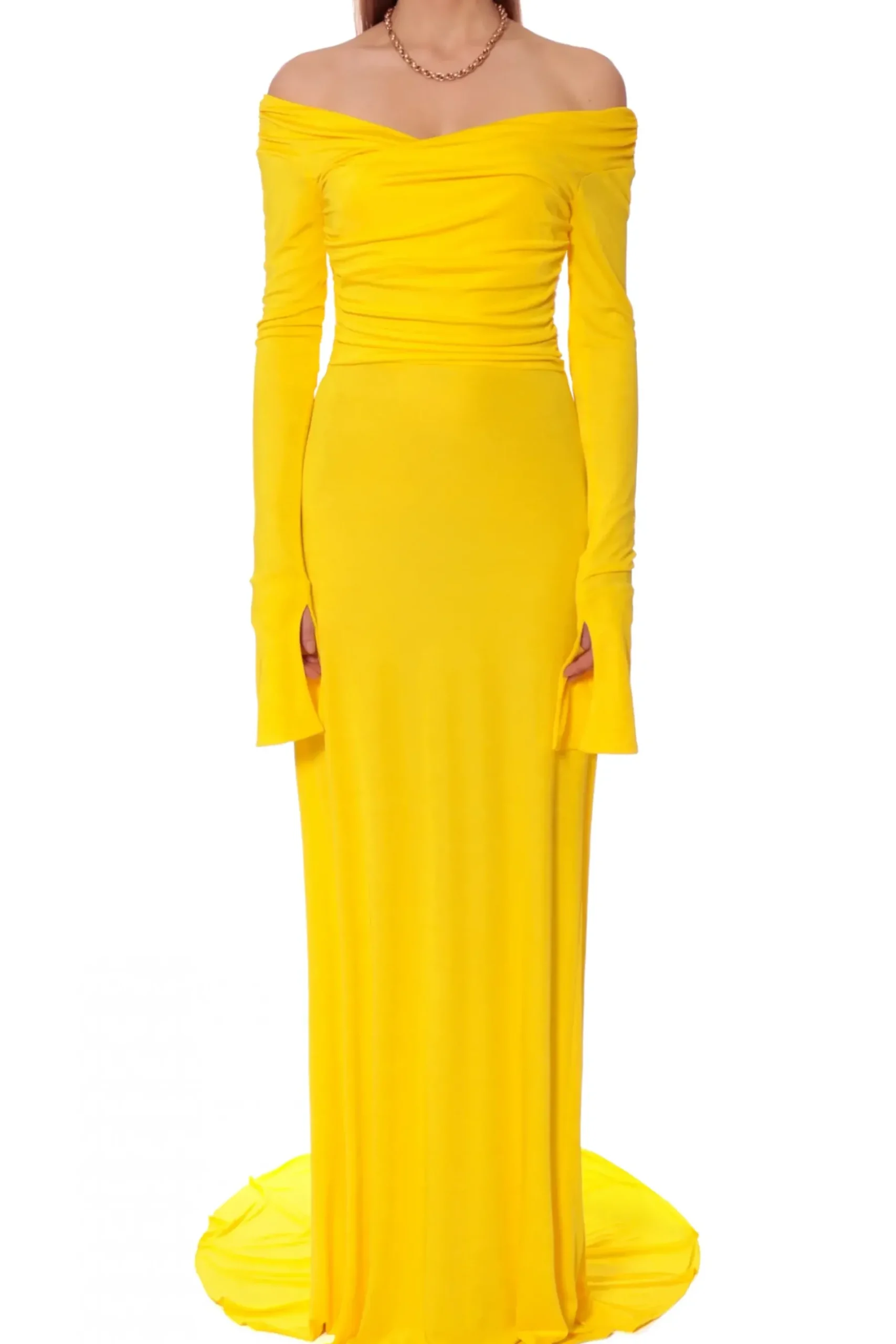 Sukienka Maxi Z Dlugim, Swobodnie Opadajacym Trenem. Dlugie Rekawy Siegajace Mocno Poza Dlonie, Delikatne Marszczenia Wokol Ramion I Tali.