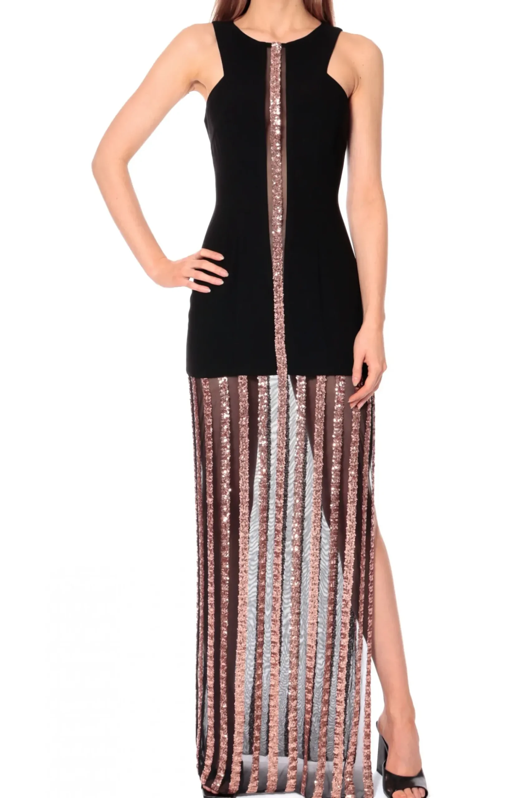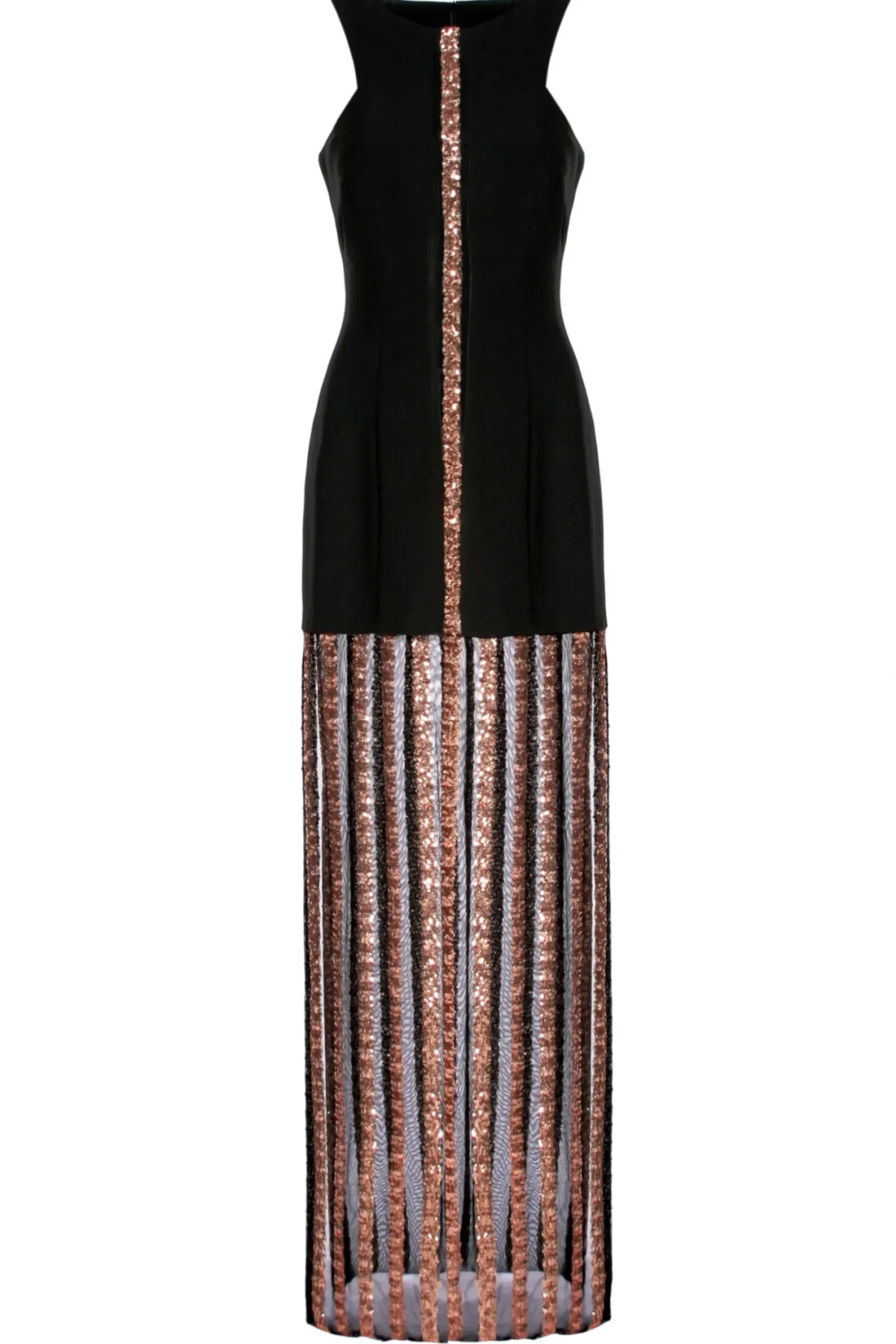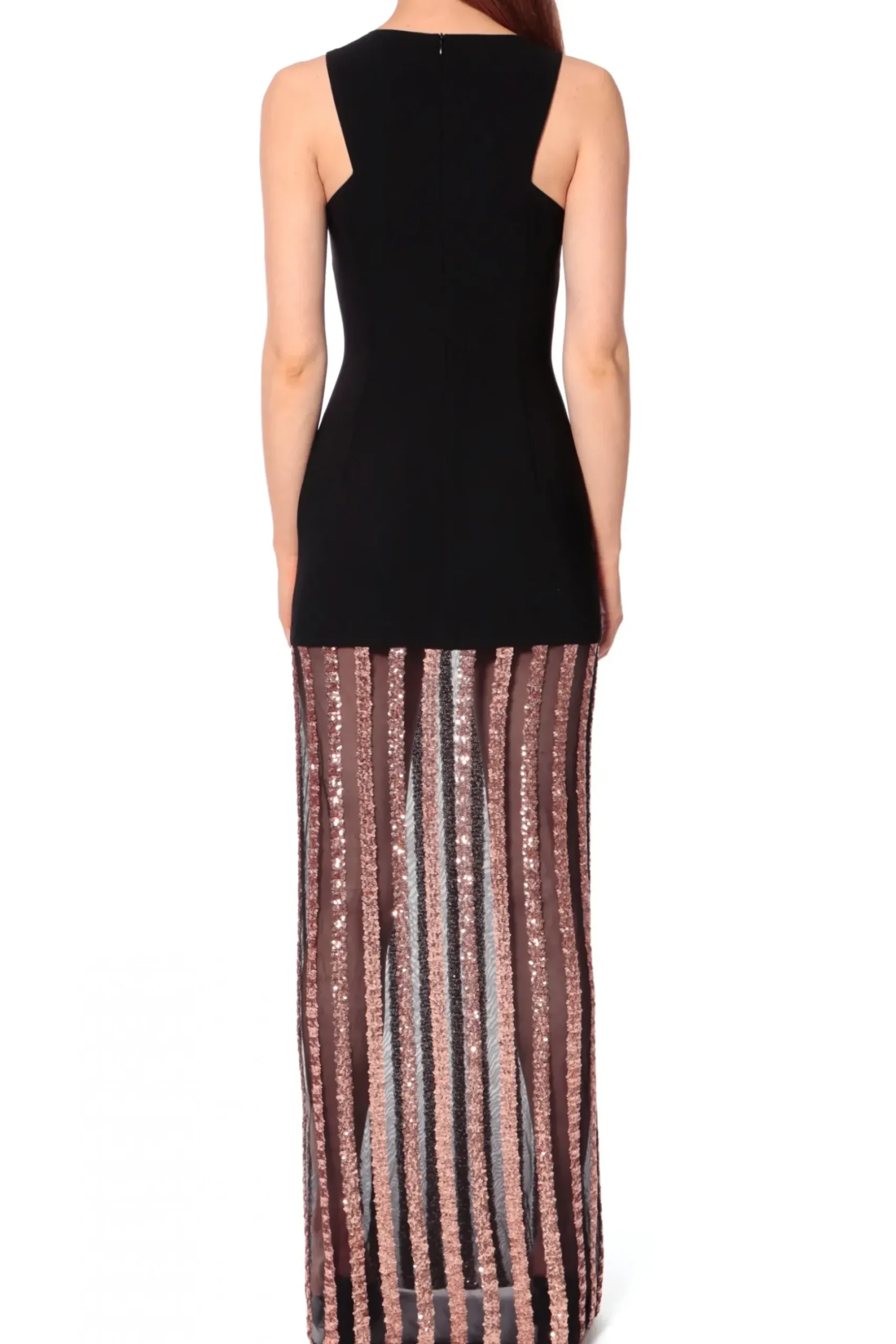 Sukienka Wieczorowa Bez Rekawow O Dopasowanym Kroju I Rozcieciem Z Boku. Zestawienie Dwoch Materialow Laczy W Sobie Dwie Dlugosci : Mini I Maxi. Gorna Czesc Sukienki Z Ciekawym Wycieciem Wokol Ramion. Dolna Czesc Uszyta Jest Z Delikatnej Siateczki Z Cekinami.
