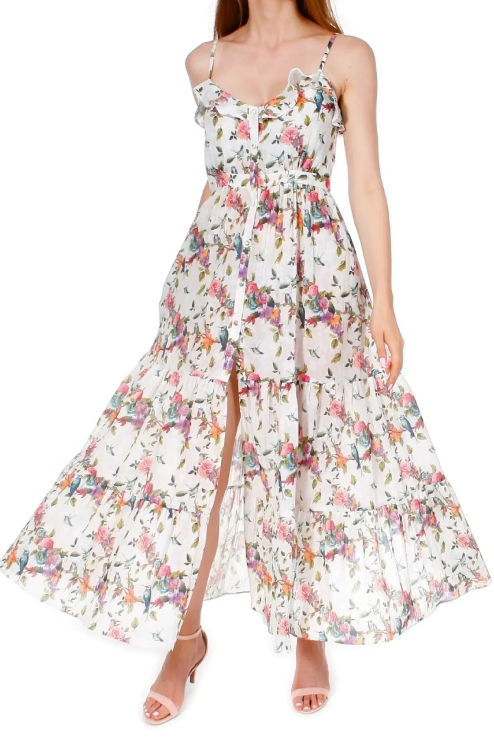 Romantyczna, Letnia Sukienka Maxi Na Cienkich Regulowanych Ramiaczkach. Model Uszyty Jest Z Lekko Gniecionej Bawelny W Wielobarwny Nadruk Kwiatowy. Dopasowana Gora Sukienki Ozdobiona Falbanka. W Talii Wszyty Pasek. Dolna Czesc To Trzy Marszczone Falbany Miekko Kolyszace Sie Przy Kazdym Ruchu. W Szwach Bocznych Kieszenie. Zapinana Na Male Oblekane Guziczki.