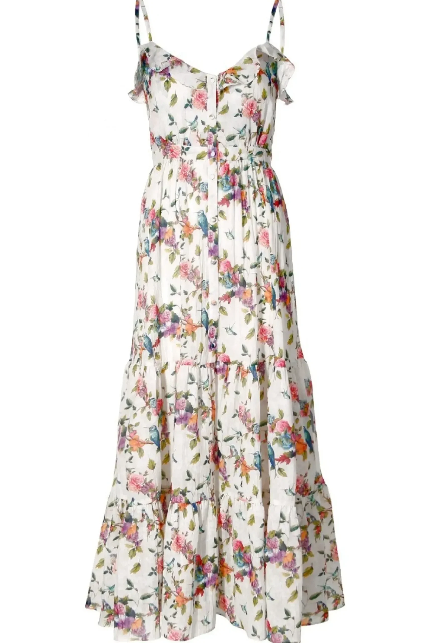 Romantic, Summer Maxi Dress With Thin Adjustable Straps. The Model Is Sewn From Slightly Crumpled Cotton Into A Multicolored Floral Print. Fitted Top Of The Dress Decorated With A Frill. Waist Sewn In Waist. The Bottom Part Is Three Crinkled Valances Softly Swaying With Every Move. Side Pockets In The Side Seams. Fastened With Small, Buttoned Buttons.