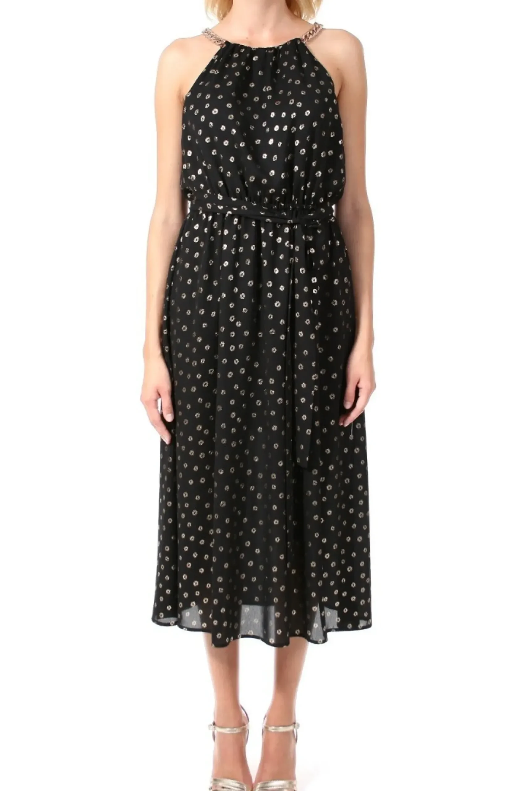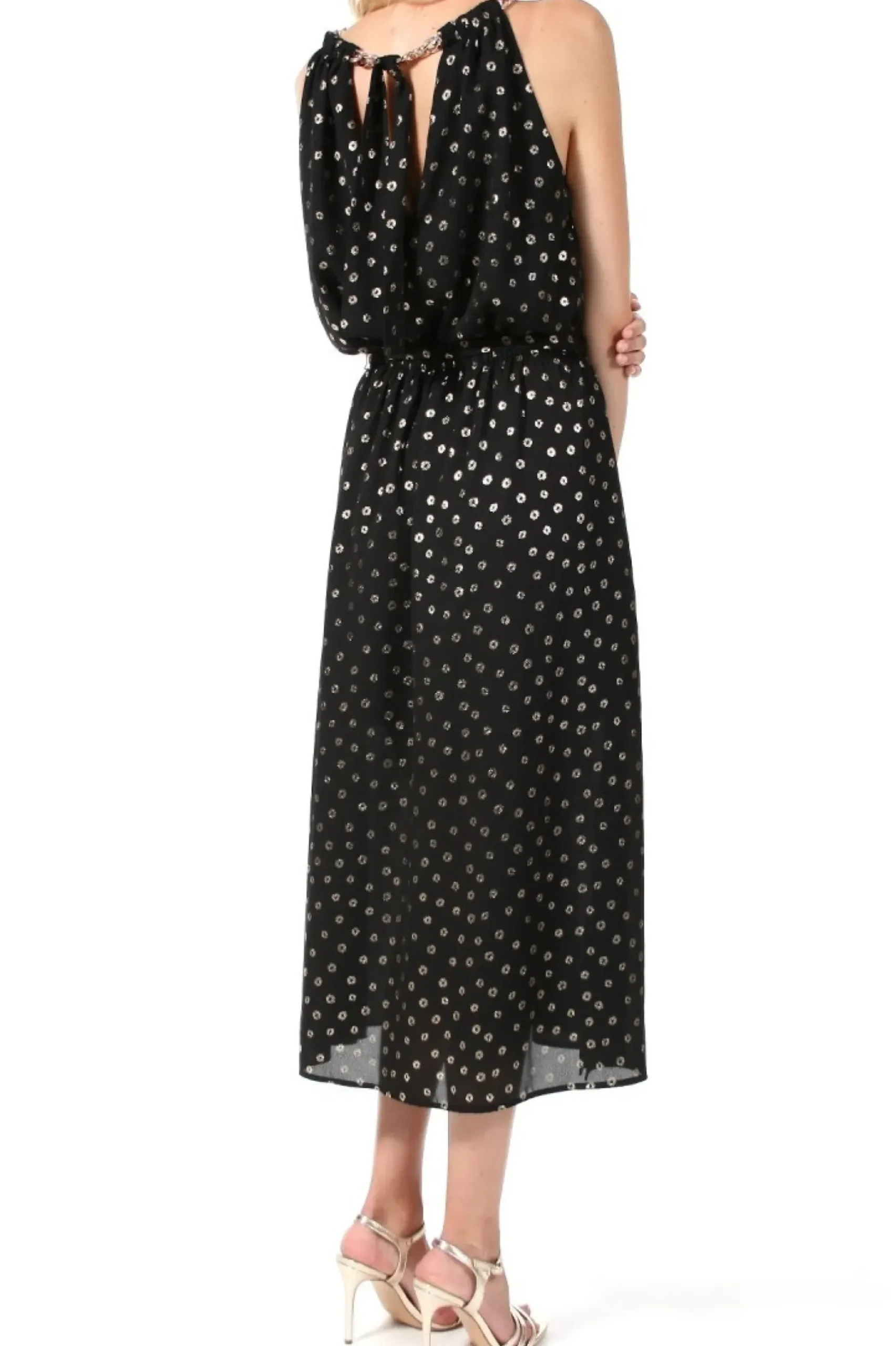 Zwiewna, Szyfonowa Sukienka Midi W Delikatny Zloty Wzor. Dekolt Drapowany Wokol Szyi I Ozdobiony Lancuchem W Zlotym Kolorze, Z Tylu Wiazany Na Szarfe. W Pasie Lekko Zebrana Gumka I Przewiazywana Szerokim Dlugim Paskiem. Na Bokach Wysokie Rozciecia. Idealna Na Przyjecie I Eleganckie Wyjscia.