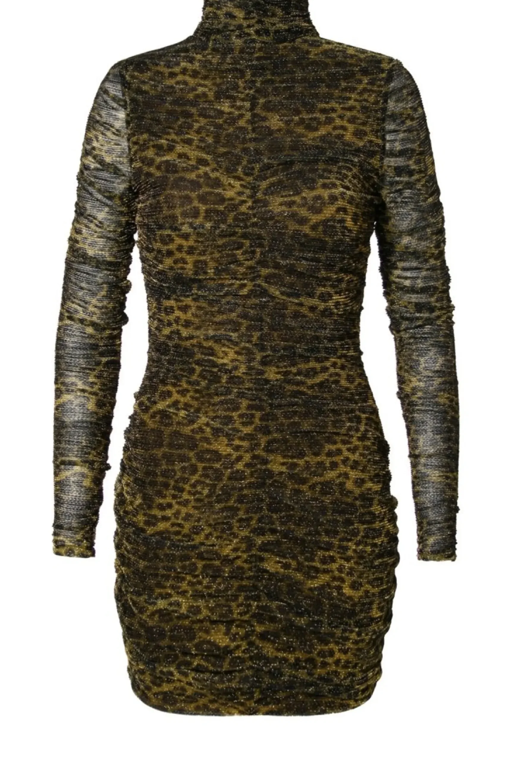 Seksowna Mini Uszyta Z Drapowanej Elastycznej Siateczki Podkresli Kobiece Ksztalty.Material W Koci Print Ze Zlotym Polyskiem,Wykonczona Wiskozowa Podszewka Z Elastanem. Rekawy Przezroczyste.Drapowany Golfik Zapinany Z Tylu Na Trzy Guziczki.
