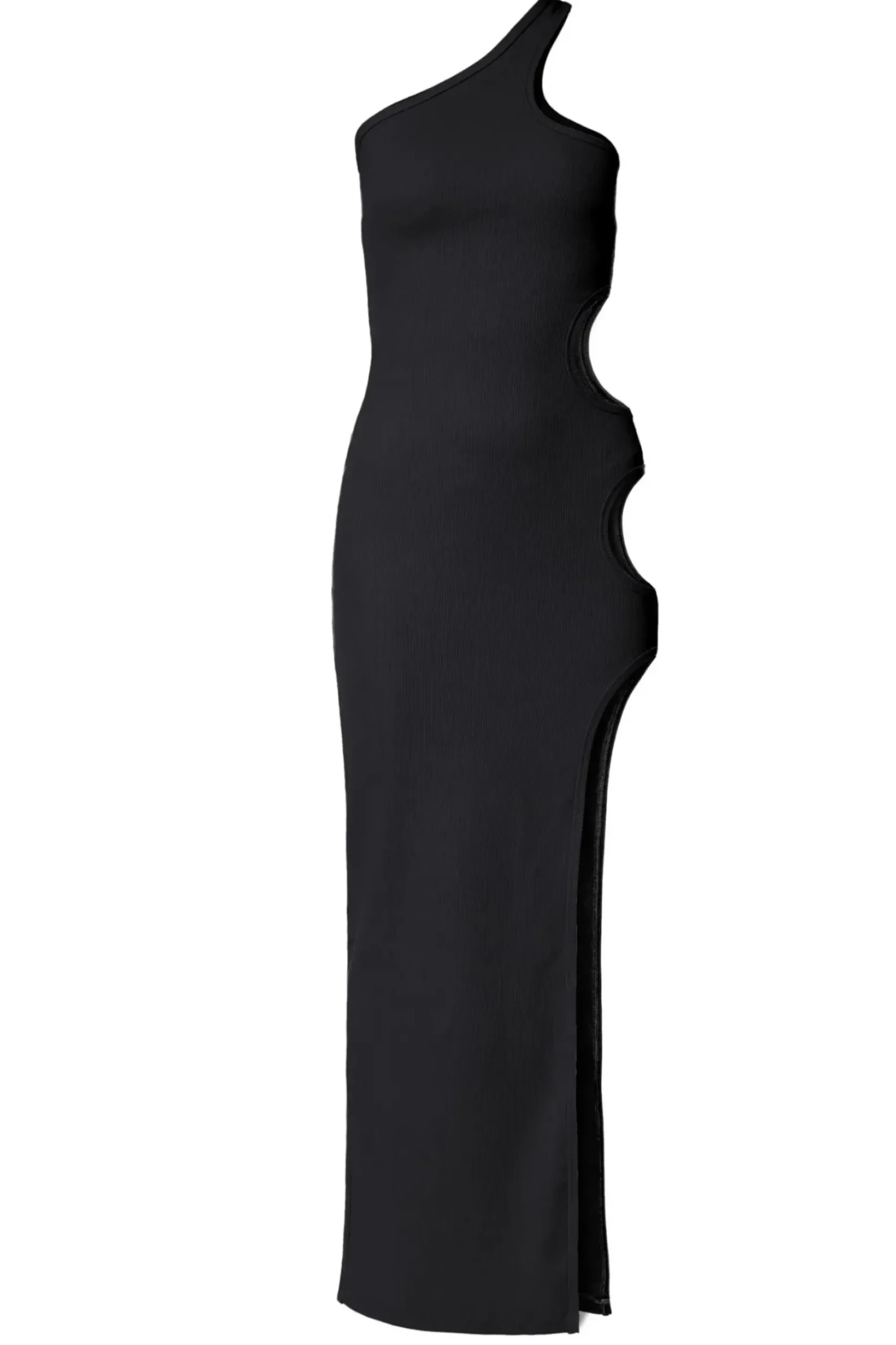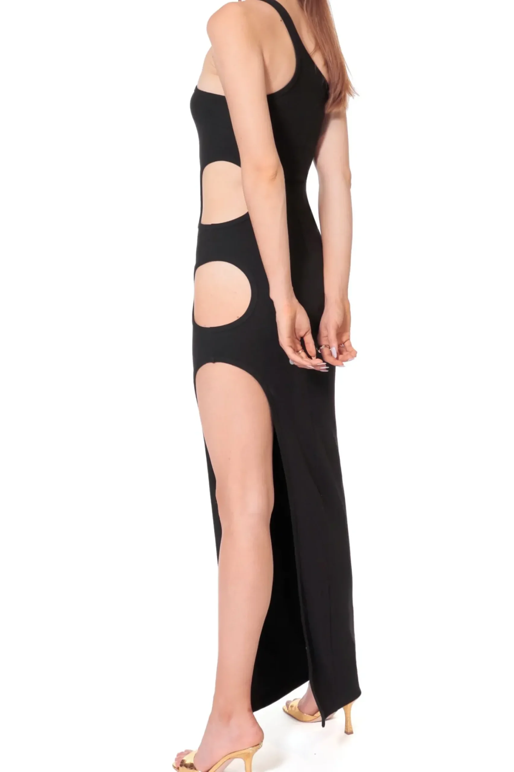 Asymetryczna Sukienka Maxi Ze Zmyslowymi Wycieciami Odslaniajacymi Czesciowo Talie I Biodro Oraz Mocno Eksponujacymi Noge.