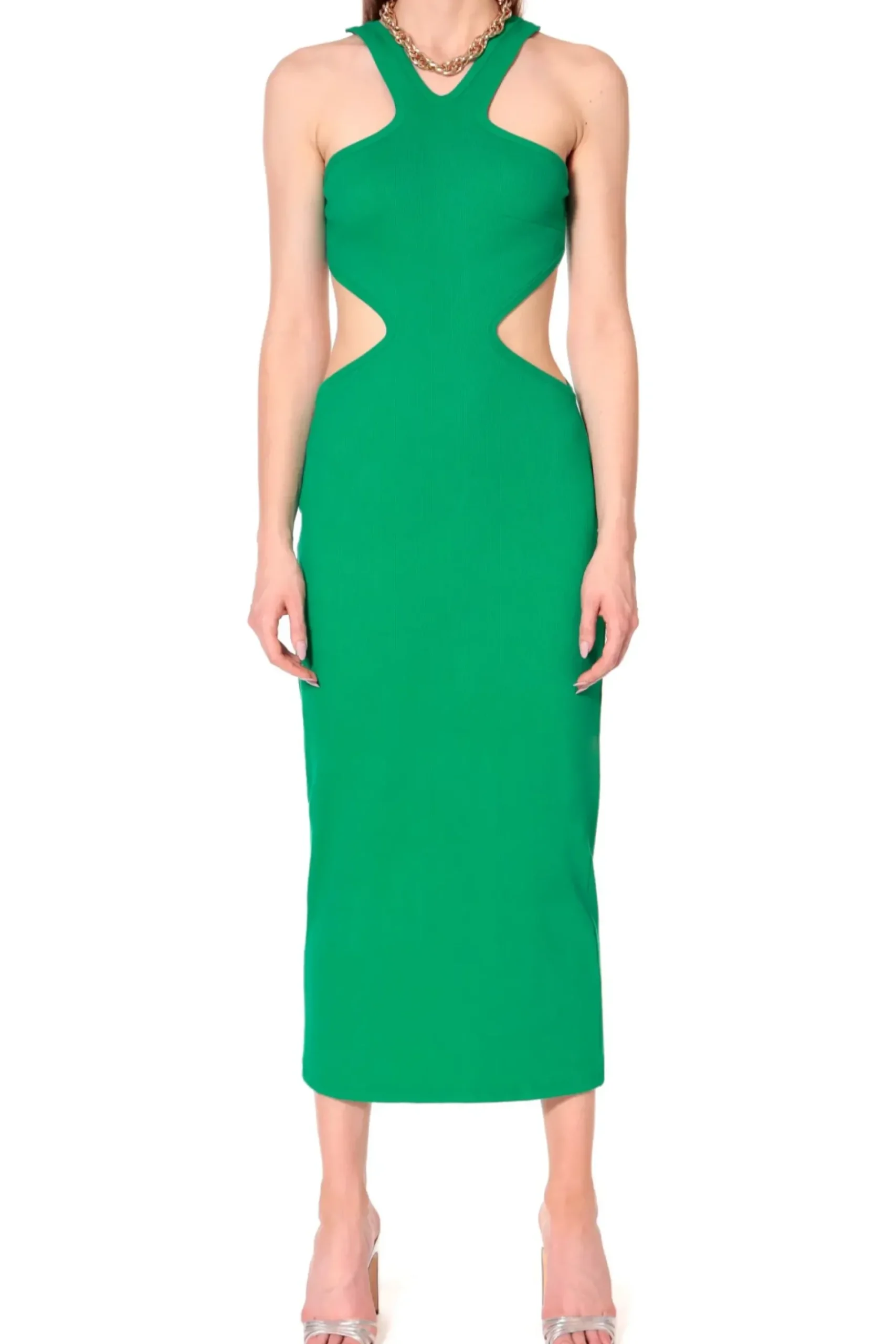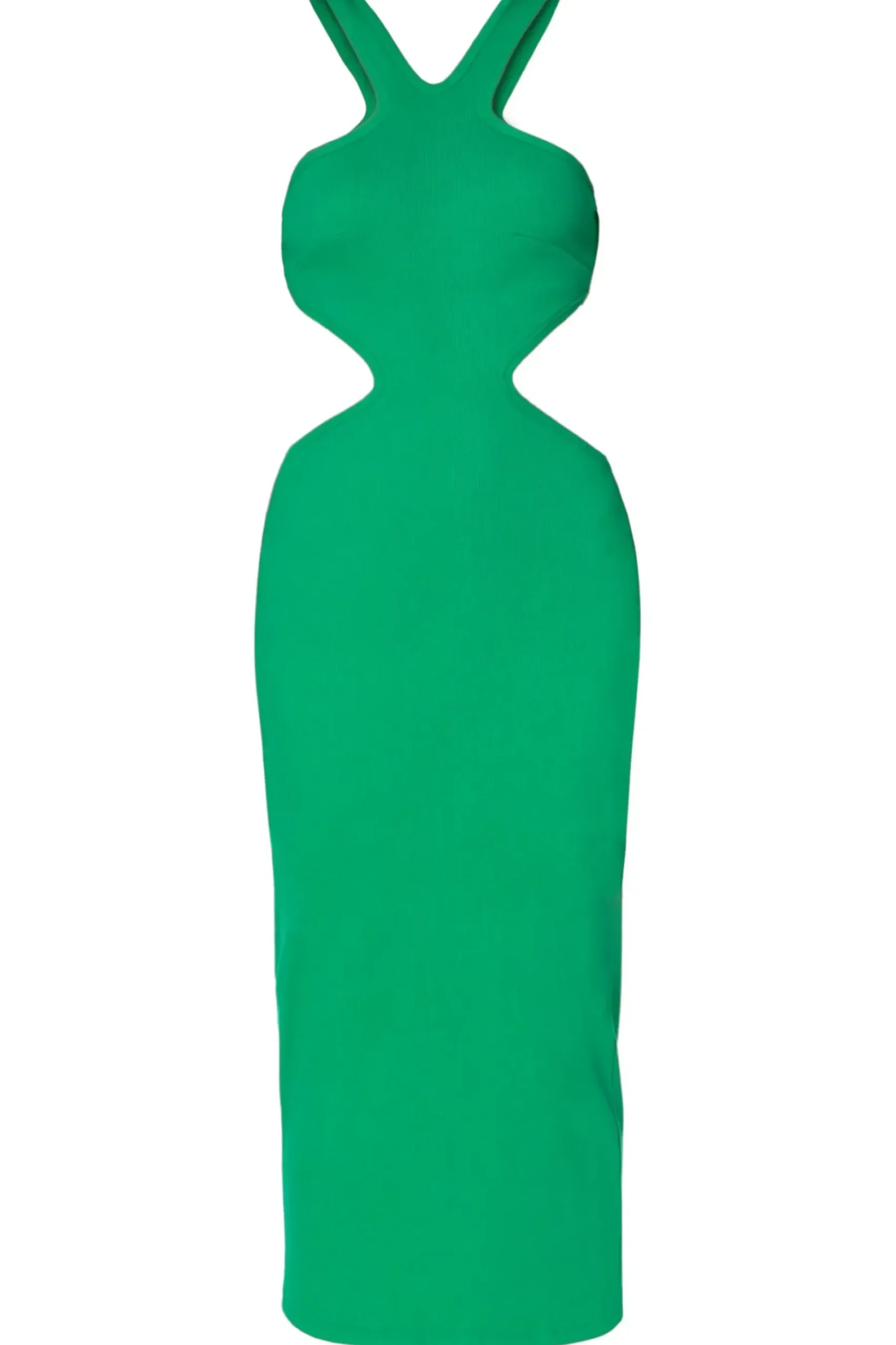 Dopasowana Sukienka Midi Ze Zmyslowymi Wycieciami Eksponujacymi Linie Ramion I Talie. Uszyta Z Prazkowanej Bawelny Z Dodatkiem Elastanu W Energetycznym Odcieniu Brazylijskiej Zieleni. Nos Ja Wieczorowo Z Mocniejsza Bizuteria I Sandalami Na Obcasie Lub Codziennie Zestawiajac Z Klapkami Typu Birkenstock.